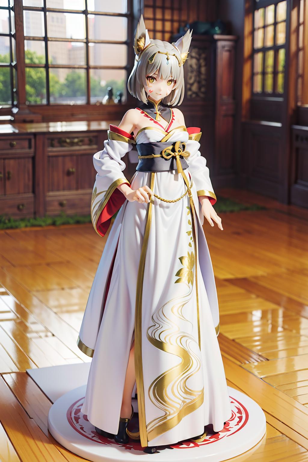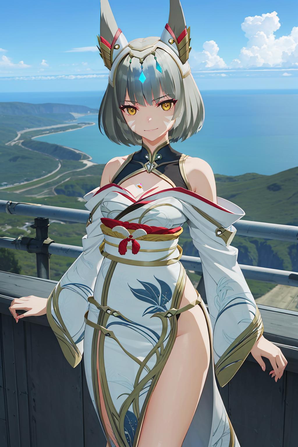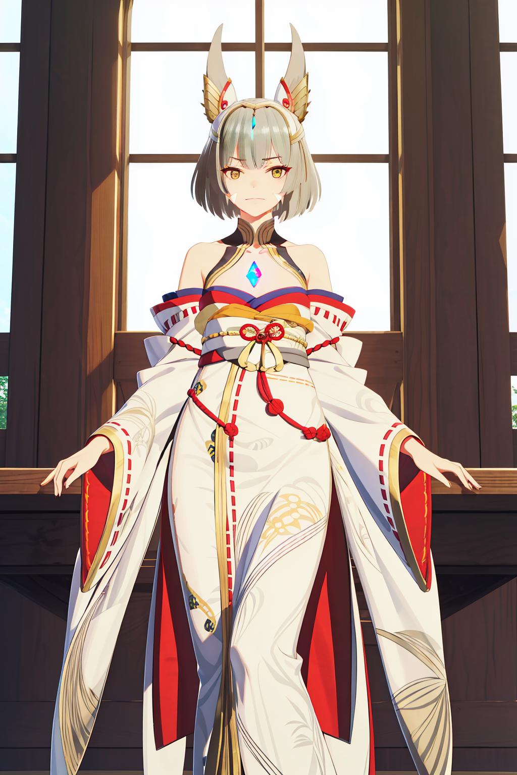 niaqueen,1girl,short hair,grey hair,blunt bangs,gold trim high cat ears,white facial mark,yellow eyes||black halterneck high collar,chest blue red jewel,gold trim flower print white kimono,small breasts,bare shoulders,long white wide sleeves,