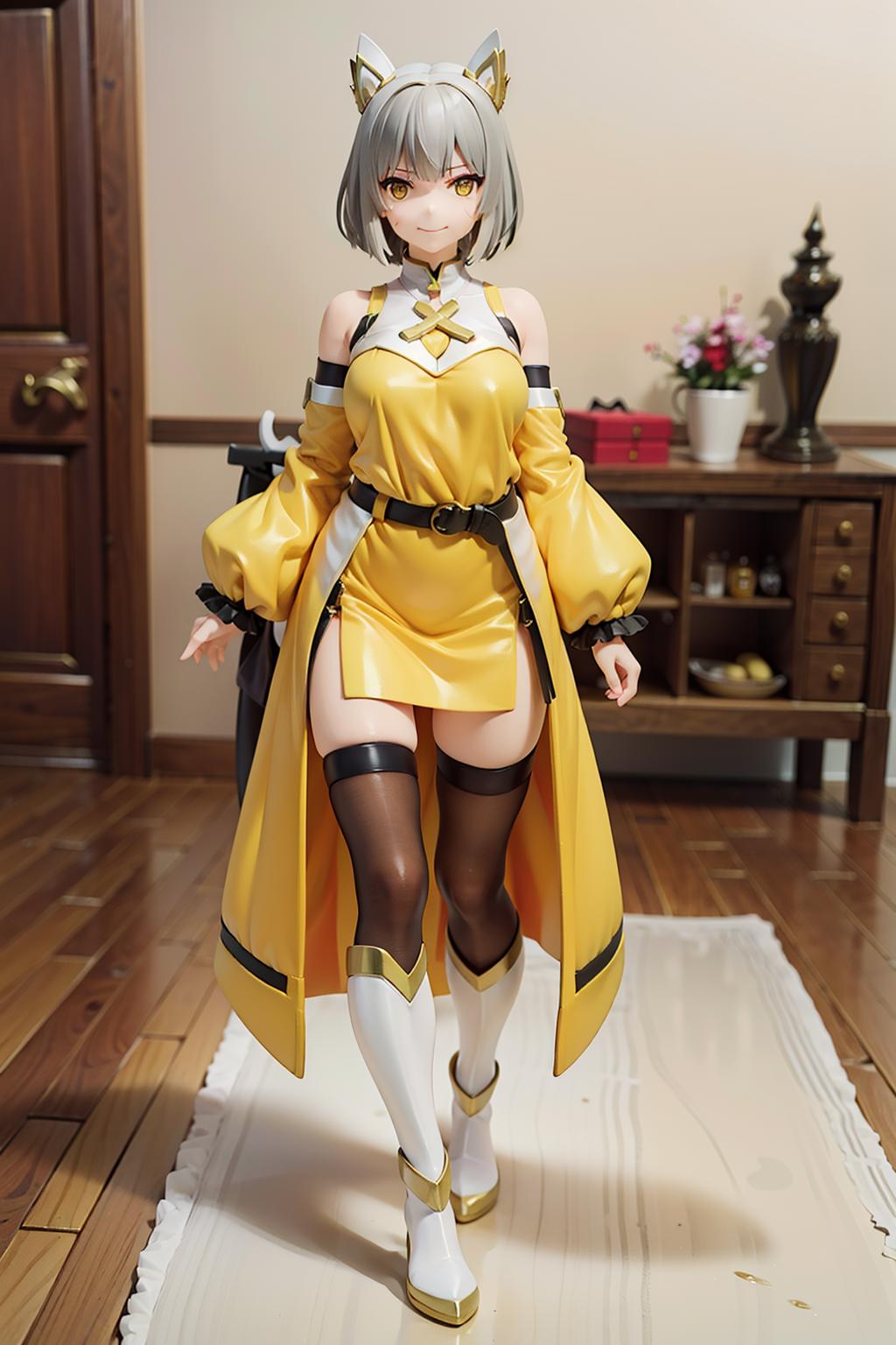 niaglowup,1girl,short hair,grey hair,blunt bangs,gold trim high cat ears,white facial mark,yellow eyes||white halterneck high collar,yellow white bodysuit,yellow detached sleeves,yellow detached sleeves and black gauntlets,black belt,black pantyhose,red trim white boots