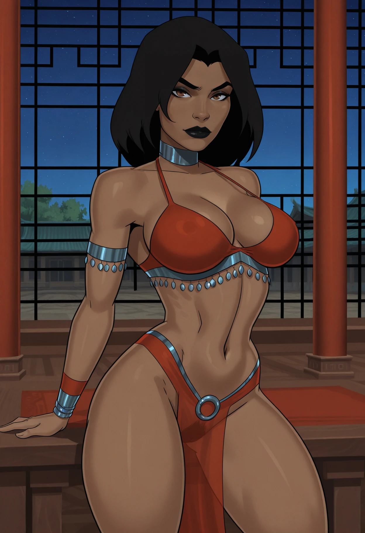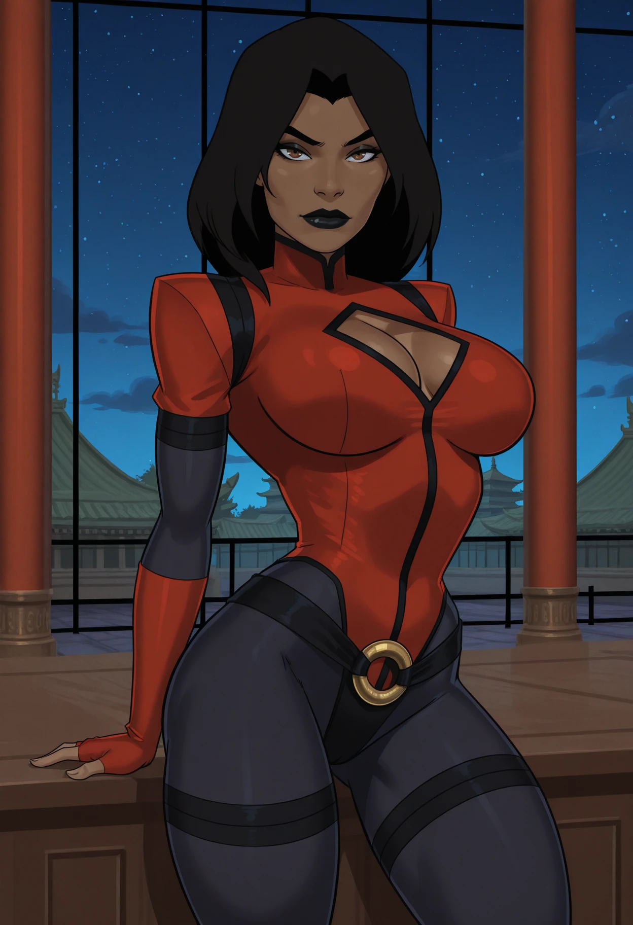 1girl, solo, dark skin, dark-skinned female, brown eyes, black hair, medium hair, breasts, large breasts, lipstick, black lips,main outfit tags: