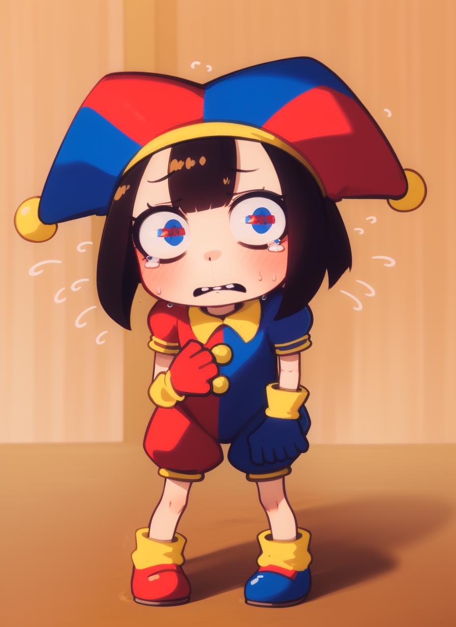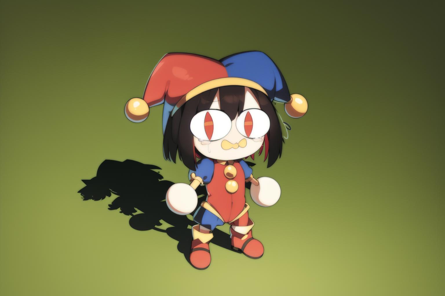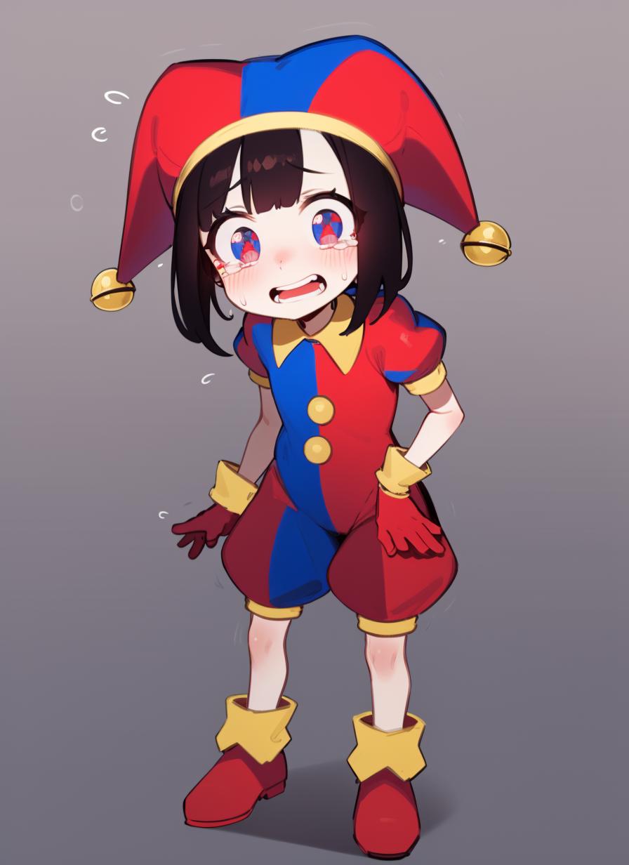 black hair, blue eyes, blue footwear, blue gloves, flying sweatdrops, gloves, hanenosaki, hat, hat bell, highres, jester, jester cap, multicolored clothes, multicolored eyes, multicolored headwear, pomni (the amazing digital circus), red eyes, red footwear, red gloves, solo, standing, sweatdrop, tearing up, <lora:Pomni_civit:1>