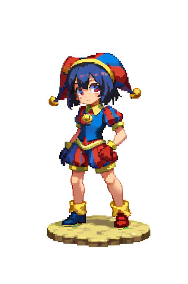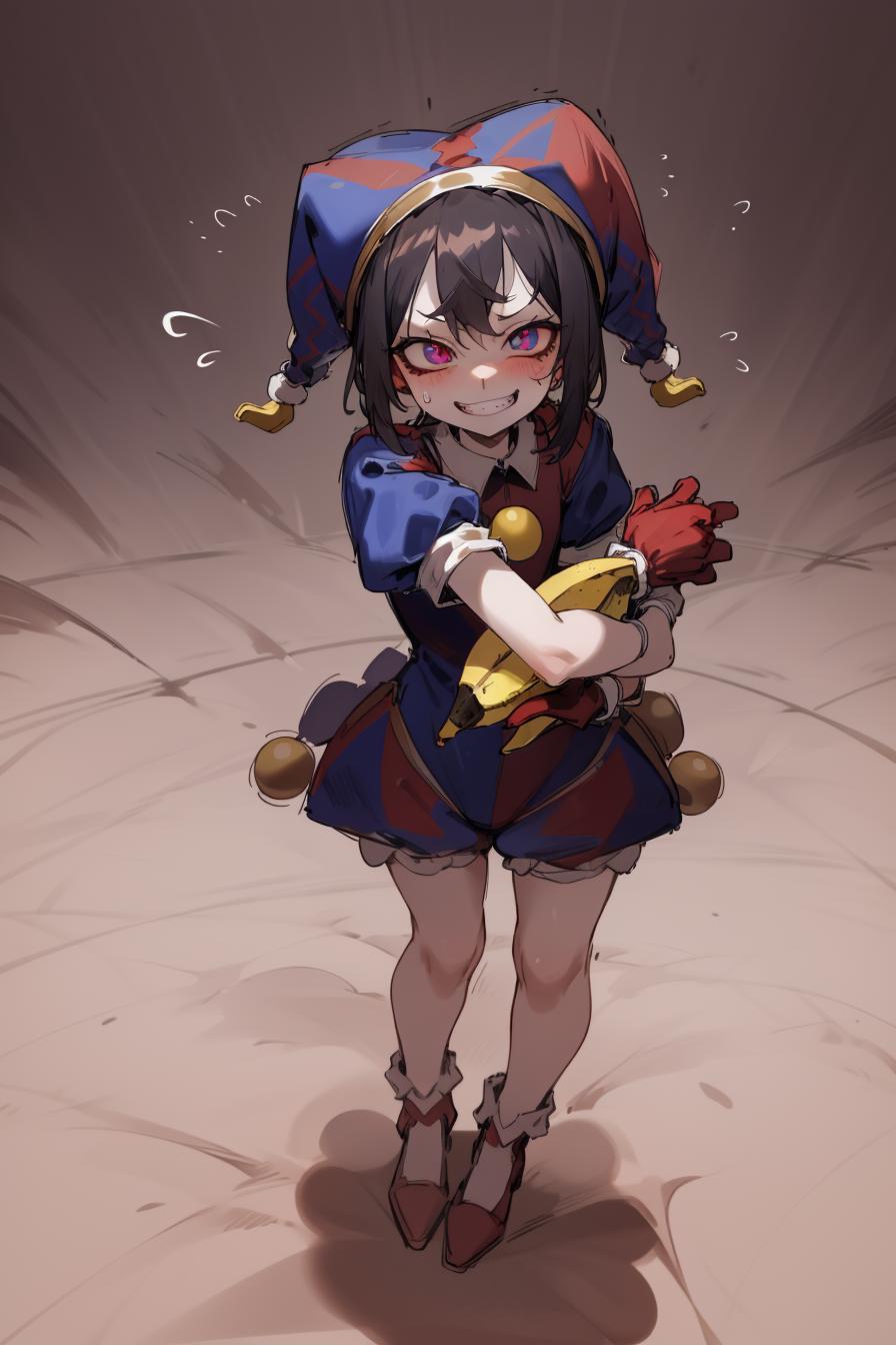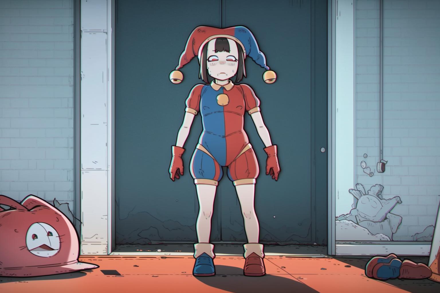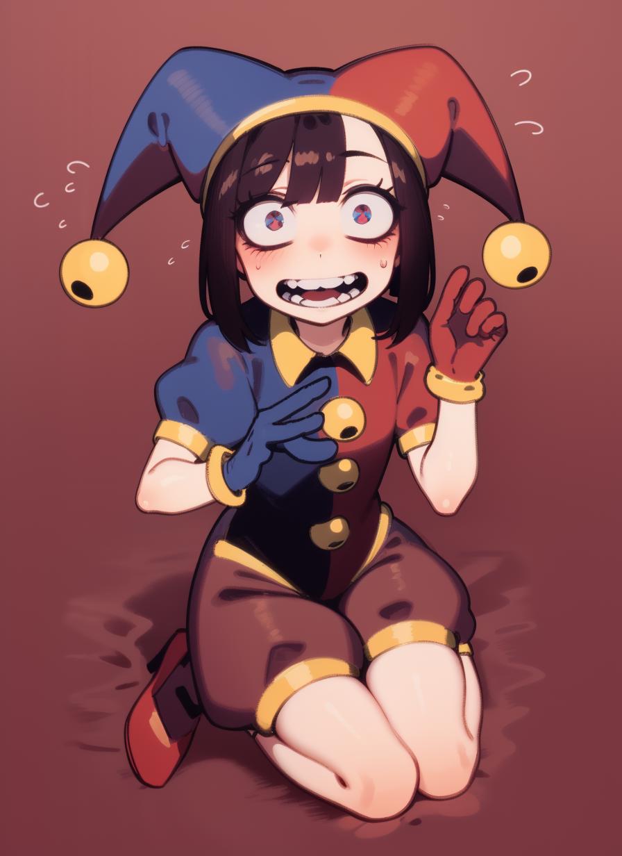 black hair, blue eyes, blue footwear, blue gloves, flying sweatdrops, gloves, hanenosaki, hat, hat bell, highres, jester, jester cap, multicolored clothes, multicolored eyes, multicolored headwear, pomni (the amazing digital circus), red eyes, red footwear, red gloves, solo, standing, sweatdrop, tearing up, <lora:Pomni_civit:1>