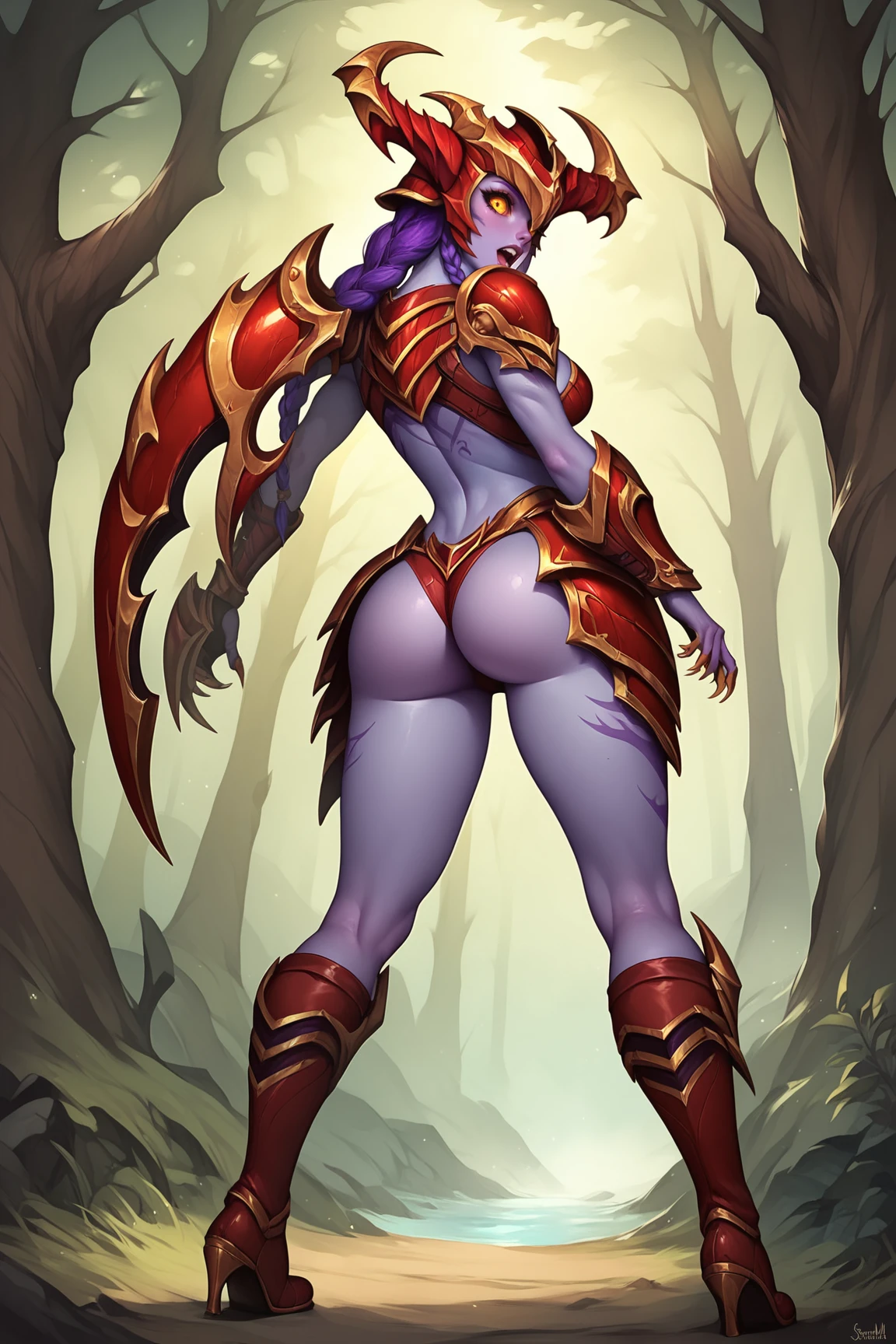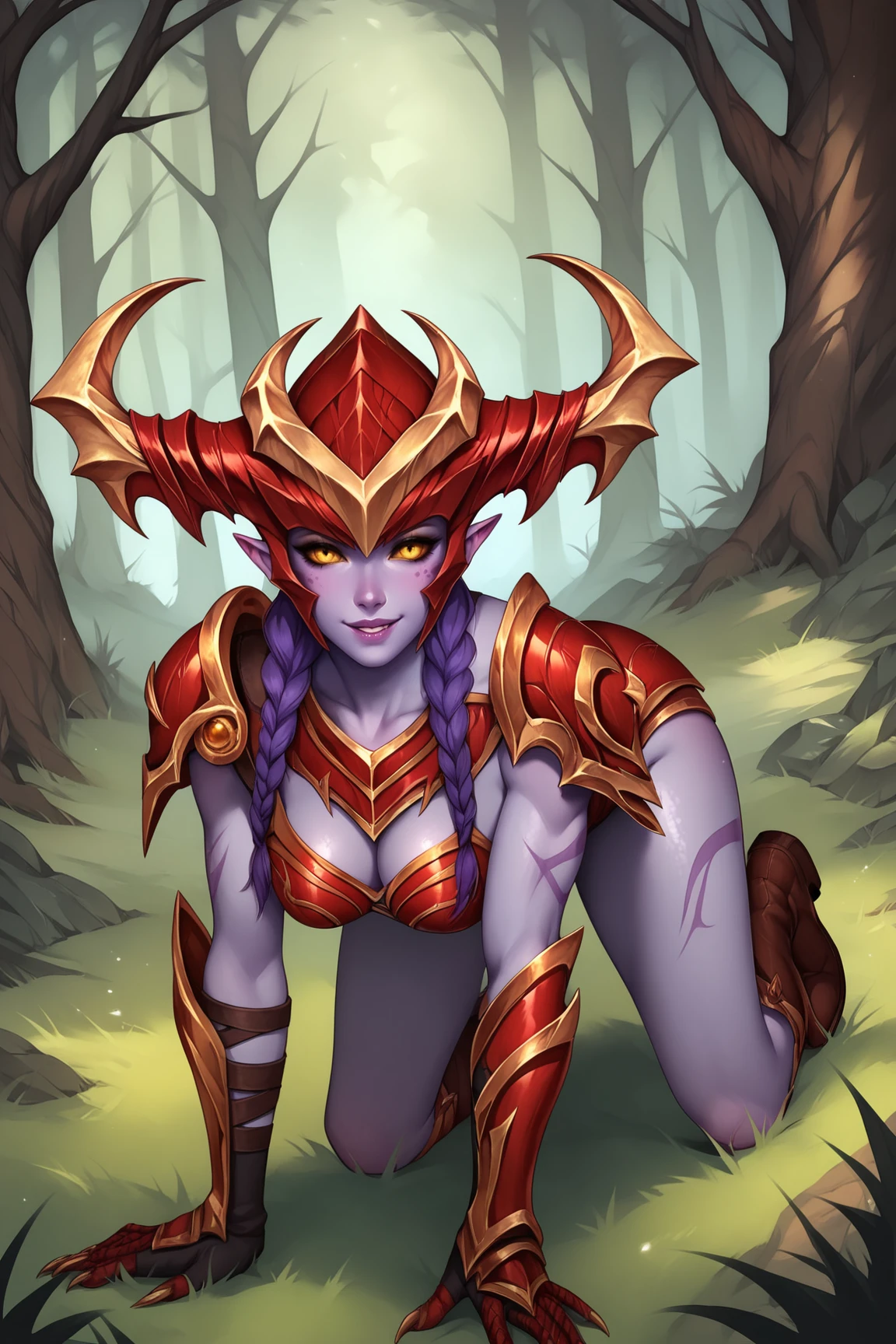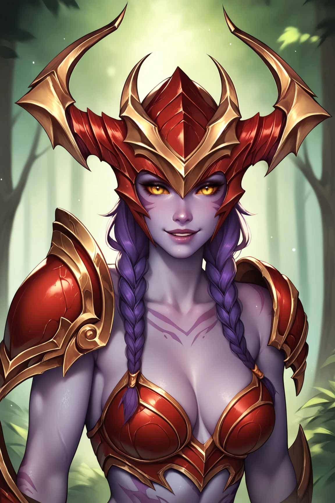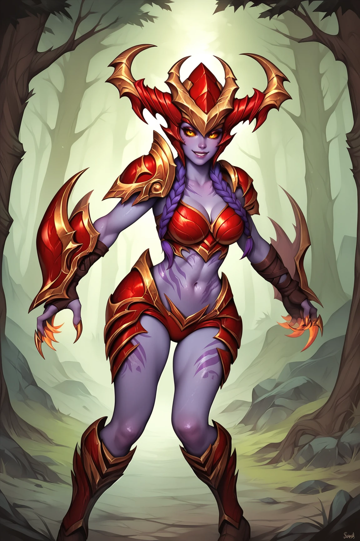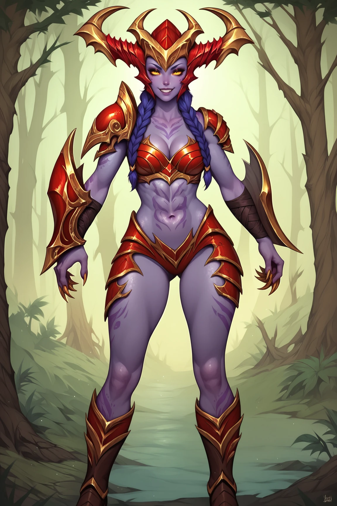 ShyvanaLoLXL, (hidden ears on helmet:1.3), yellow eyes, colored sclera,purple twin braids, red helmet, horns, purple skin, colored skin, medium breasts, monster girl, shoulders armor, red armor, hips armor, guantlets, claws, boots