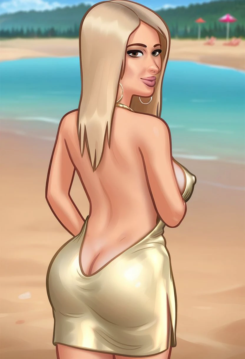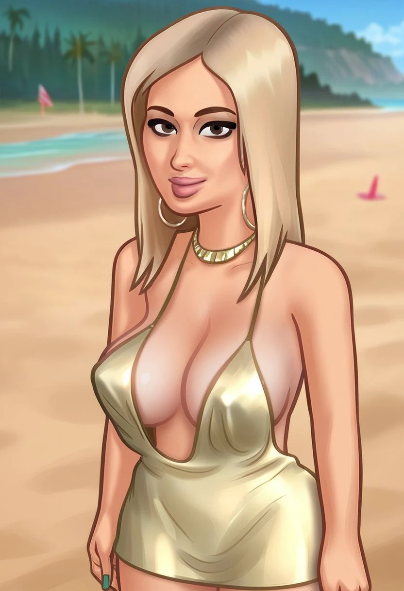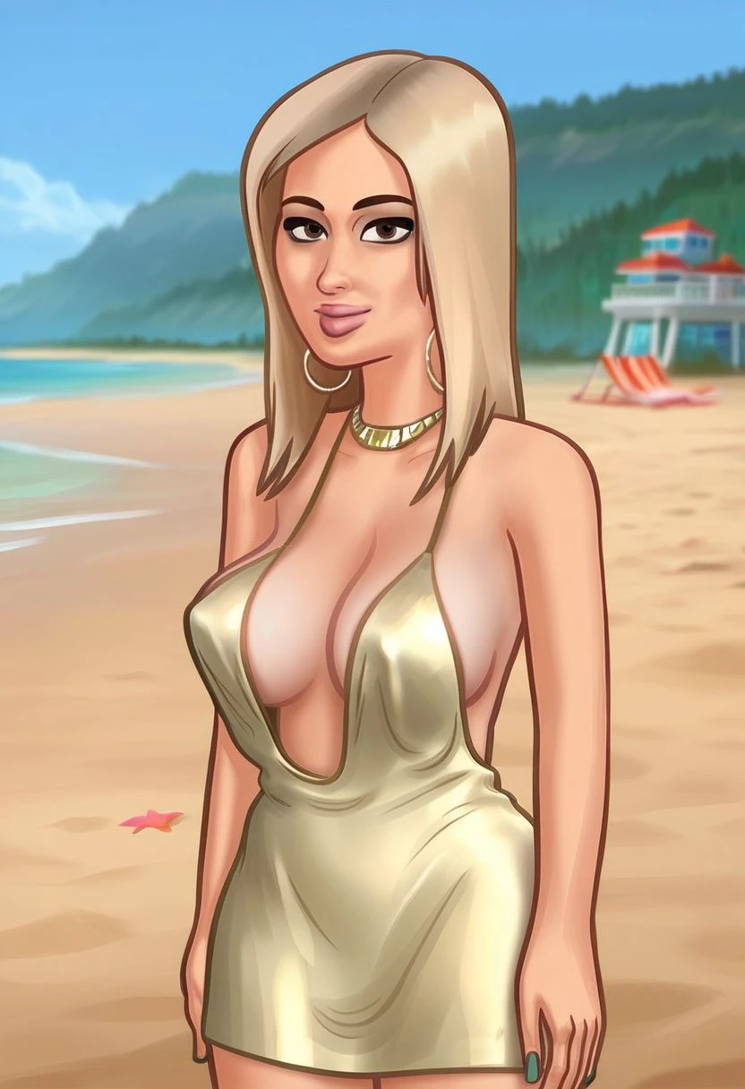 gold dress, no bra, cleavage, plunging neckline, sideboob, covered nipples