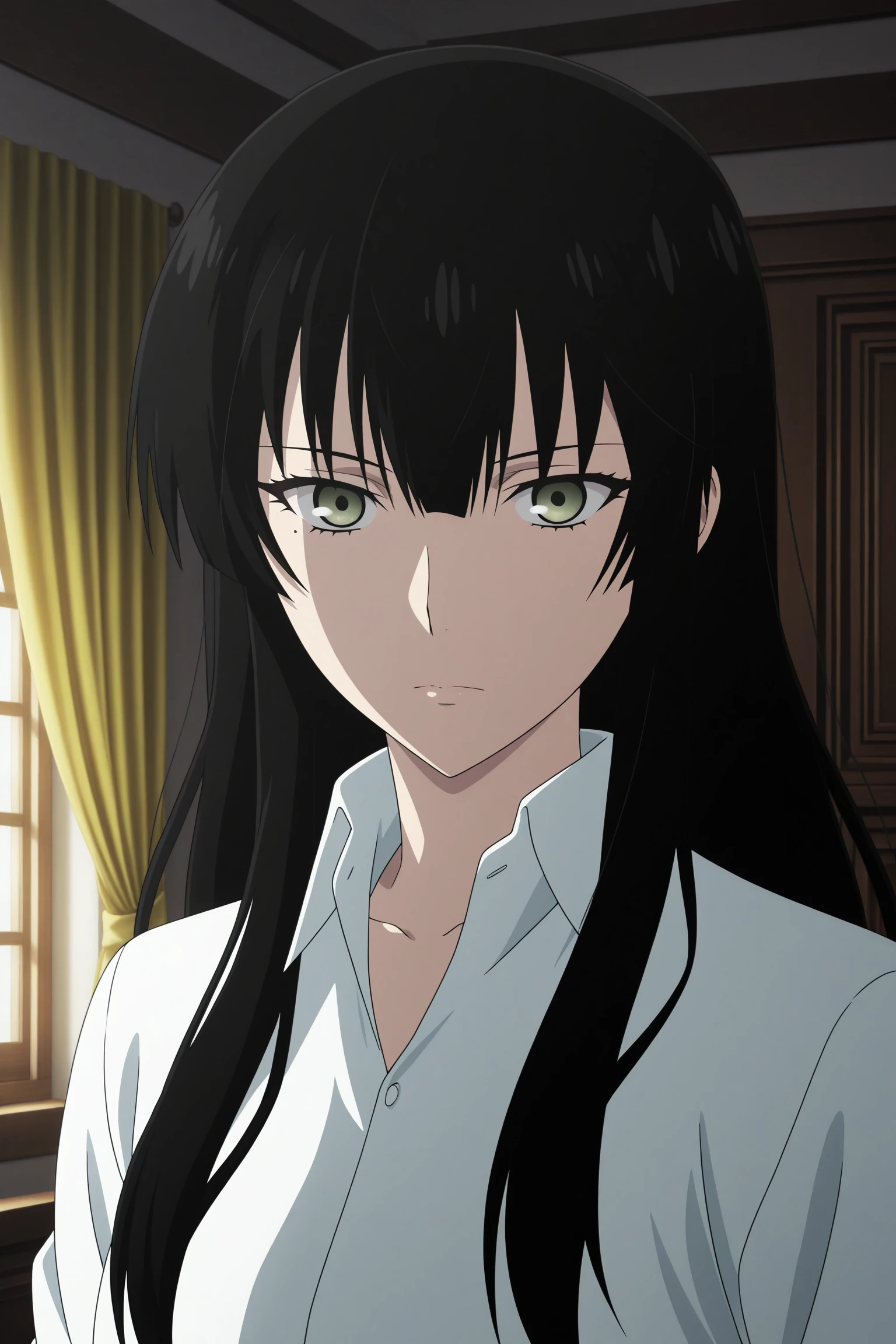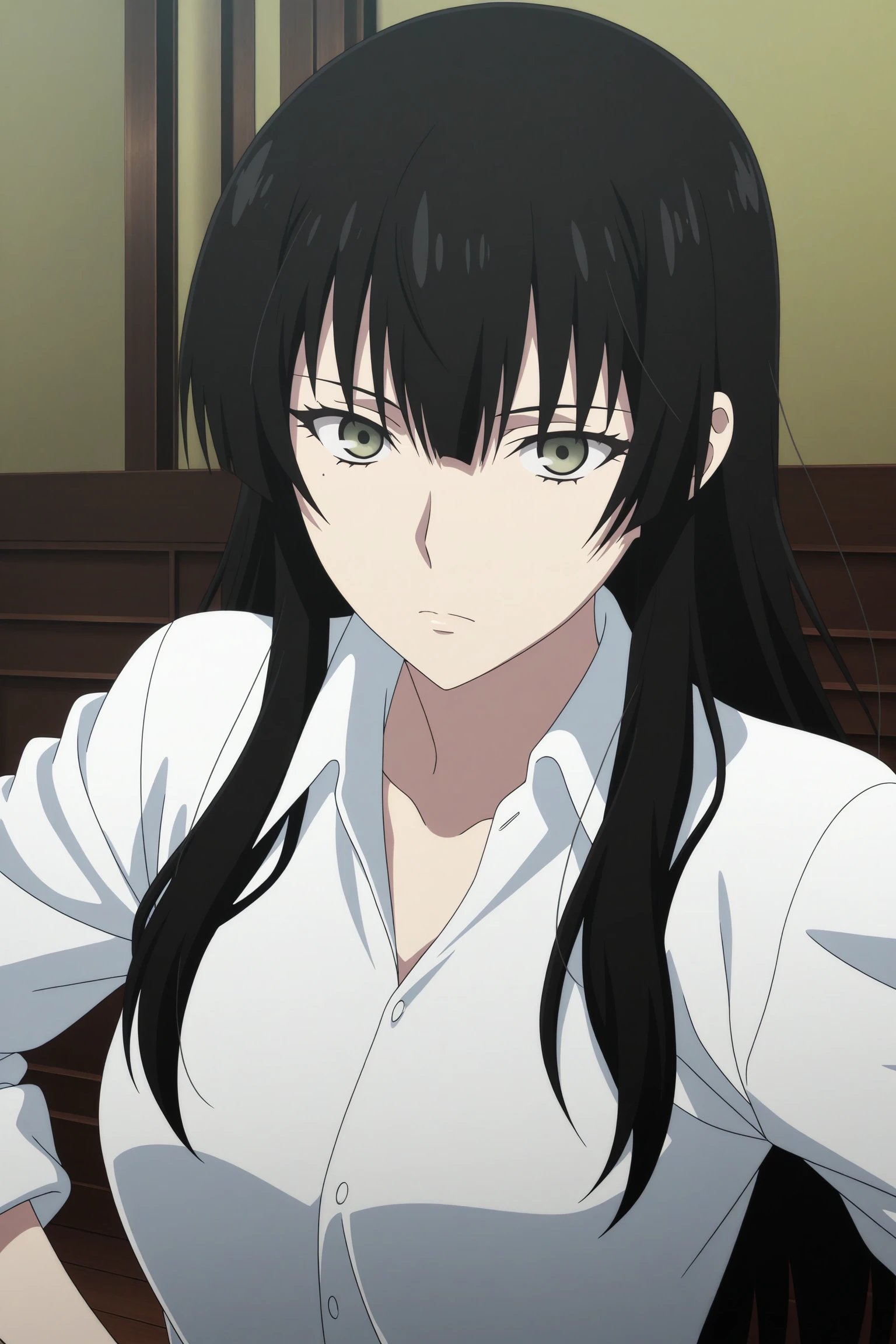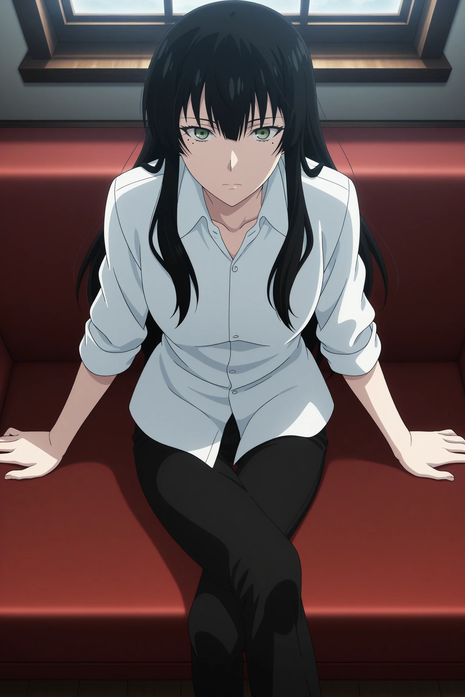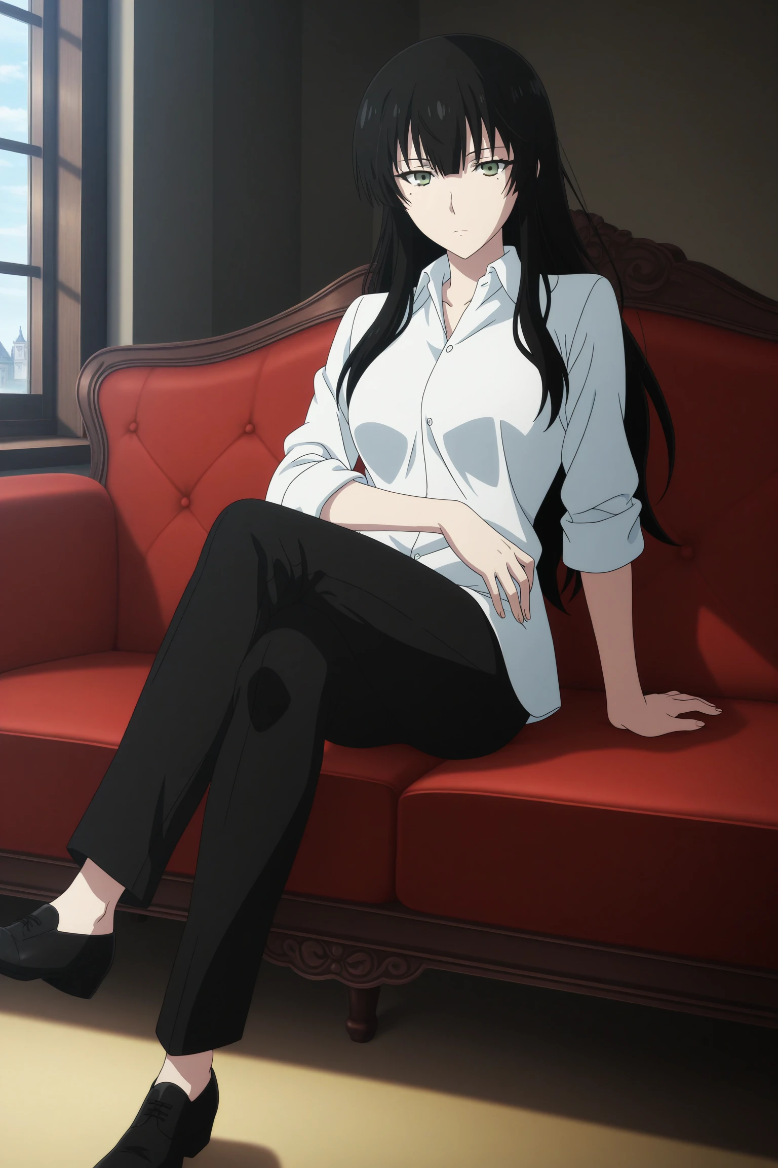 kujou sakurako, long hair, black hair, hime cut, green eyes, mole under eye, white shirt, collared shirt, sleeves rolled up, untucked shirt, black pants, black footwear, dress shoes