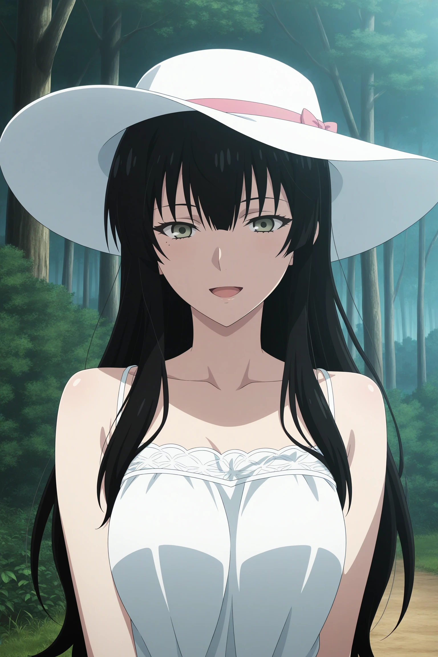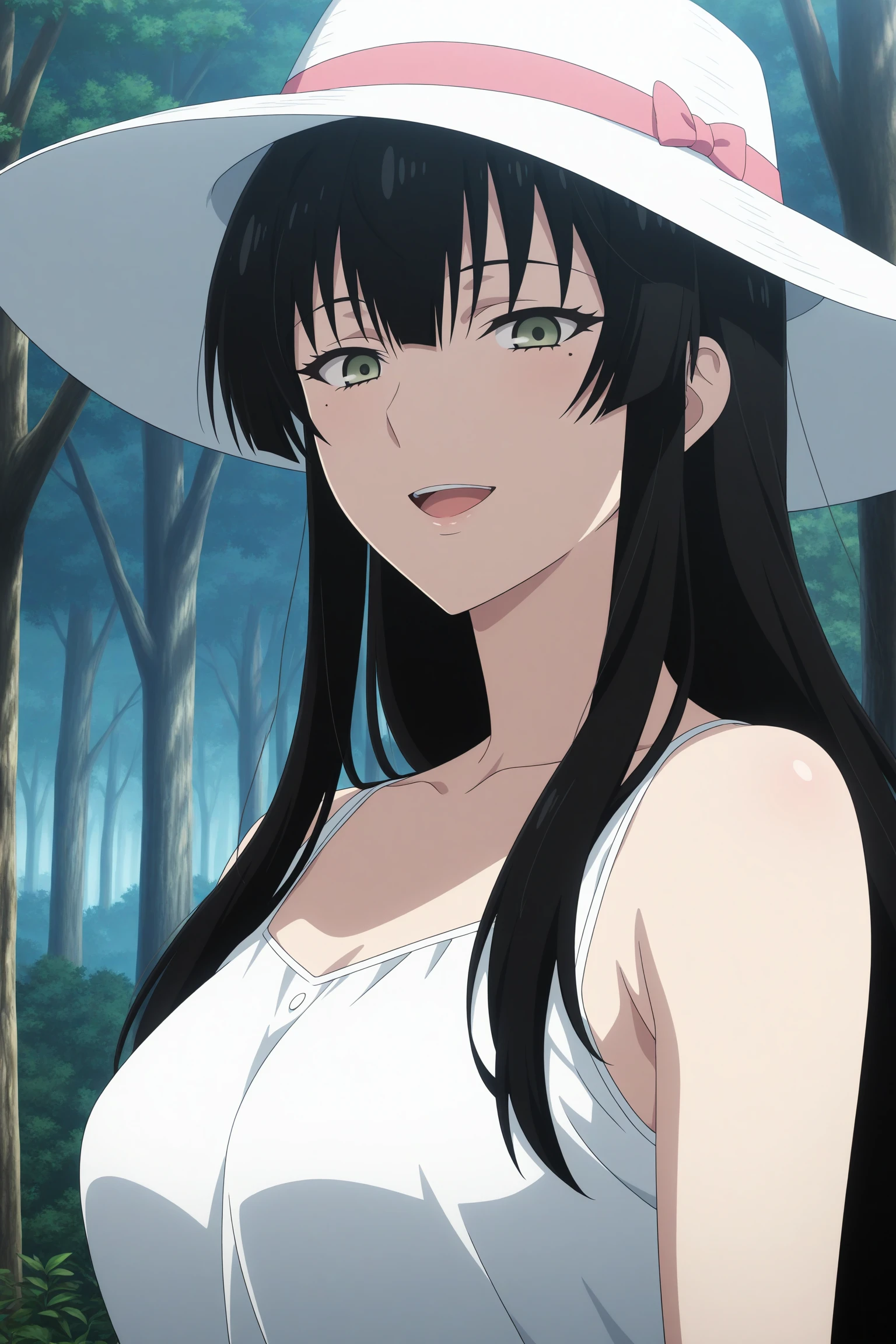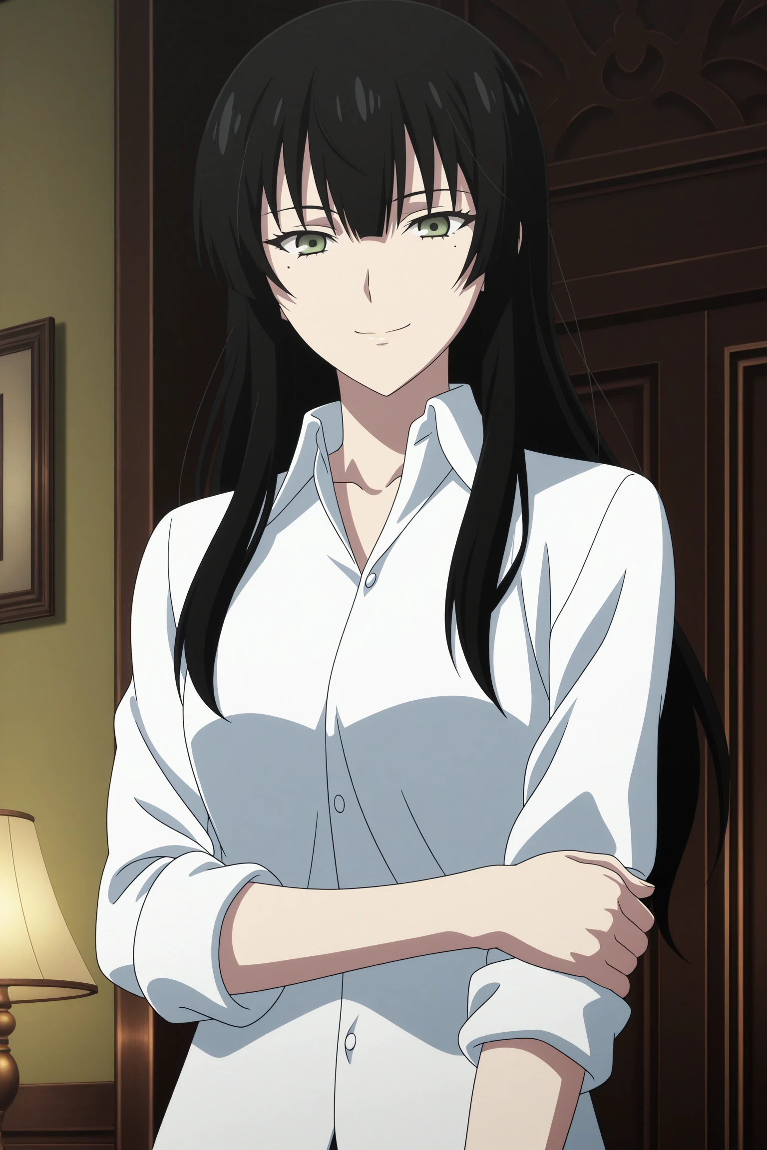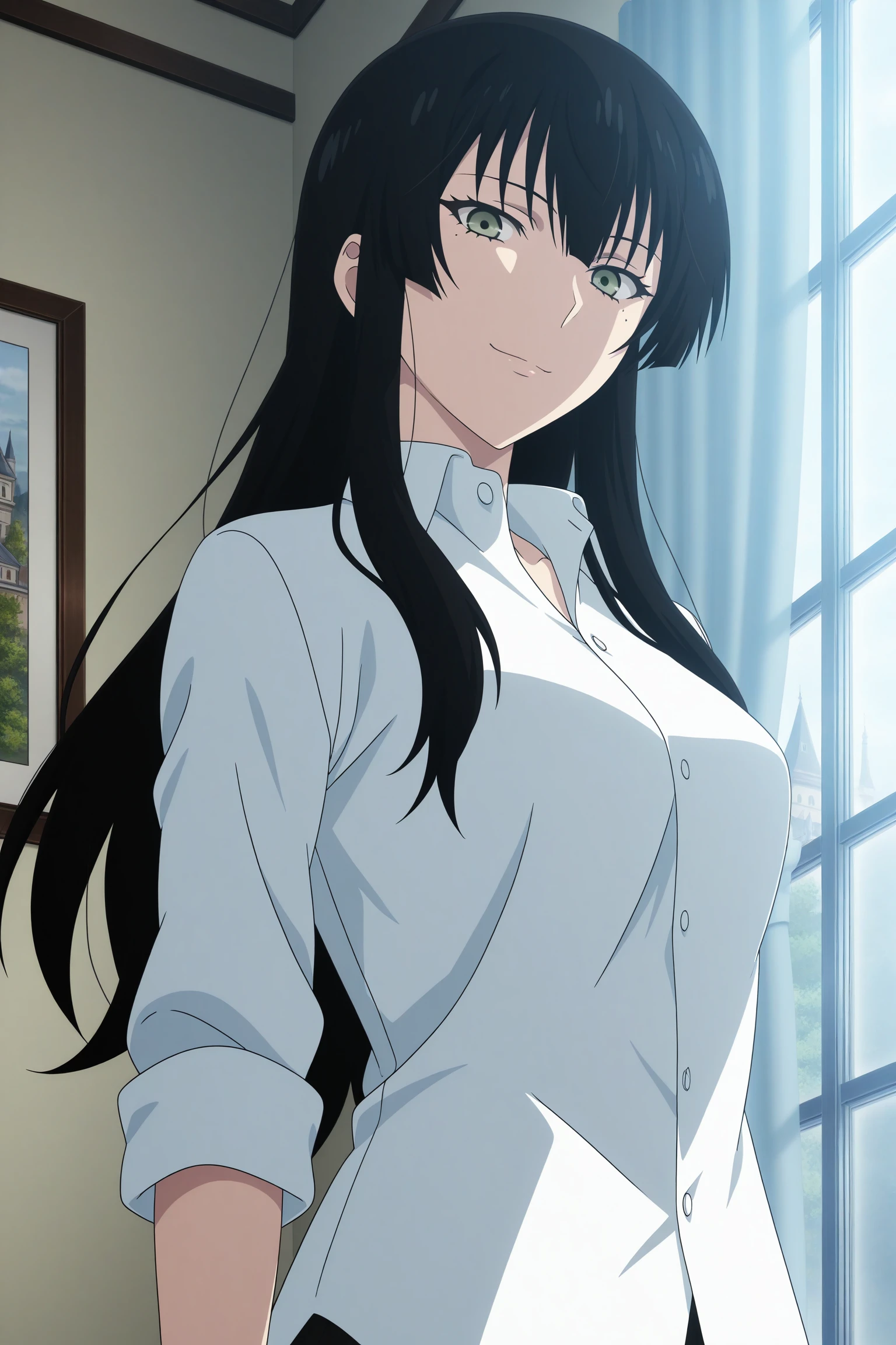 kujou sakurako, long hair, black hair, hime cut, green eyes, mole under eye, white shirt, collared shirt, sleeves rolled up, untucked shirt, black pants, black footwear, dress shoes