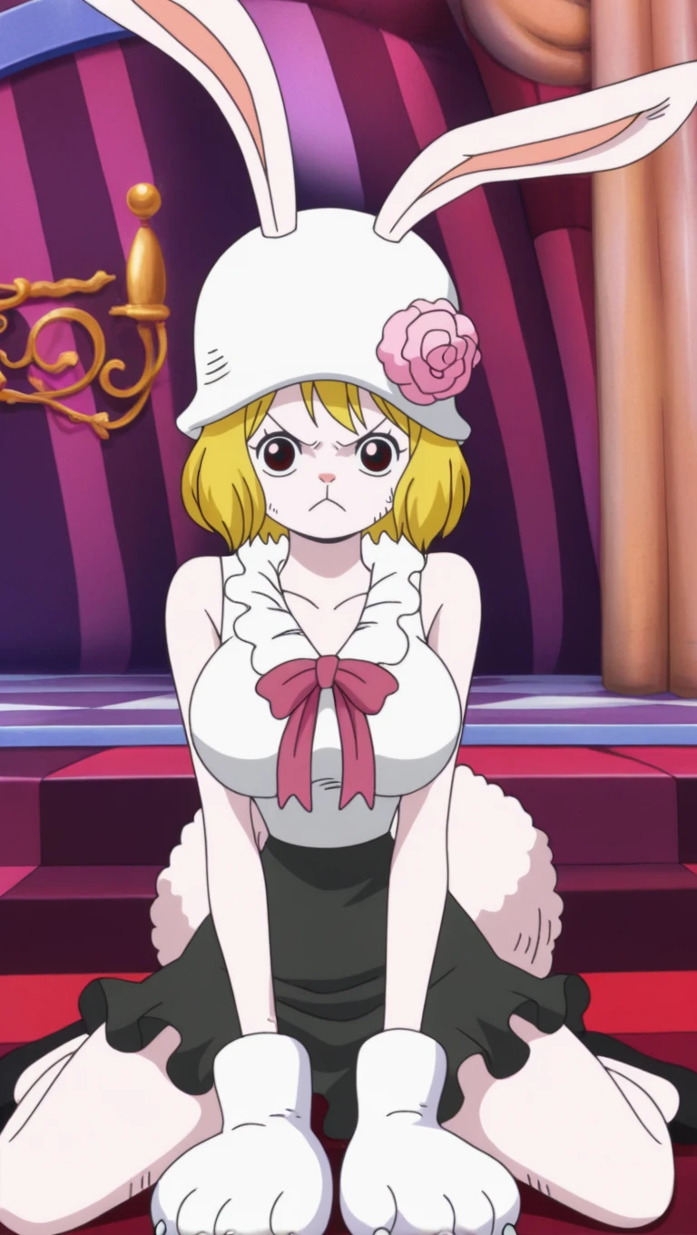 wci end, short hair, white sleeveless shirt, black frilled skirt, pink ribbon, white hat, pink hat flower, paw gloves, black mary janes, rabbit ears, rabbit tail, post style, large breasts,