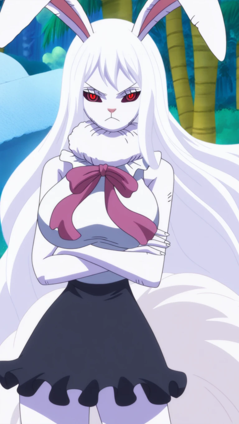 wci su10ng, alternate red eyes, colored sclera, long white hair, white sleeveless shirt, pink ribbon, black frilled skirt, black mary janes, long fur tail, rabbit ears, post style, large breasts,