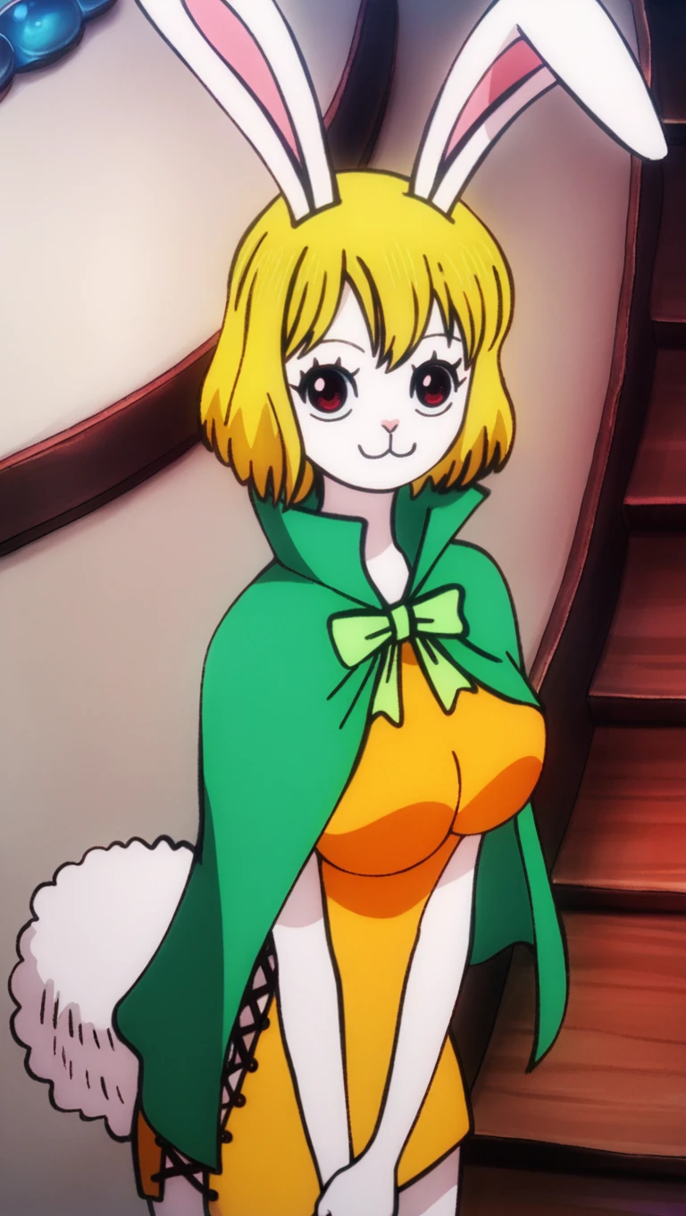 z0u, short hair, green capelet, light green ribbon, orange cross-laced dress, rabbit ears, rabbit tail, brown high heel boots, post style, medium breasts,