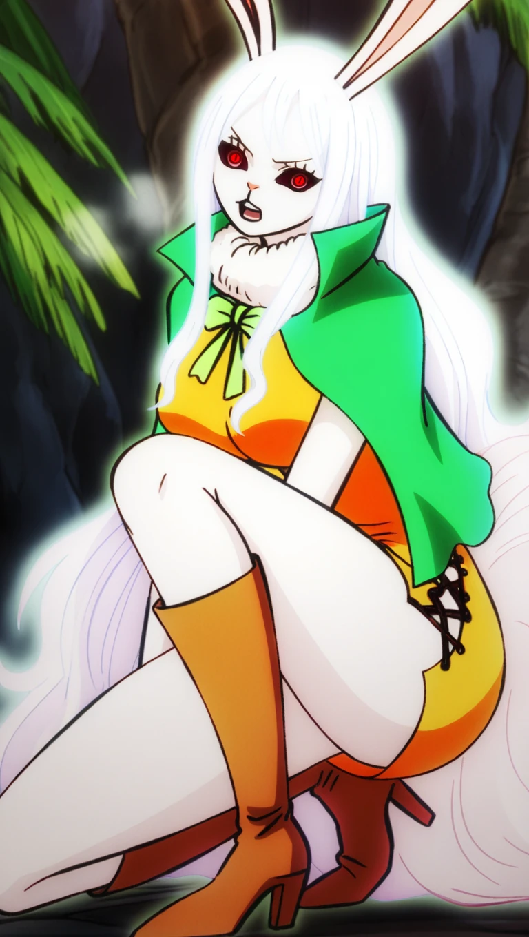 su10ng w4n0, alternate red eyes, colored sclera, long white hair, green capelet, orange cross-laced dress, brown high heel boots, light green ribbon, long fur tail, rabbit ears, w4no style, large breasts,