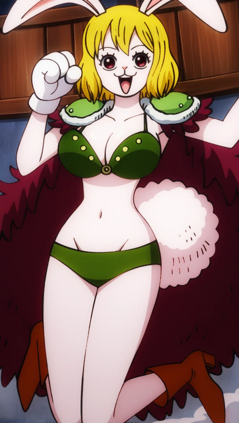 b34st p1r4t3s, short hair, green o-ring bikini top, green bikini bottom, green pauldrons, dark red fur cape, white gloves, brown high heel boots, rabbit ears, rabbit tail, w4no style, large breasts, cleavage, navel, groin,