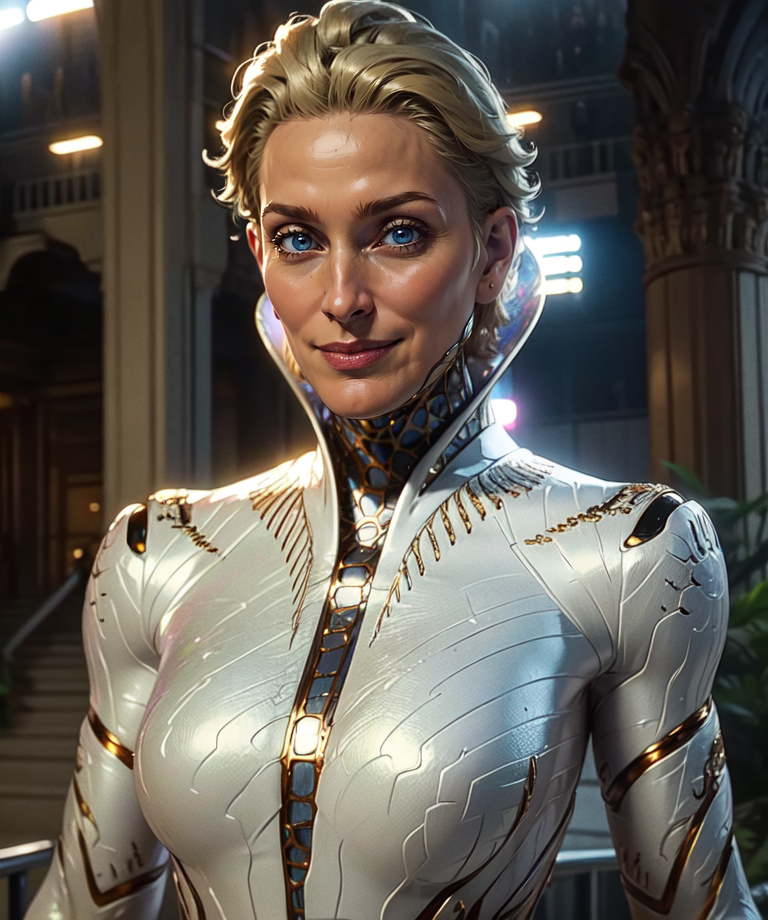 • her neck brace, may naturally appear regardless of attire, - it may require to be weighted to remove, and adding white bodysuit, science fiction, in NEG also, may help as well