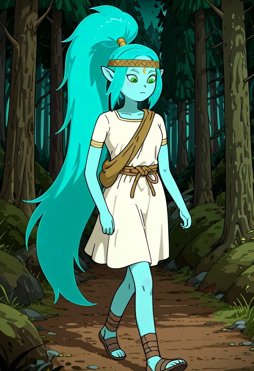 canyonadventure, colored skin, green eyes, pointed ears, blue skin, very long hair,blue hair, aqua hair, jewel on the forehead