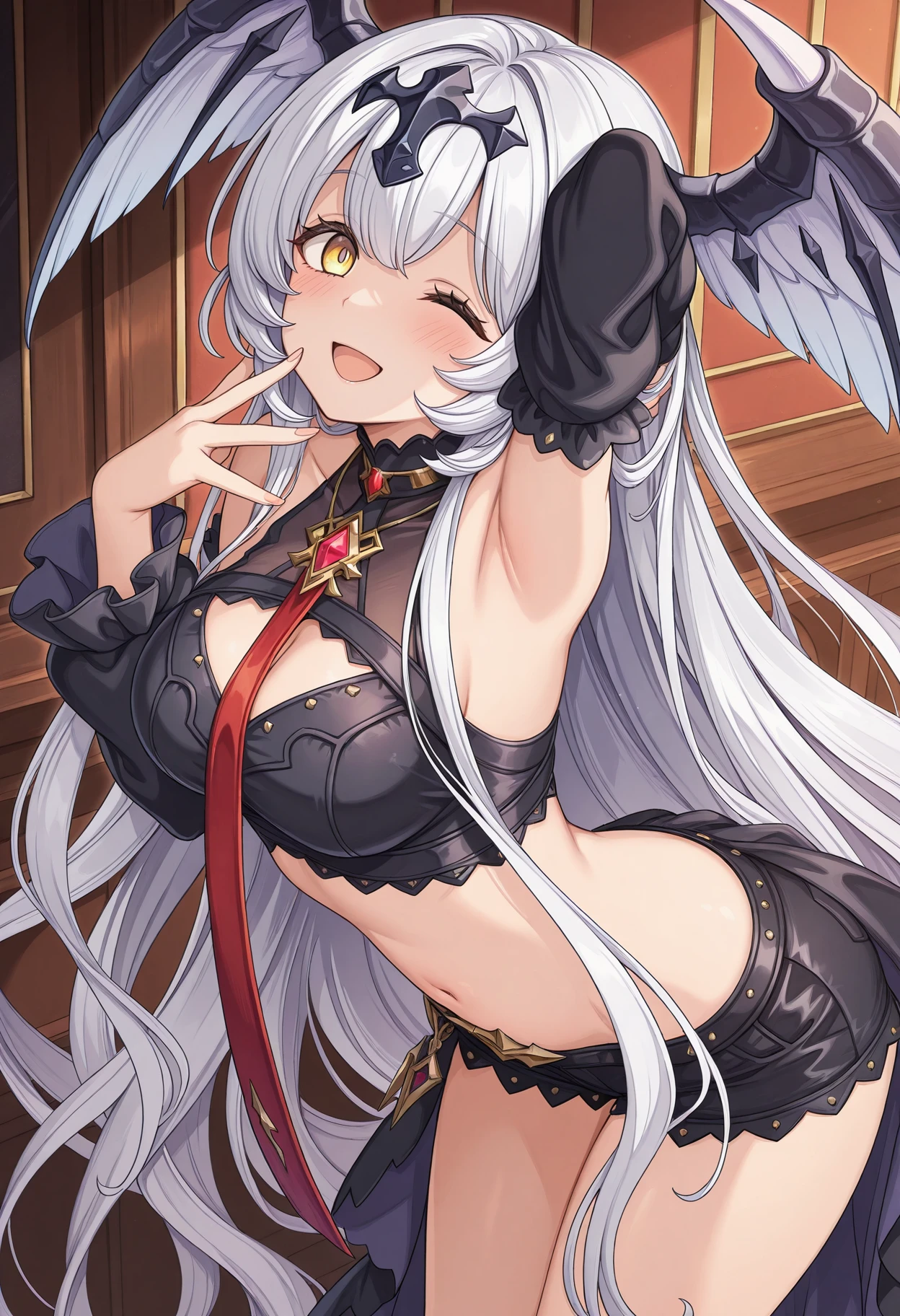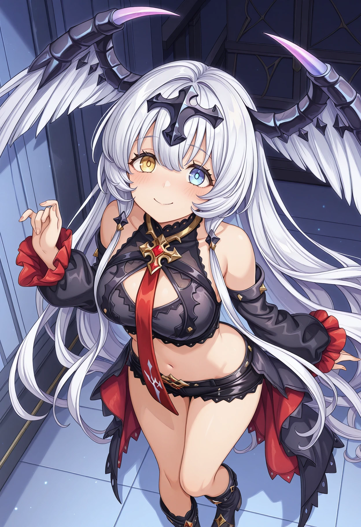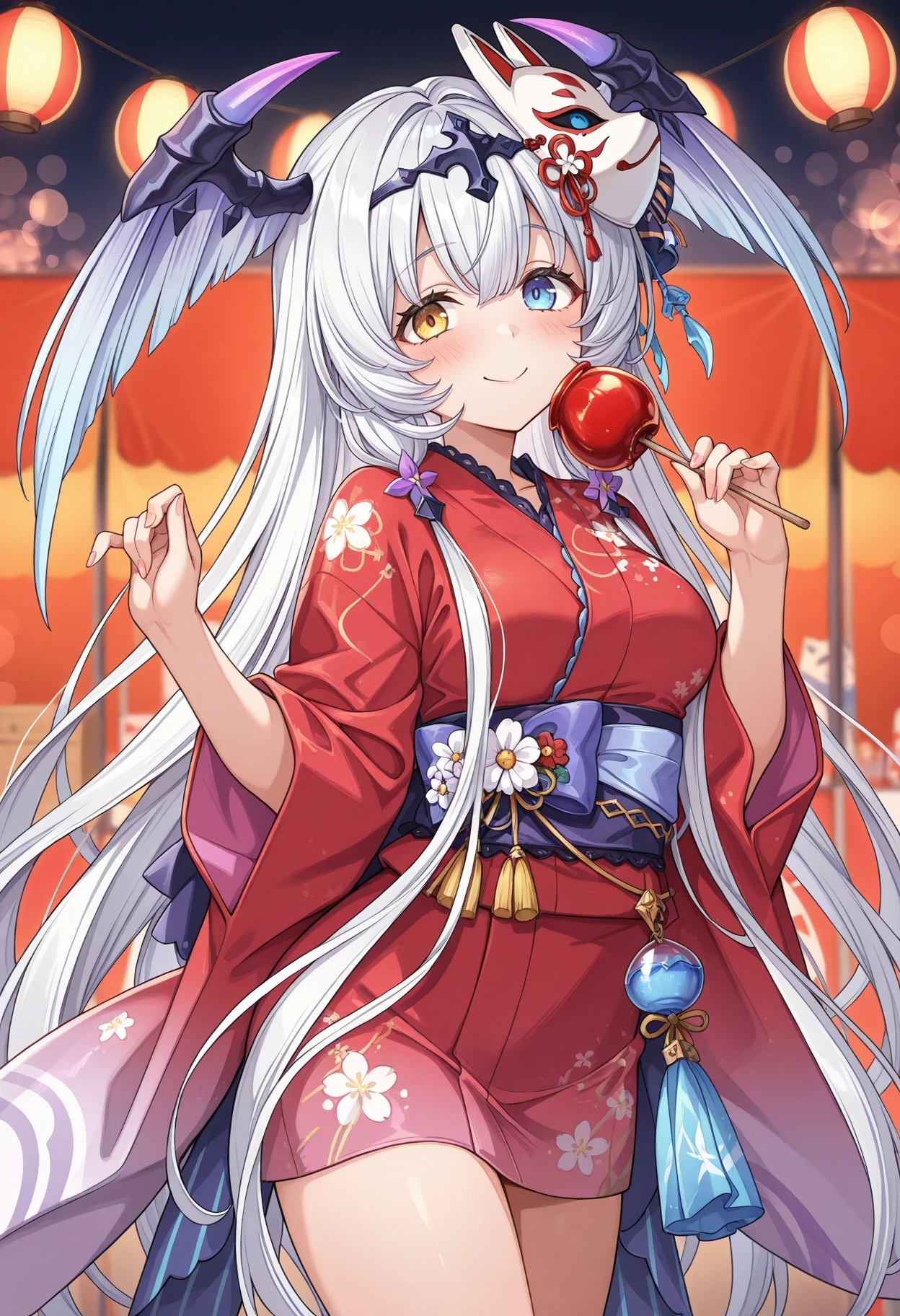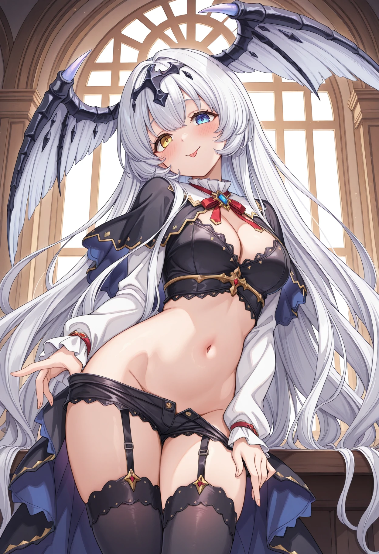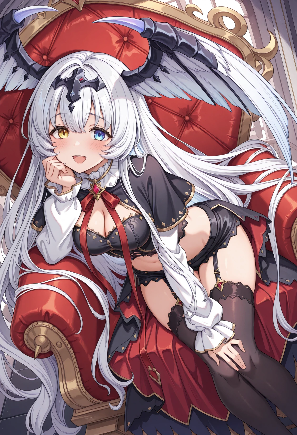 kmheredf, very long hair, white hair, heterochromia, yellow eyes, blue eyes, headpiece, head wings, dragon wings, demon horns, long horns, medium breasts,