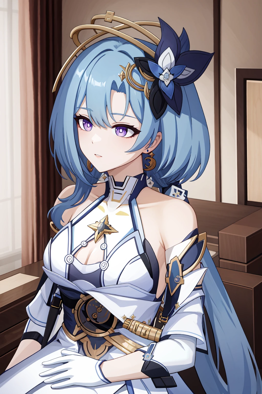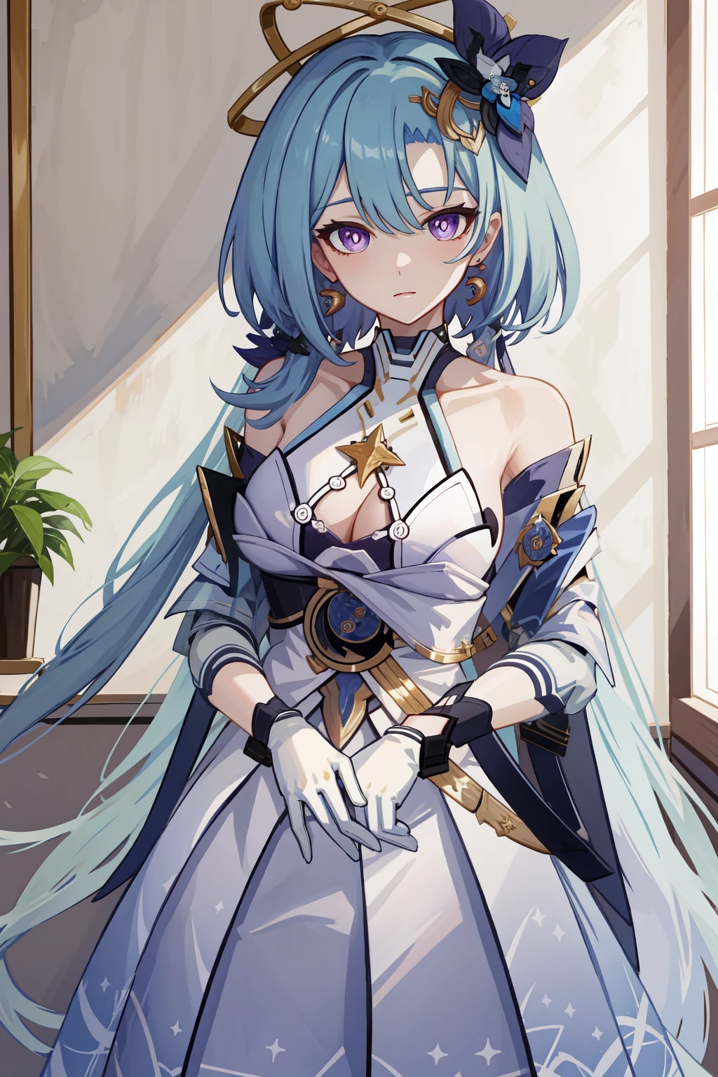 griseo honkai3rd,purple eyes,hair ornament,blue hair,bangs,breasts,long hair,bare shoulders,reg,gloves,dress,white gloves,jewelry,white dress,earrings,clothing cutout,indoors,