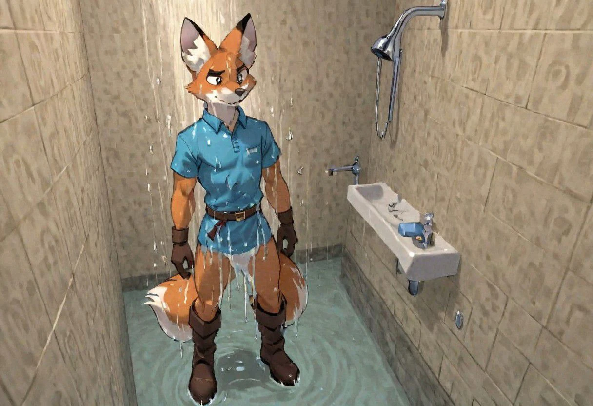 solo, male focus, Anthro fox, dark brown eyes, thick black eyebrows, long fox tail, clothing (blue tunic, brown belt, brown gloves, brown boots, light lime green pants)