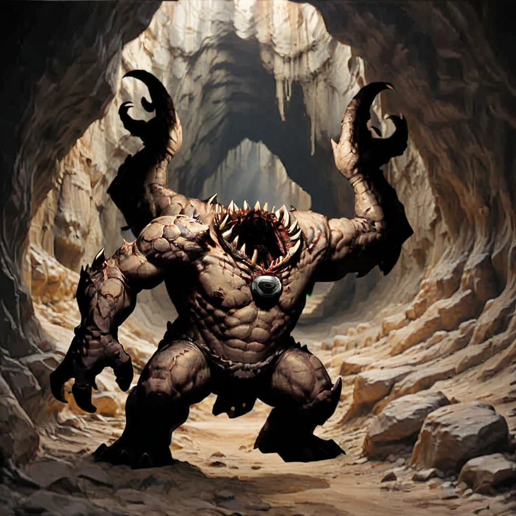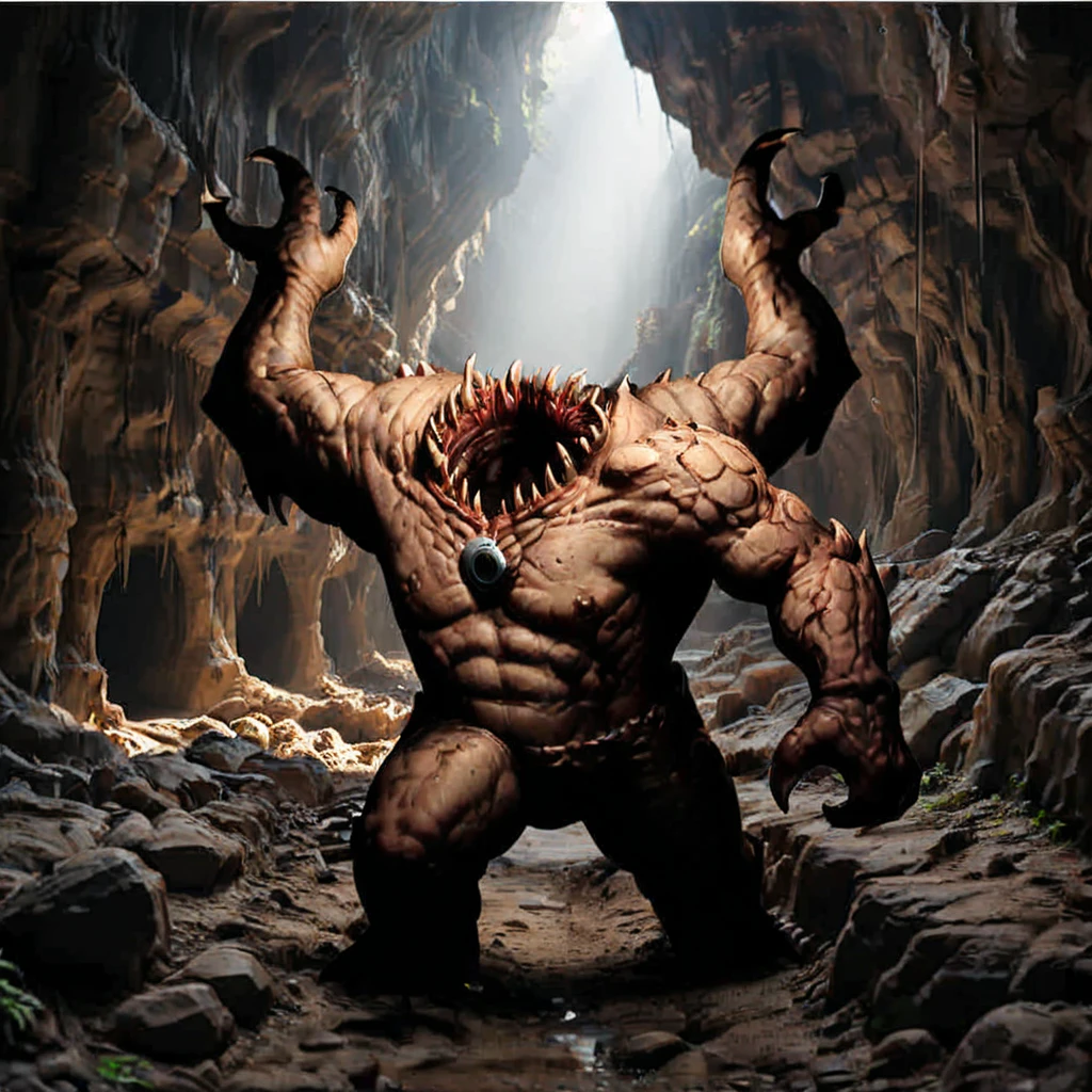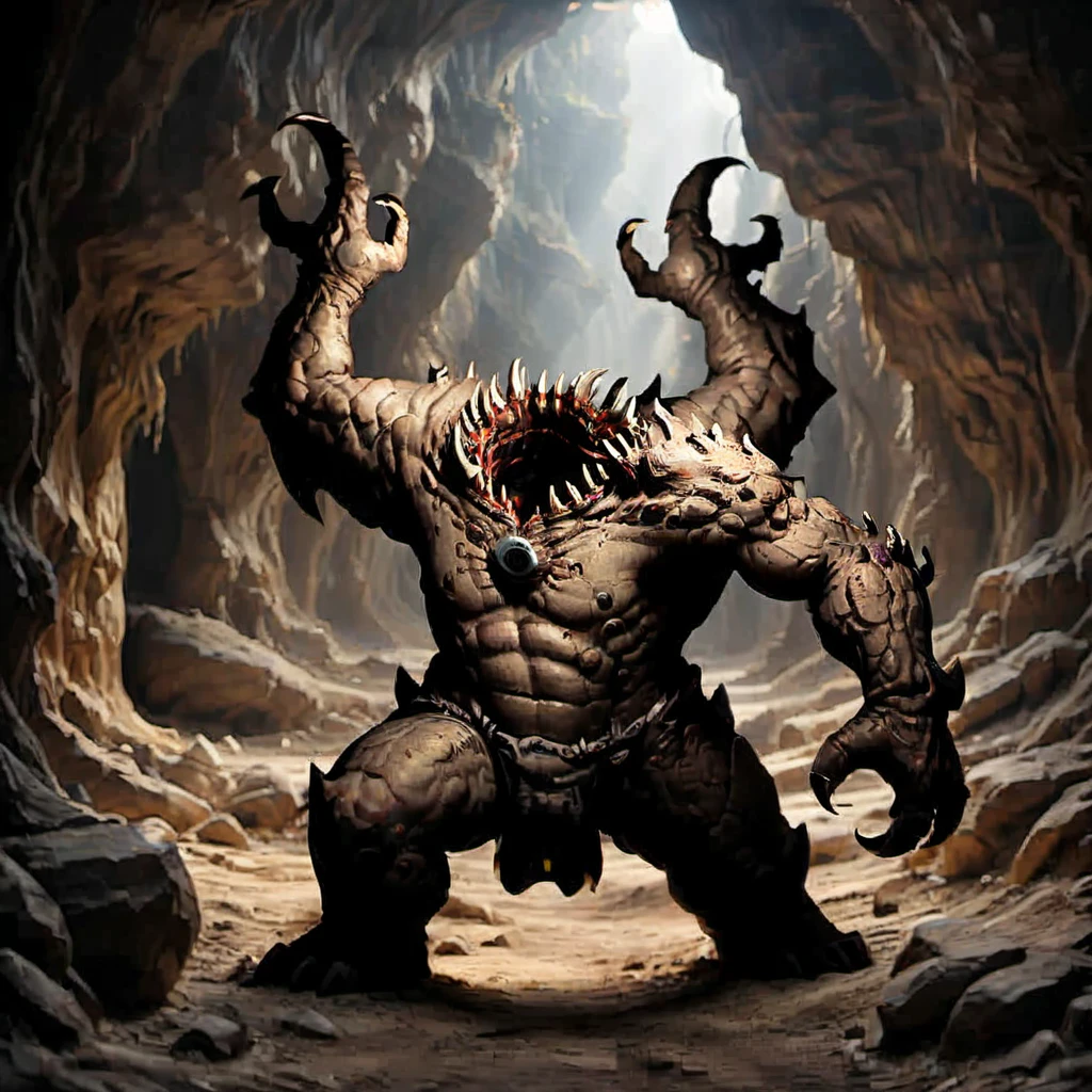 1other, 3 arms, blue sky, cave, claws, cloud, cloudy sky, day, full body, multiple arms, muscular, no humans, open mouth, outdoors, rock, ruins, scales, sharp teeth, simple background, sky, solo, spikes, standing, teeth, tongue, transparent background, water, white background, xorn,Description
