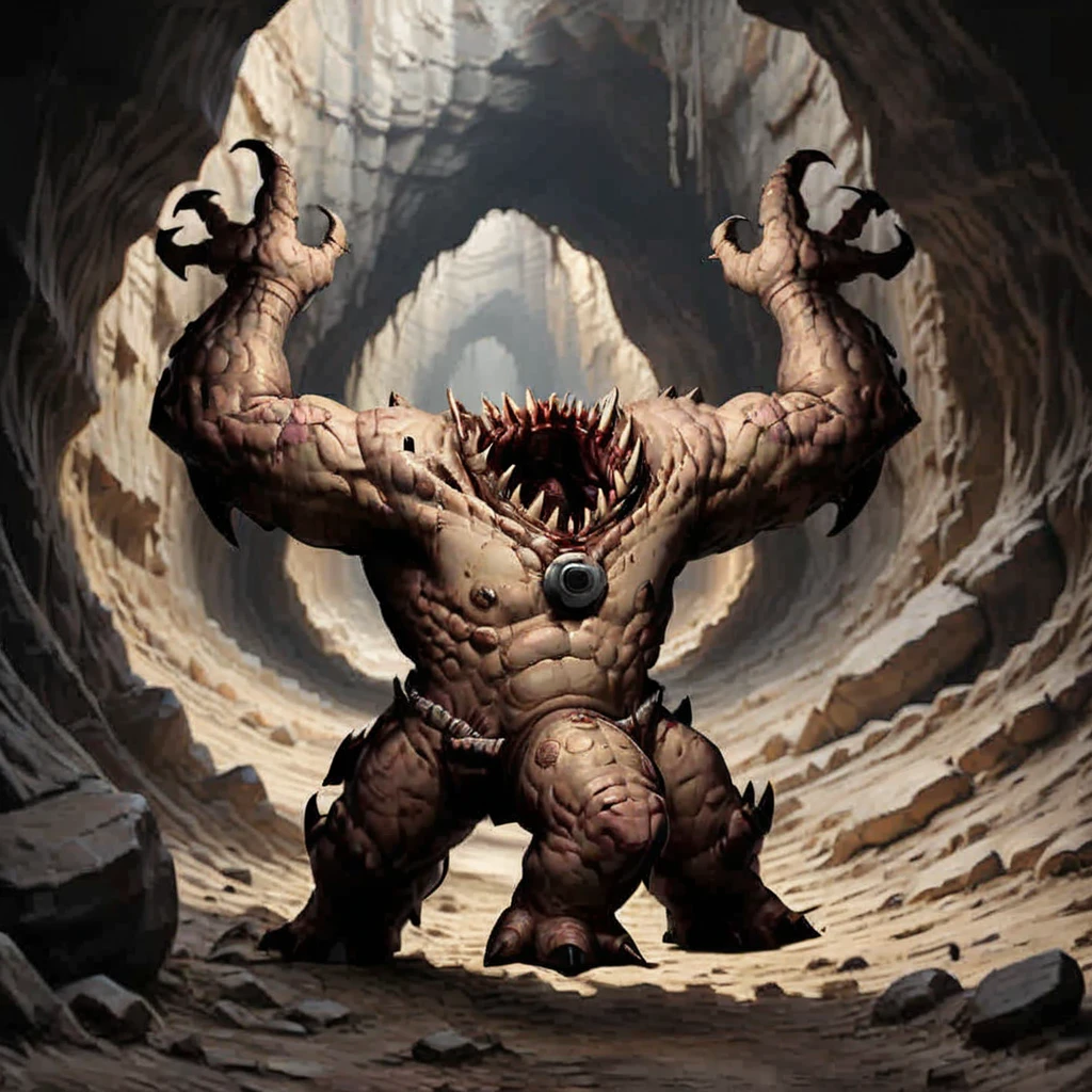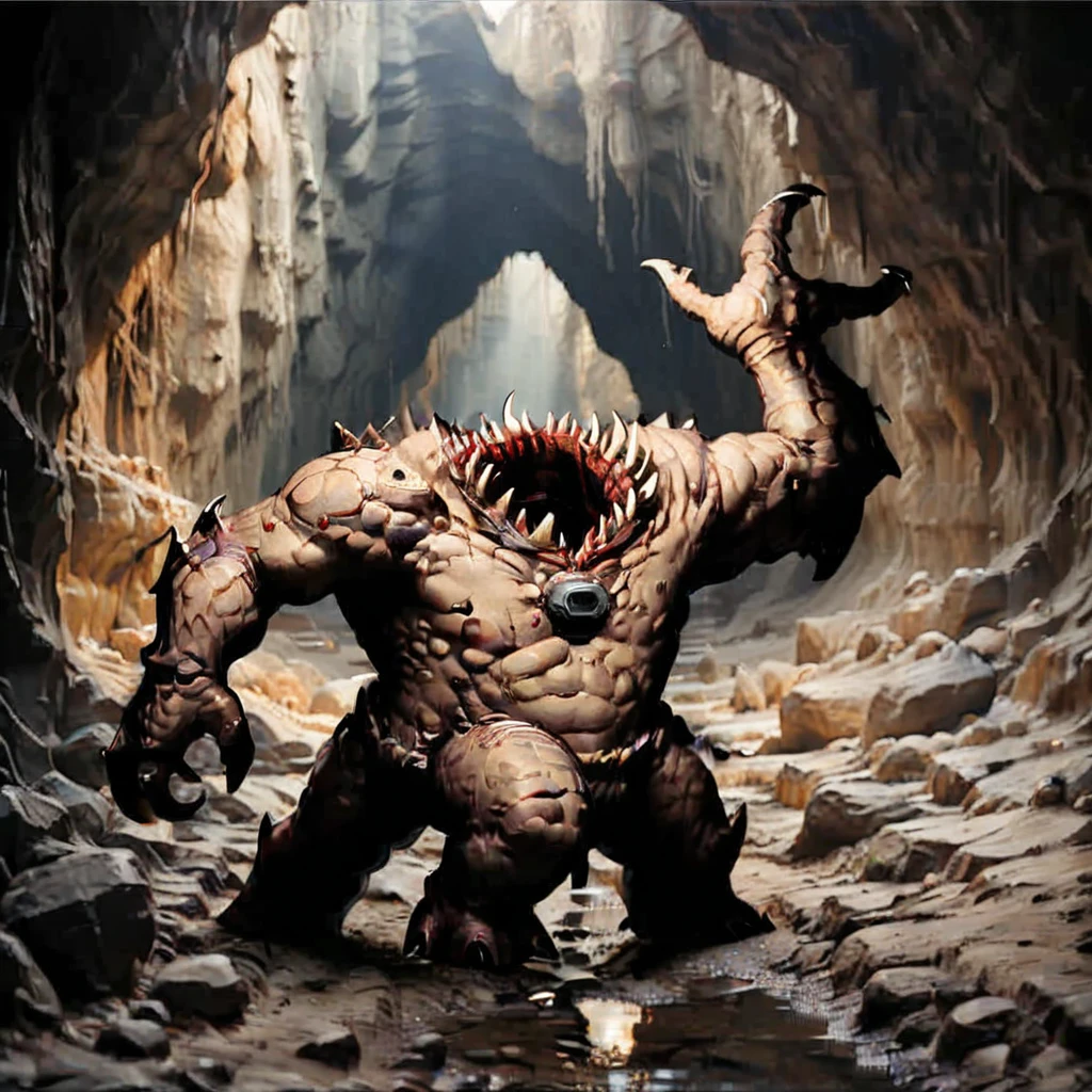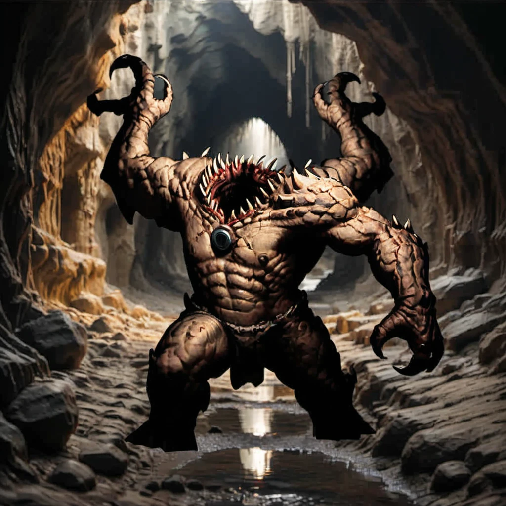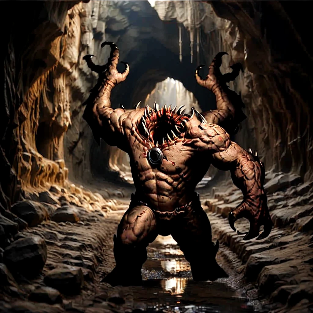 1other, 3 arms, blue sky, cave, claws, cloud, cloudy sky, day, full body, multiple arms, muscular, no humans, open mouth, outdoors, rock, ruins, scales, sharp teeth, simple background, sky, solo, spikes, standing, teeth, tongue, transparent background, water, white background, xorn,Description