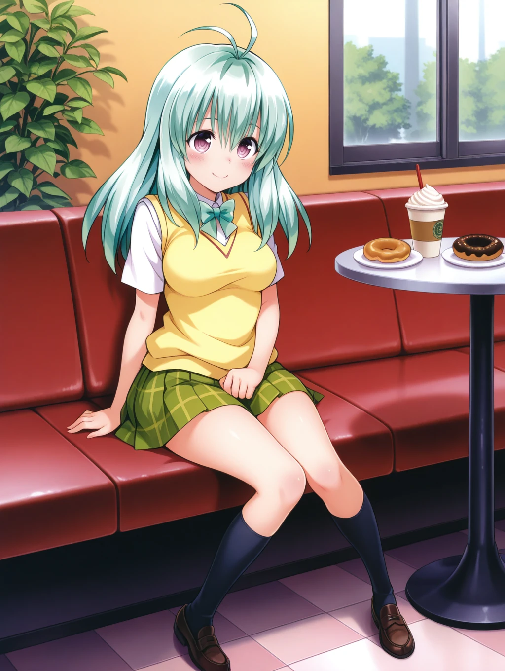 run elsie jewelria, skirt, school uniform, sweater vest, socks, loafers, long hair, shoes, plaid skirt, kneehighs, plaid, pleated skirt, medium breasts, bow, black socks,