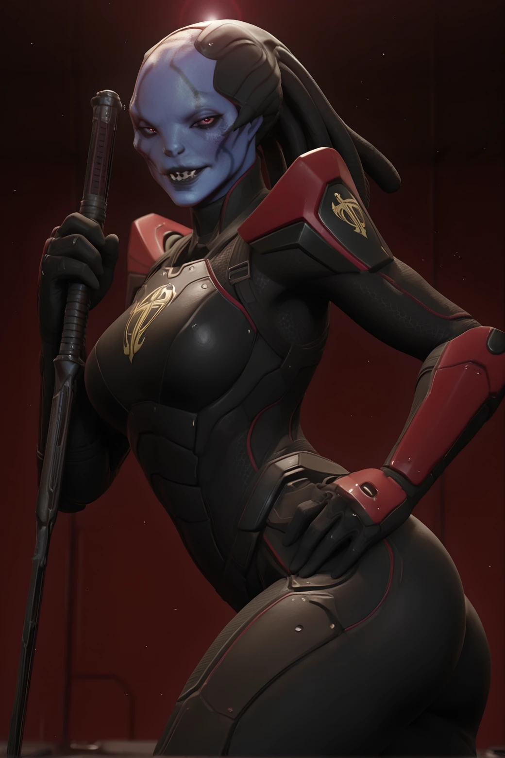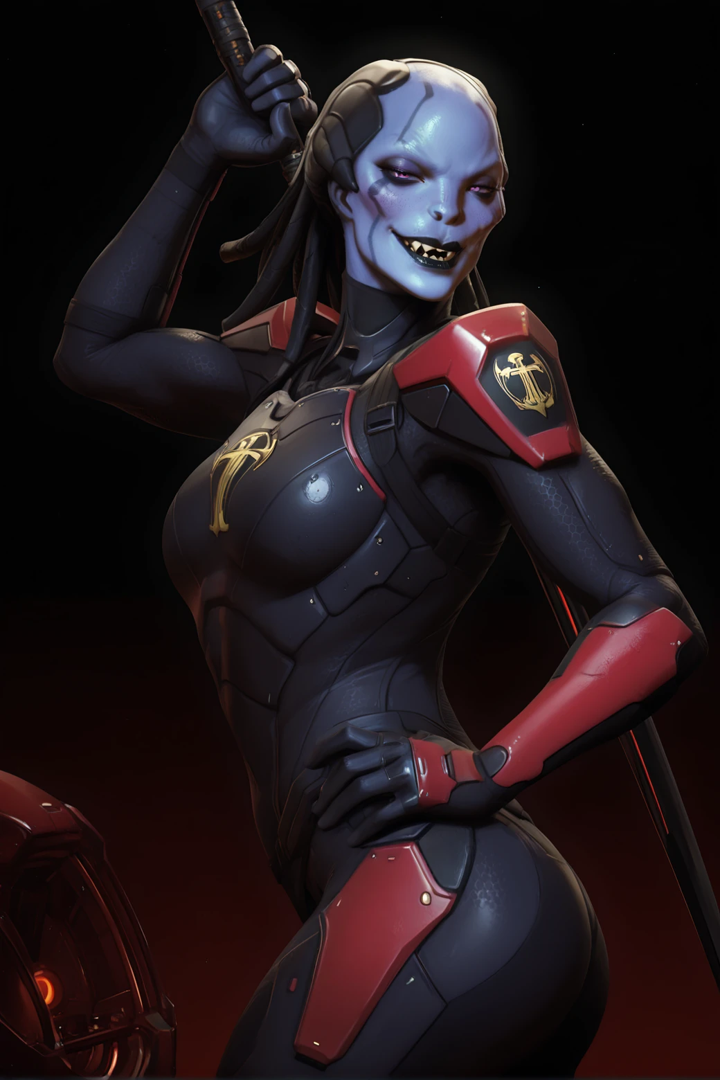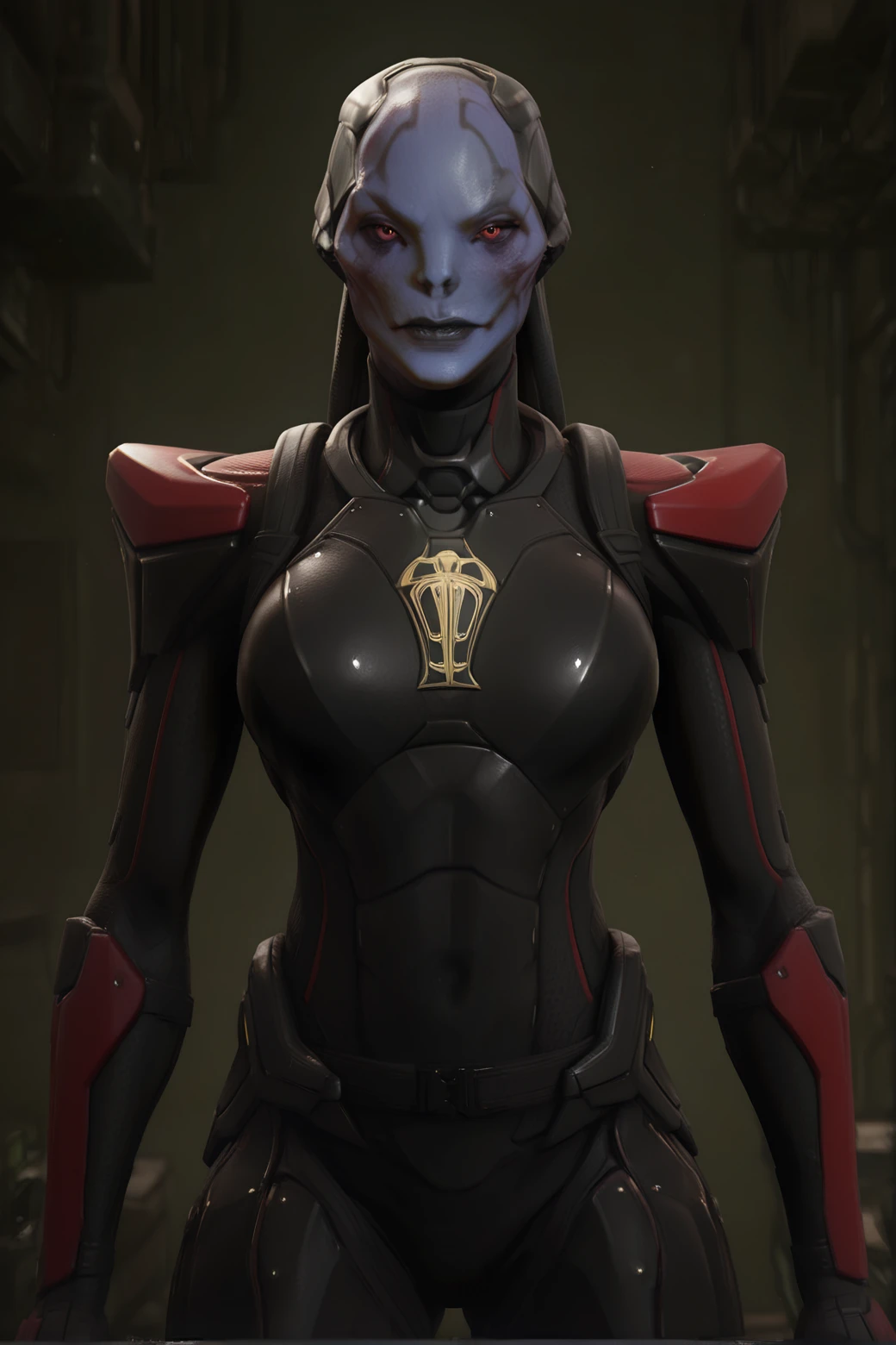 x-c00m_4ss4ss1n, female, alien humanoid, blue skin, blue body, red eyes, cheekbones, bald, facial tattoo, shoulder pads, black clothing, looking at viewer, black and red clothing, dreadlocks, black lips, slim, small waist, 5 fingers, chest emblem, golden emblem,,