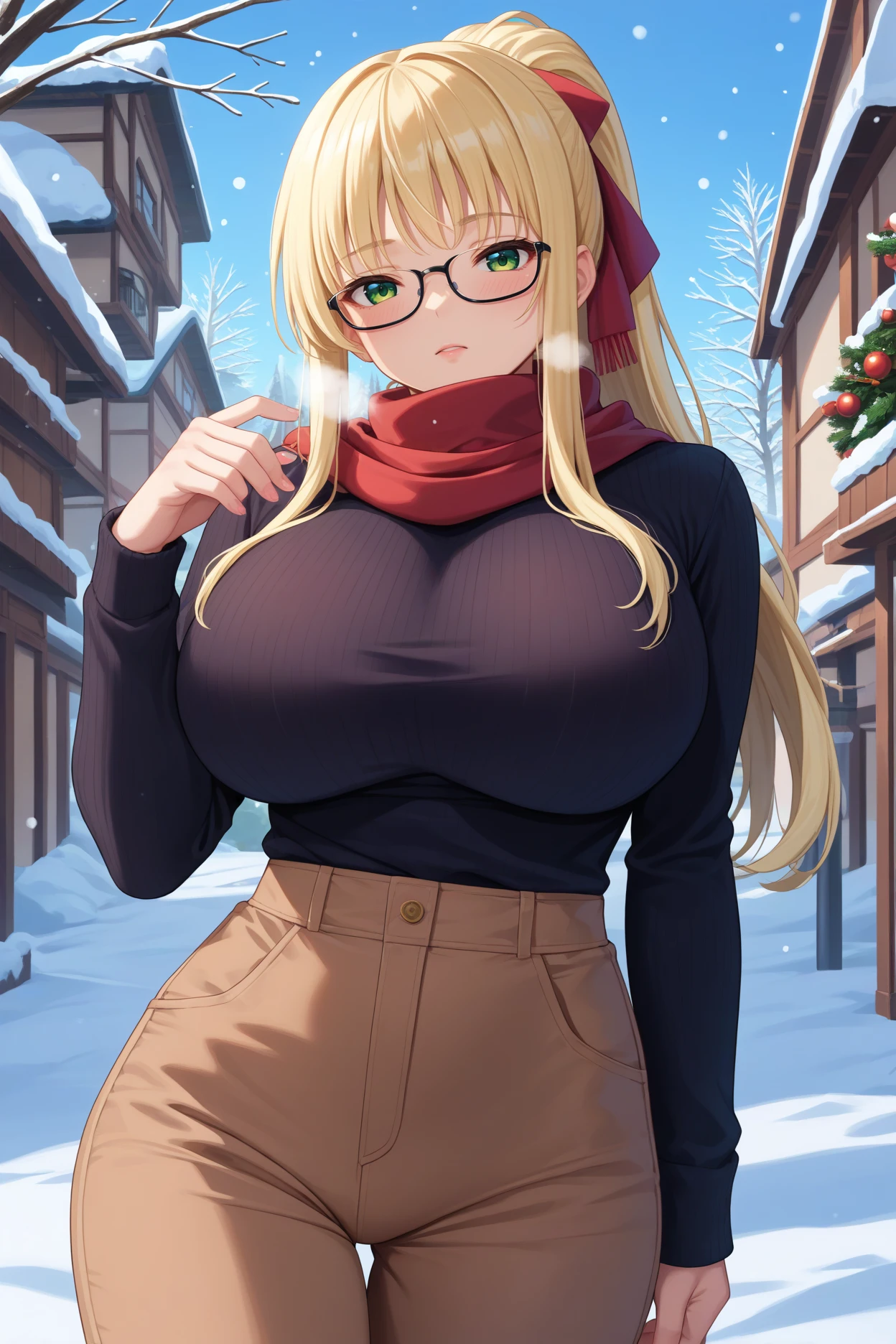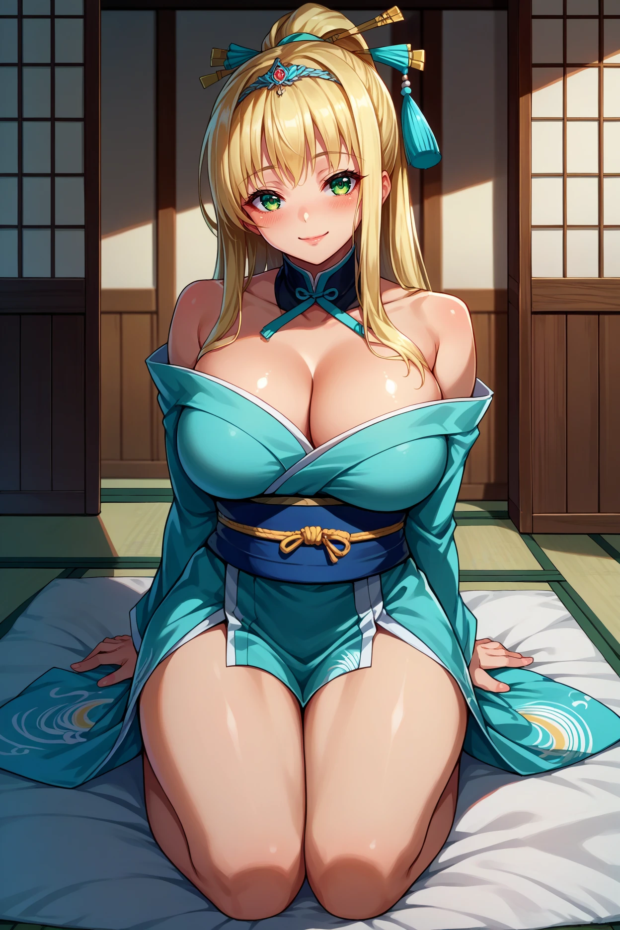 kfis1s, high ponytail, blonde hair, long hair, sidelocks, green eyes, large breasts
