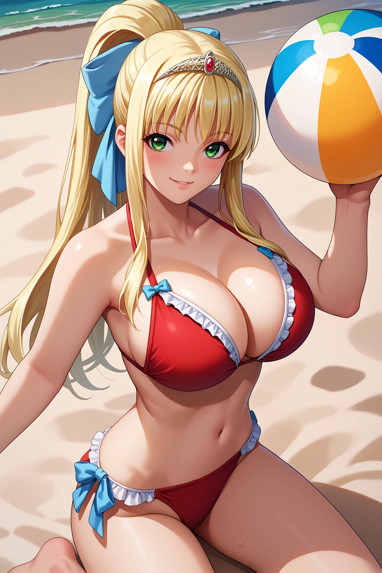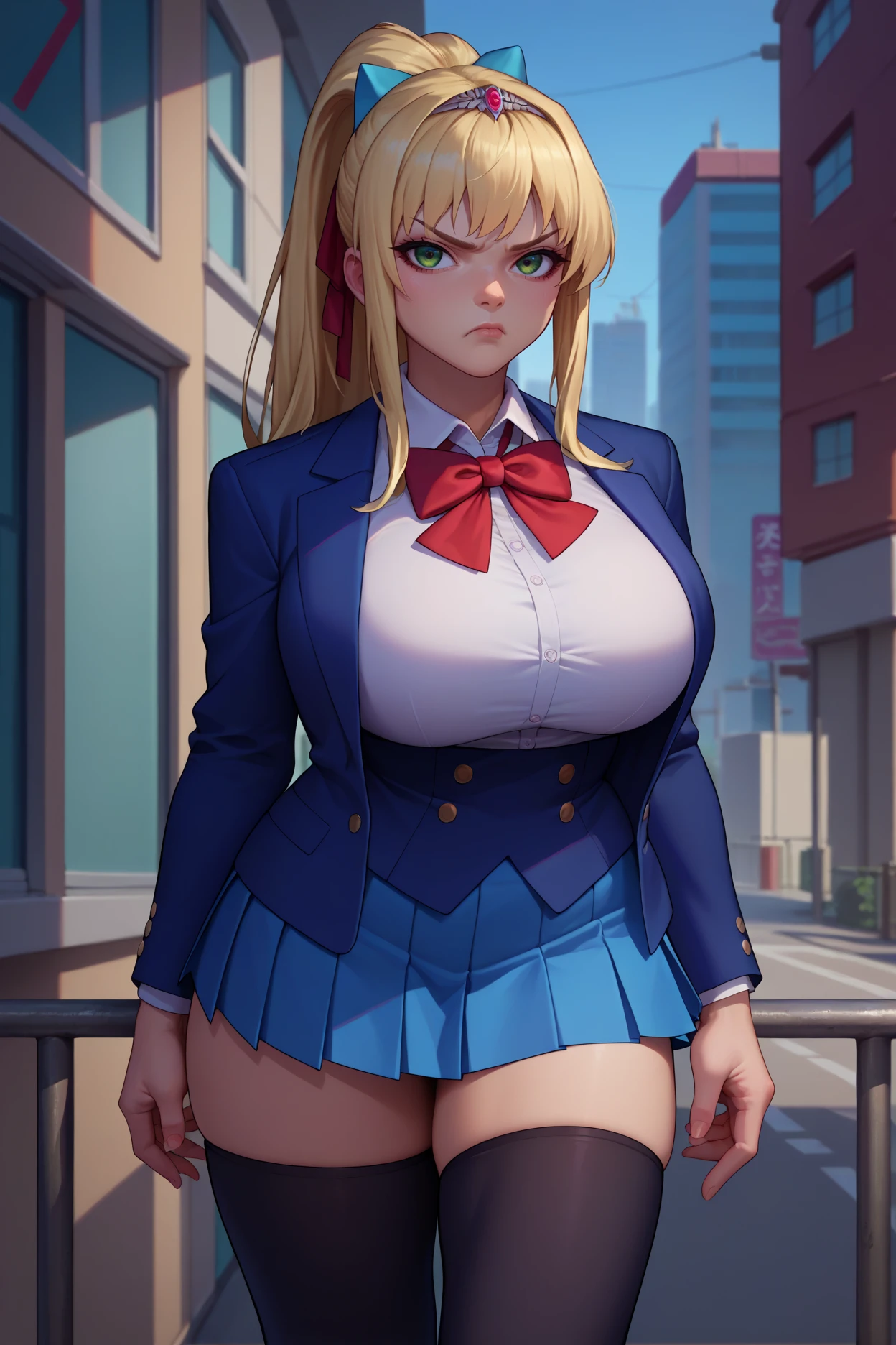 Add "hair bow, blue bow, tiara, cleavage, armor, shoulder armor, brown bodysuit, white belt, white thighhighs, bracers, fingerless gloves" for her typical look.