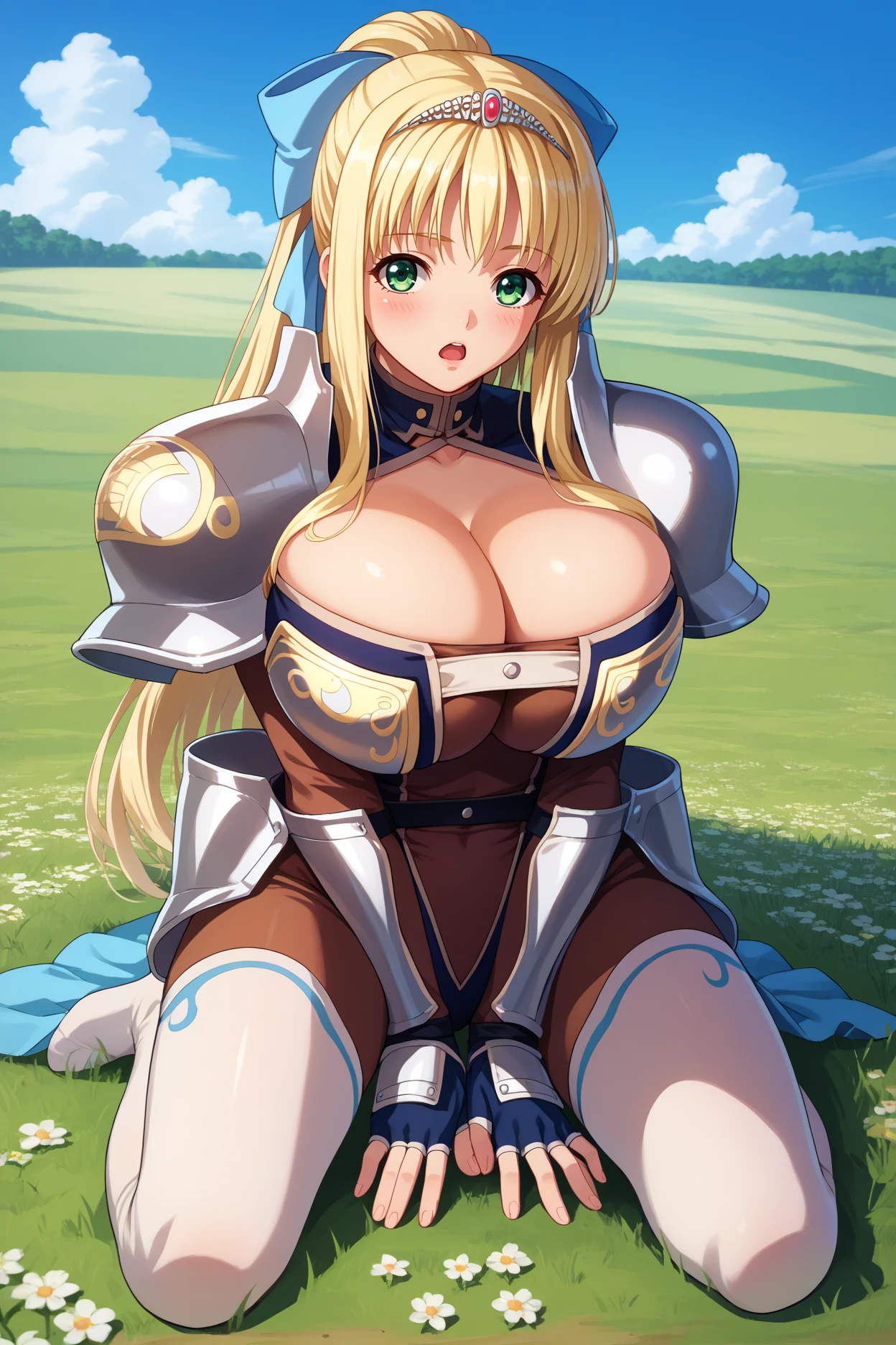 hair bow, blue bow, tiara, cleavage, armor, shoulder armor, brown bodysuit, white belt, white thighhighs, bracers, fingerless gloves