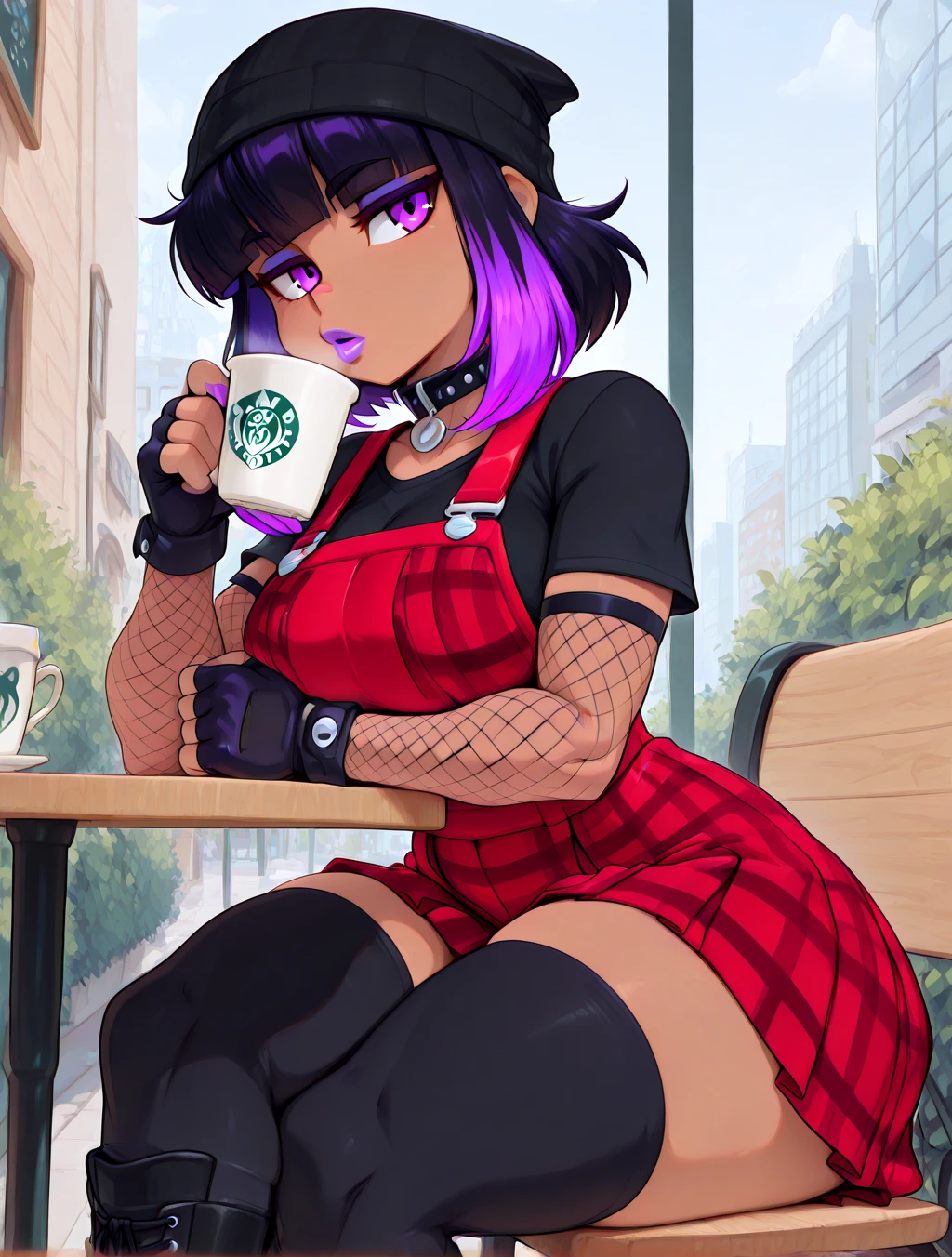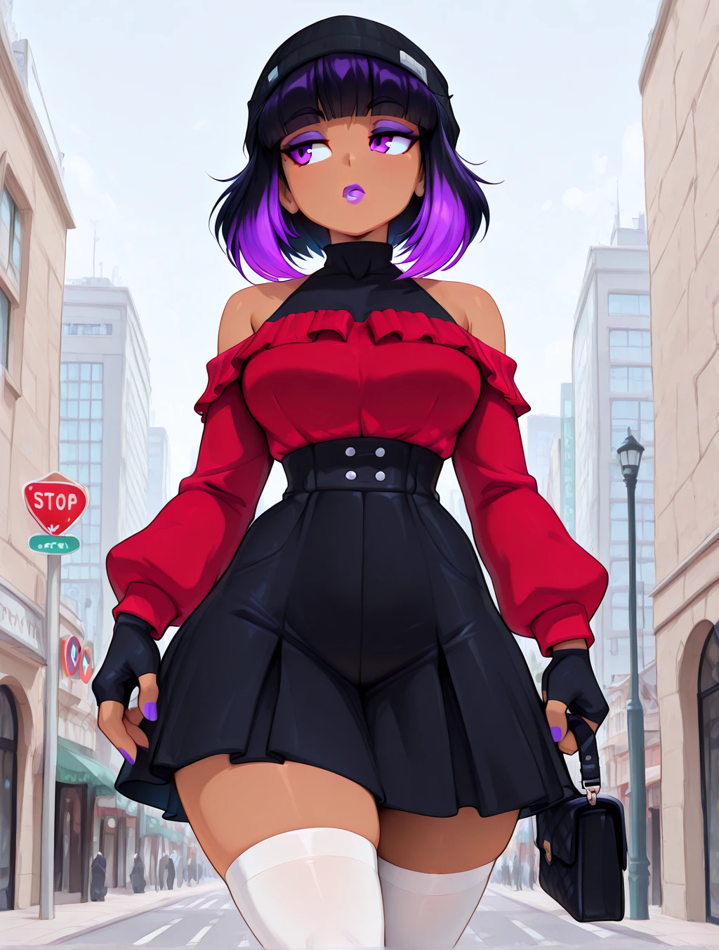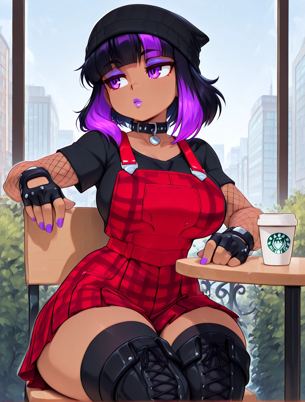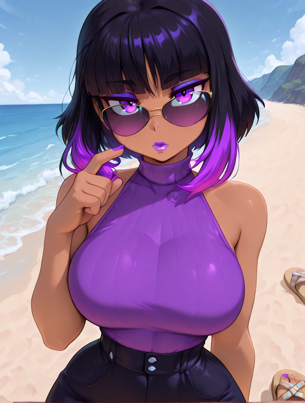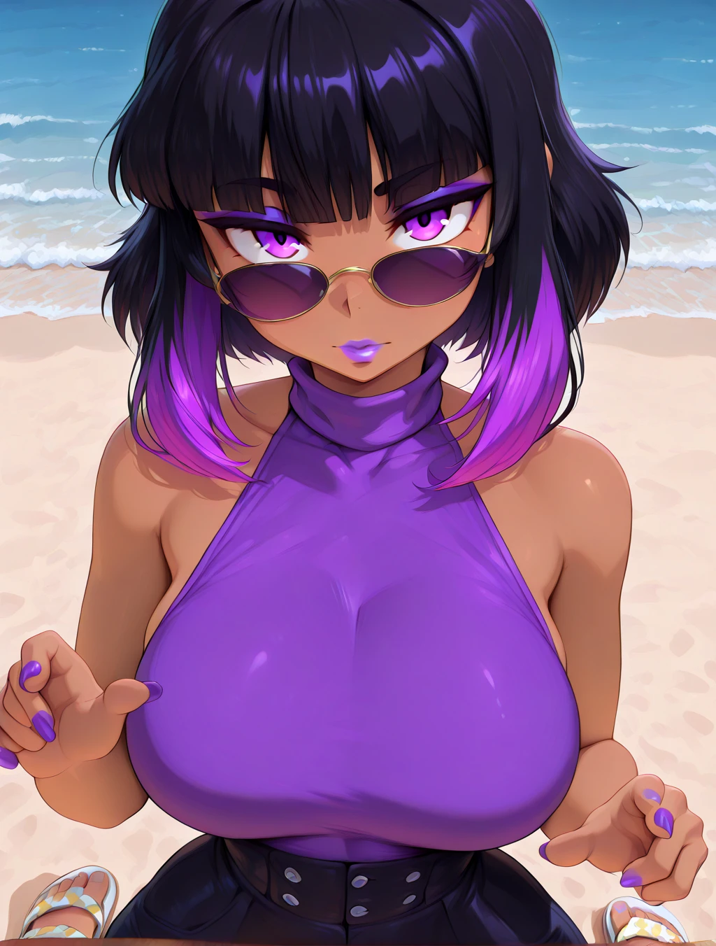 (Latisha_Hoppie, brown-skin, black hair, purple hair, multicolored hair, medium hair, bangs, purple eyes, purple eyelids, curvy, breasts, purple lipstick, purple finger nails)