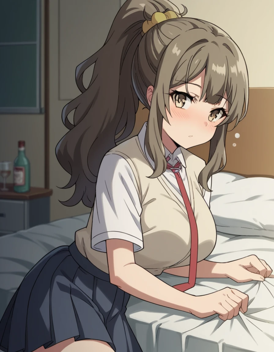 shirt, hair ornament, school uniform, white shirt, ponytail, short sleeves, necktie, scrunchie, red necktie, hair scrunchie,