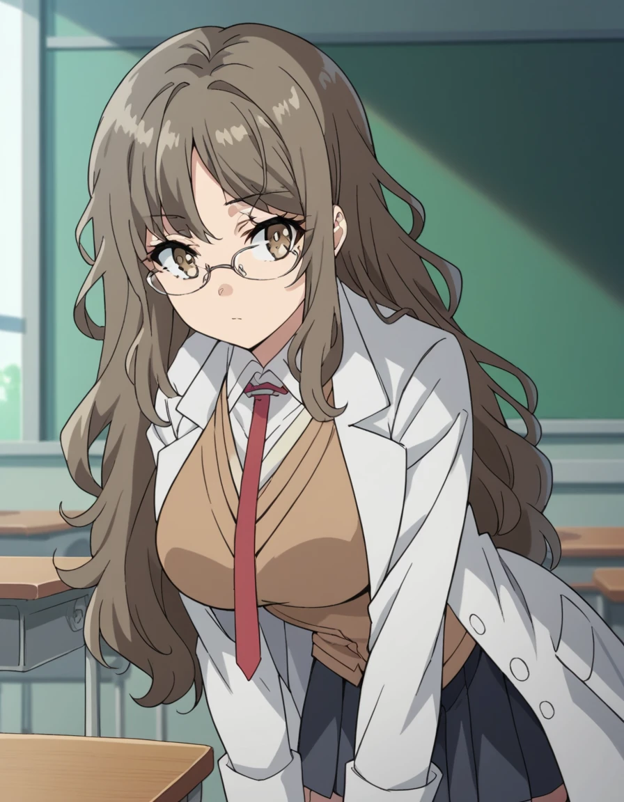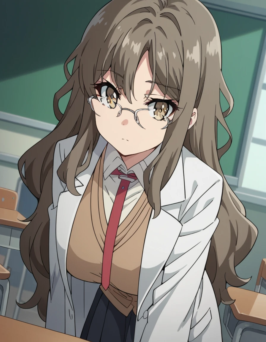 glasses, skirt, shirt, school uniform, white shirt, pleated skirt, glasses, collared shirt, black skirt, vest, red necktie, labcoat, white labcoat, brown vest,