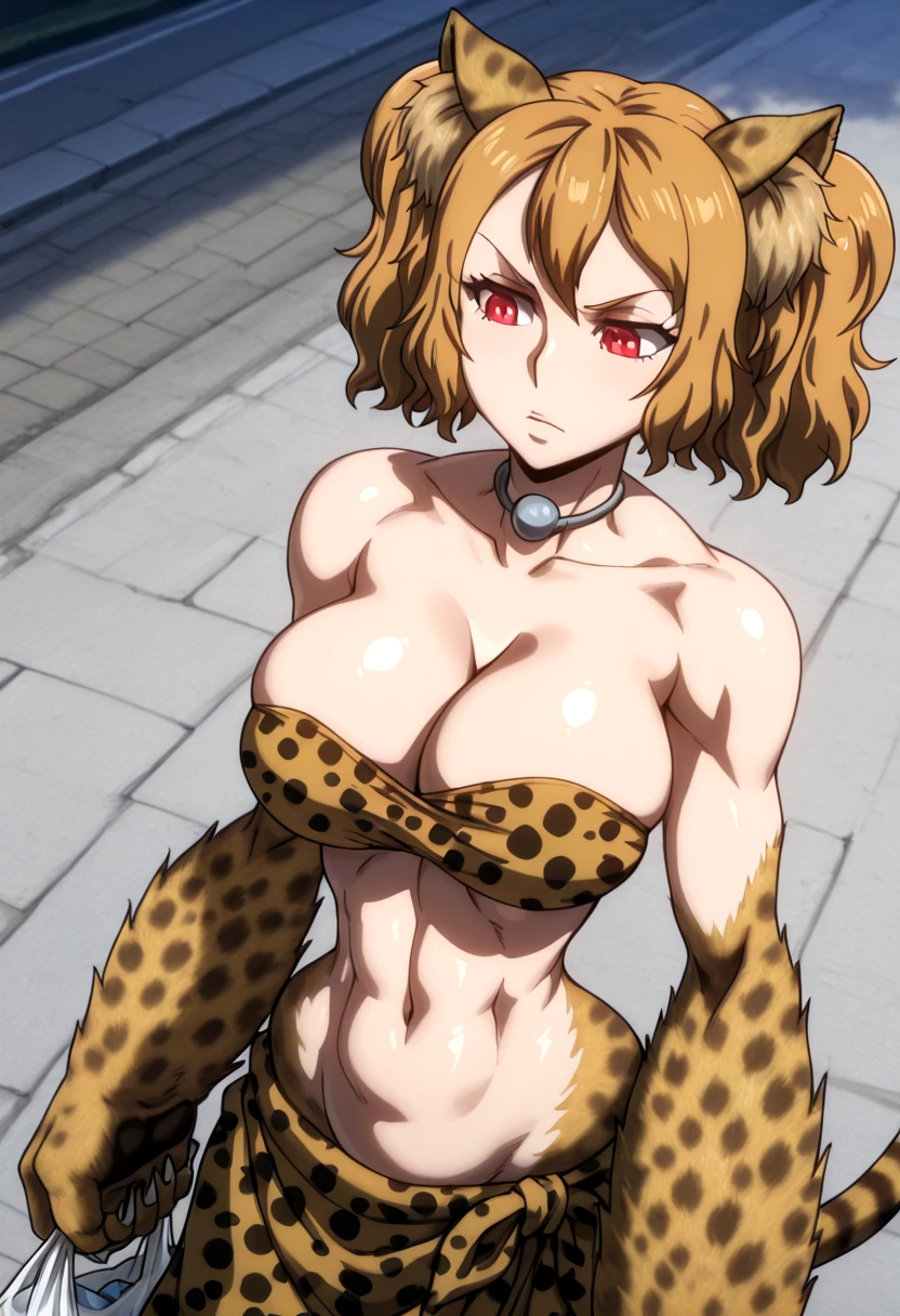 bandeau top, cleavage, shoulders, collar, collarbone, strapless, cheetah print top, cheetah print sarong, sarong, retro art style,