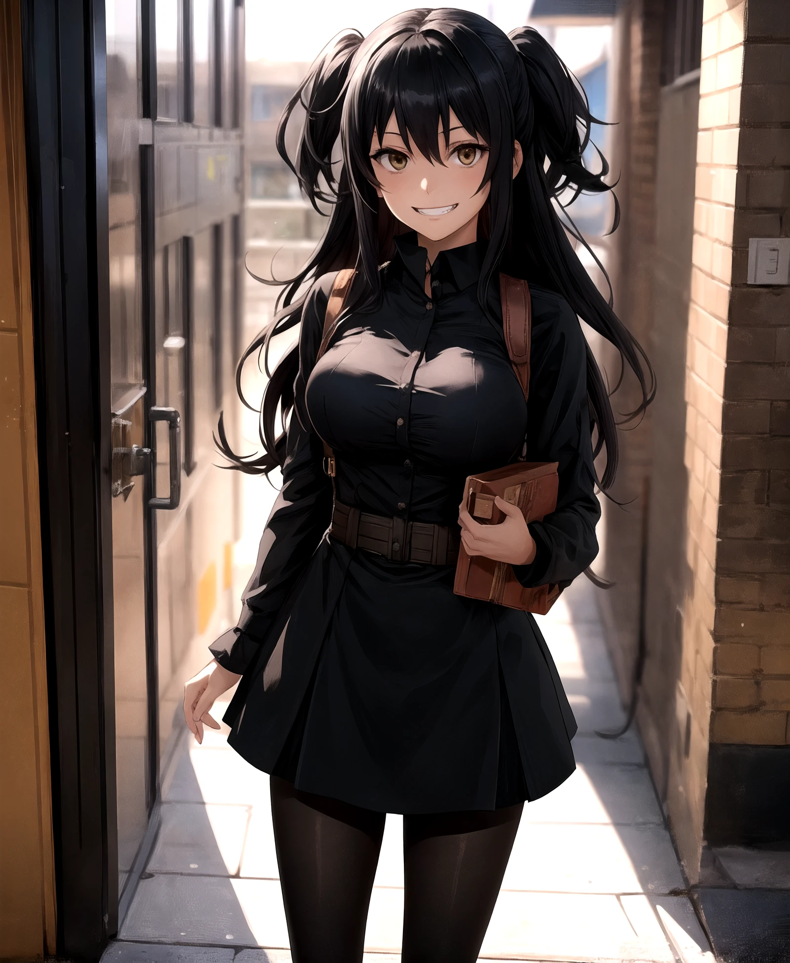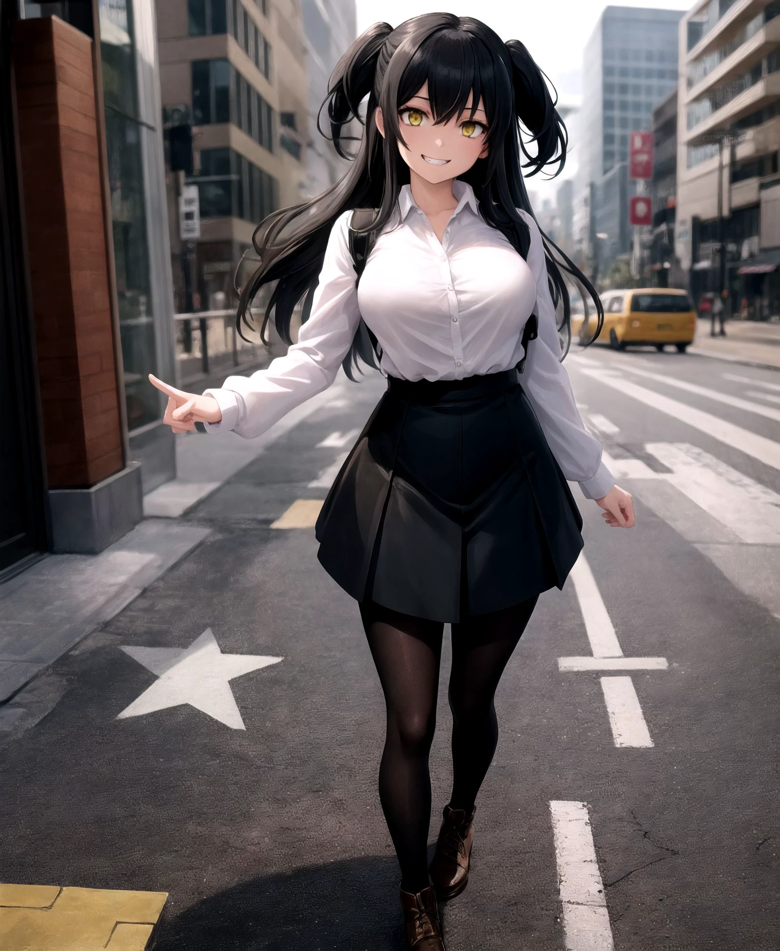 black skirt, two side up, black pantyhose, brown footwear, yellow eyes, white shirt, pantyhose, pouch, holster, rakko yumiya,