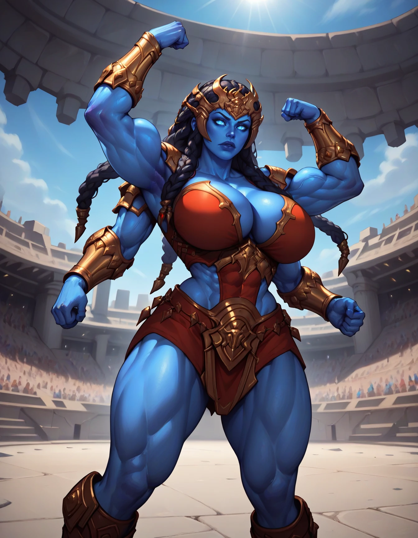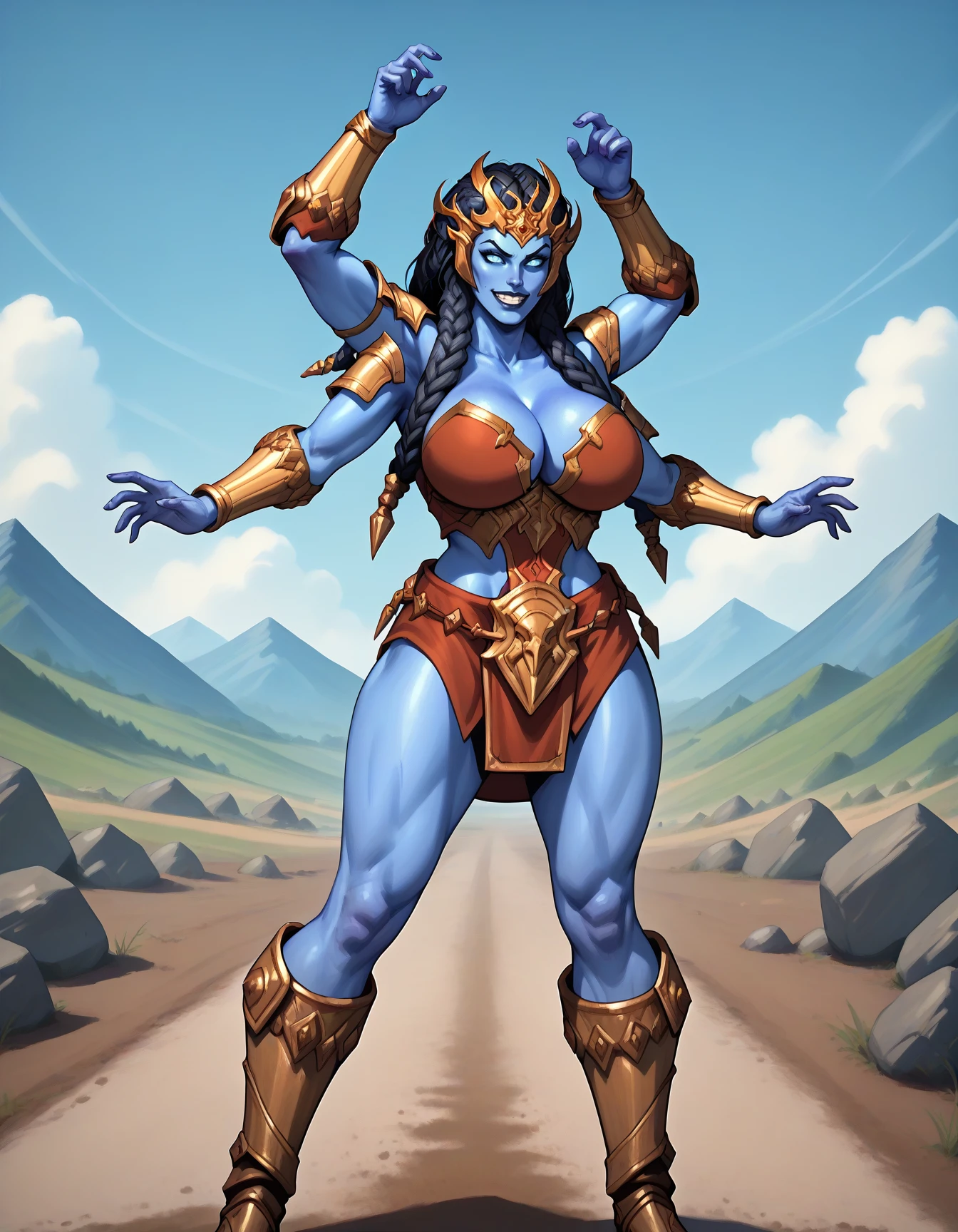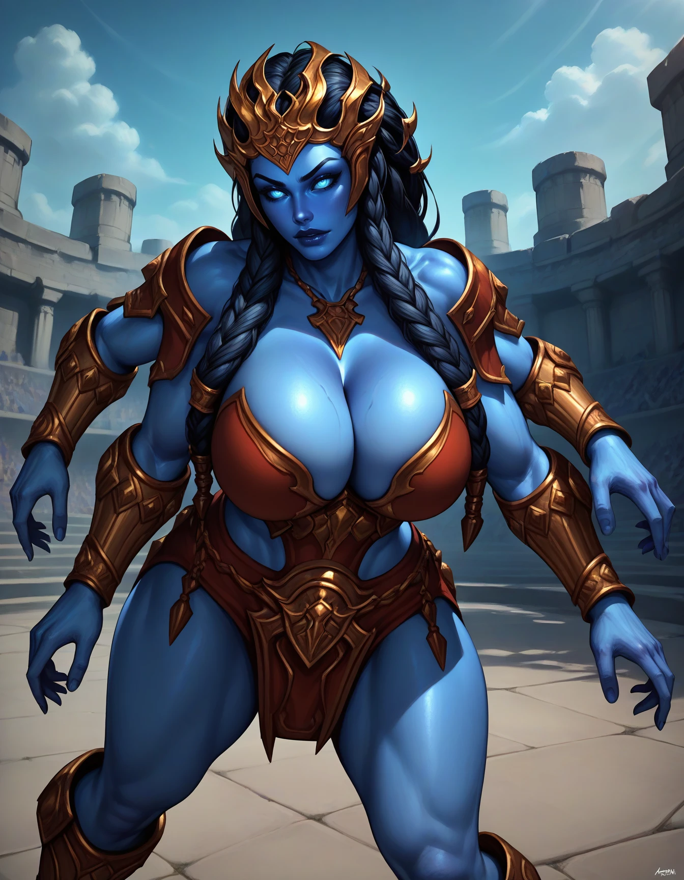 armor, blue skin, no pupils, braid, multiple braids, boots,
