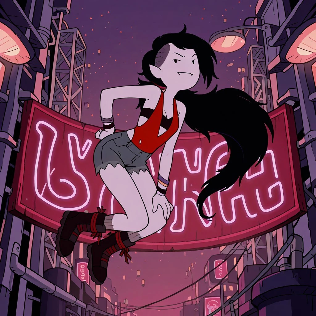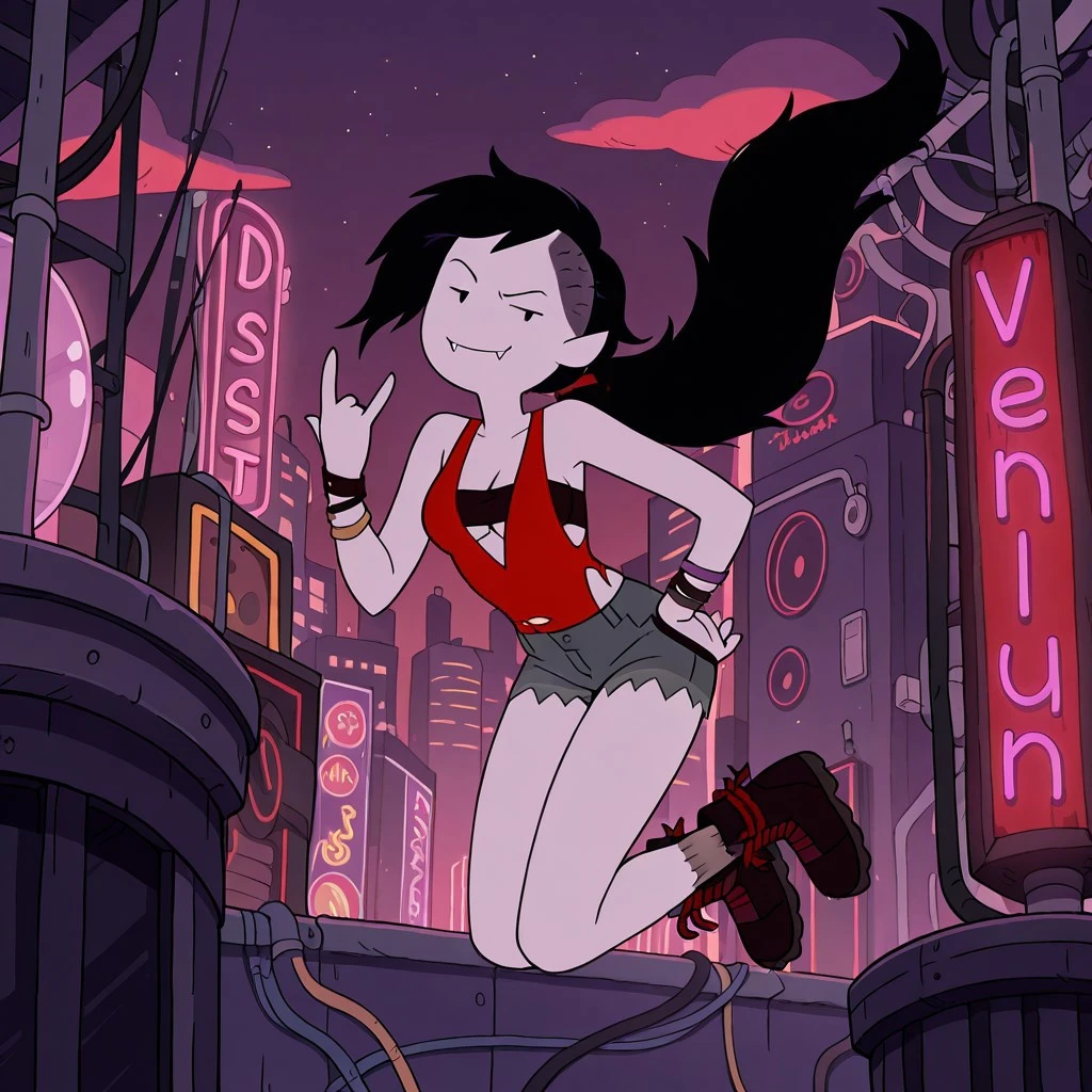 vampire female, solo, gray skin, black eyes, very long black hair with shaved sides, fangs, ripped red tanktop, black breast wrap, frayed jean shorts, dark boots with red laces, studded black bracelets,