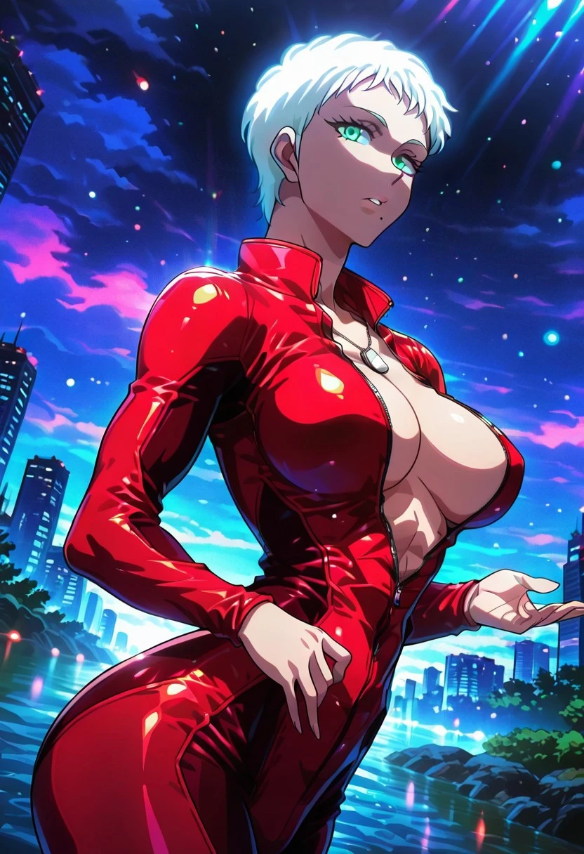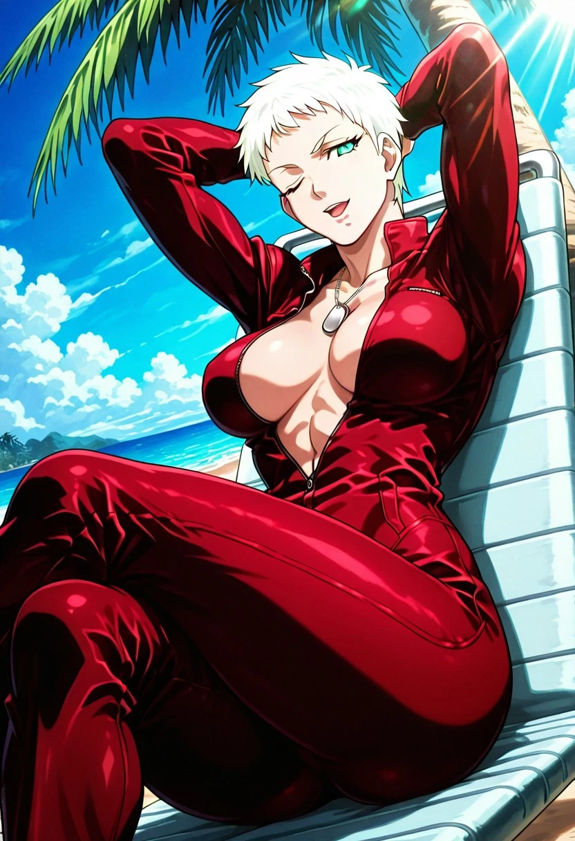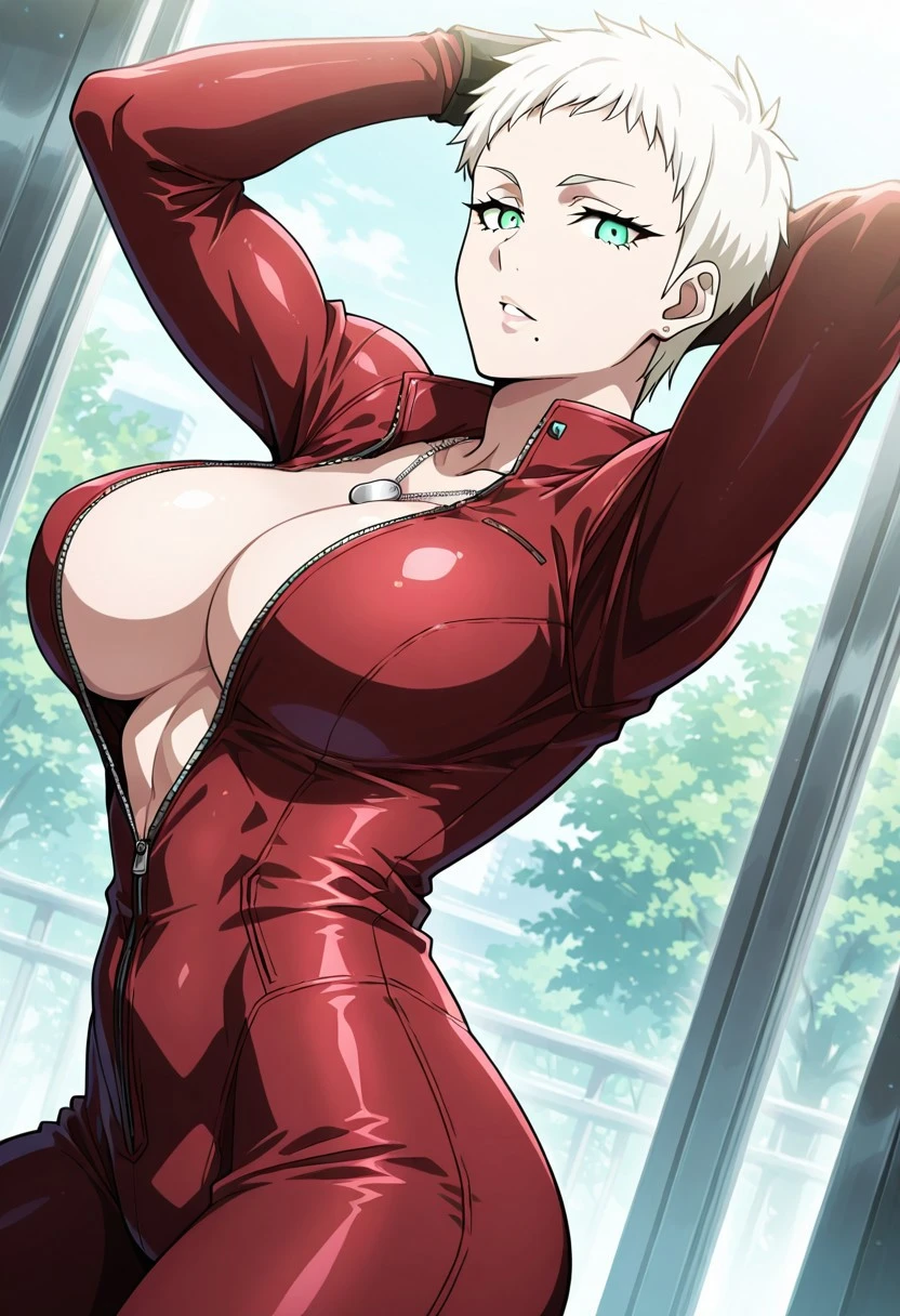 ElenaPerepelkinaTF, 1girl, solo, muscular female, tomboy, short hair, white hair, aqua eyes, full lips, pink lips, mole, mole under mouth, dog tags, red bodysuit, open body suit, large breast, thick thighs, large butt, red pants,