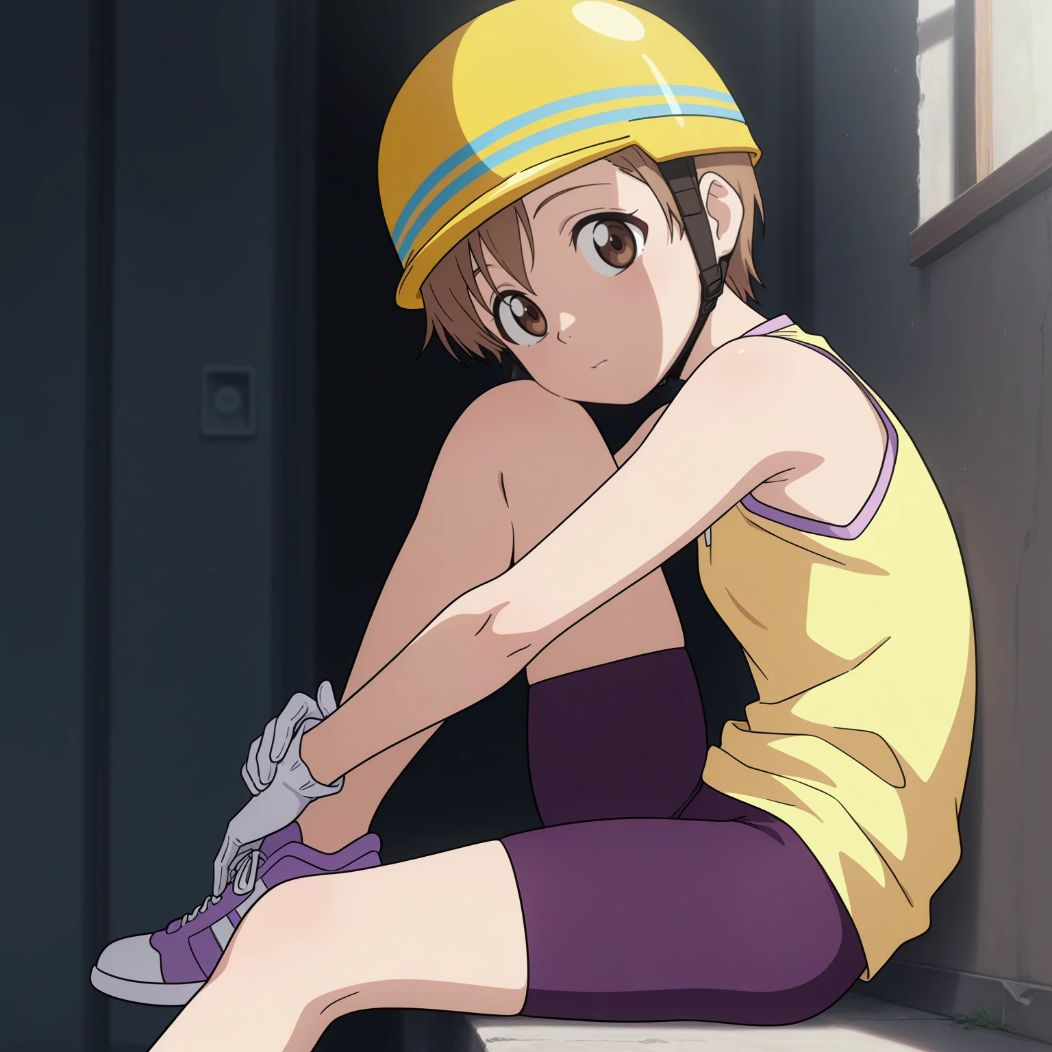 yellow helmet, sleeveless shirt, yellow shirt, purple bike shorts, white gloves,