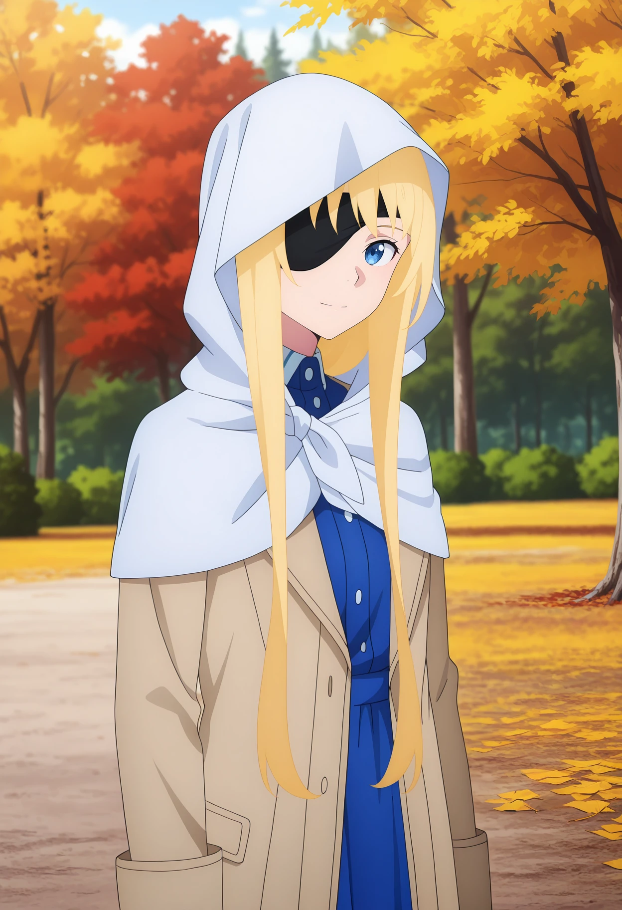 AliceCoat, hood up, white hood, white capelet, brown coat, blue dress