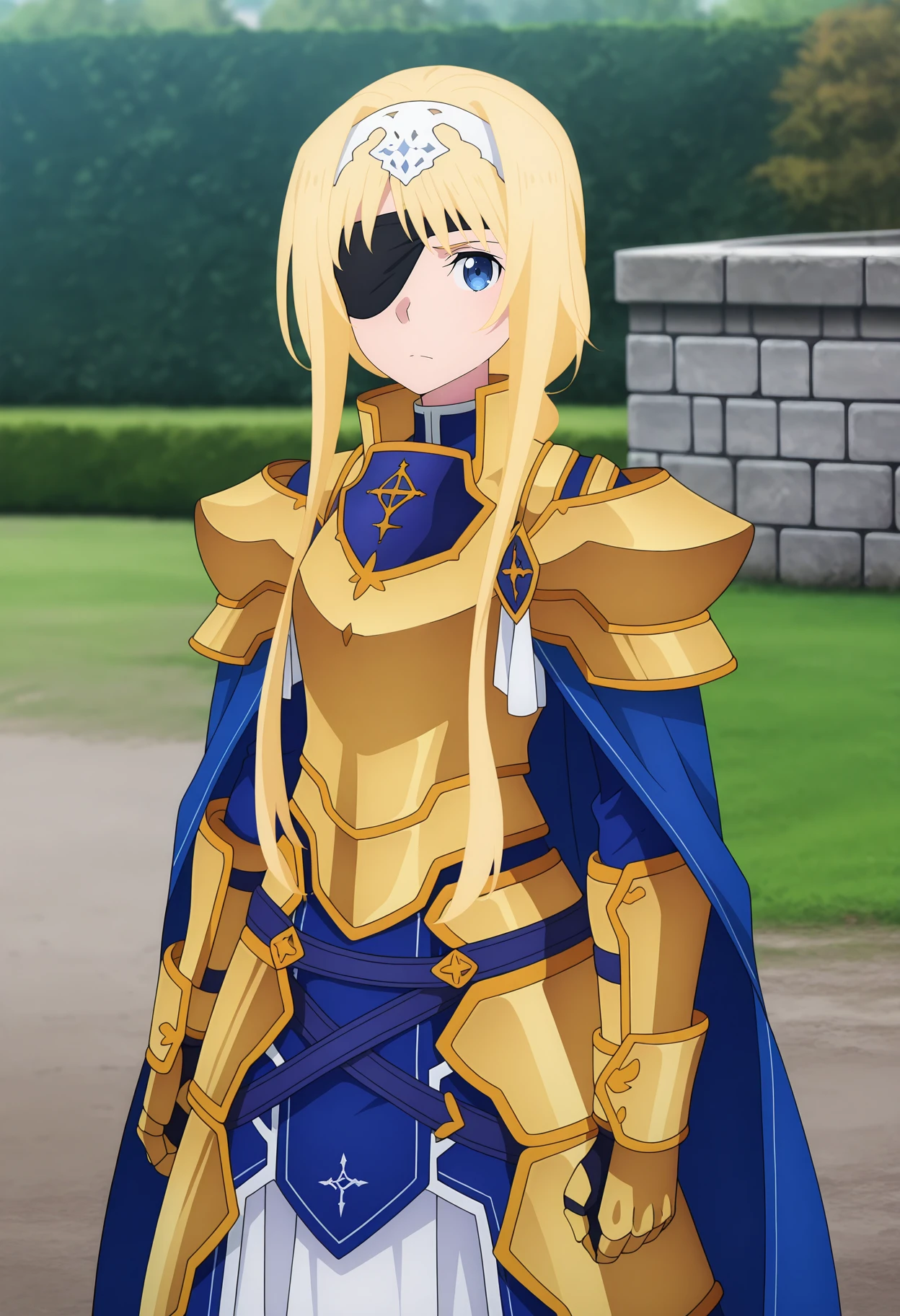 AliceArmor, gold armor, pauldrons, blue cape, gauntlets, faulds, long skirt, white skirt, sword, sheathed