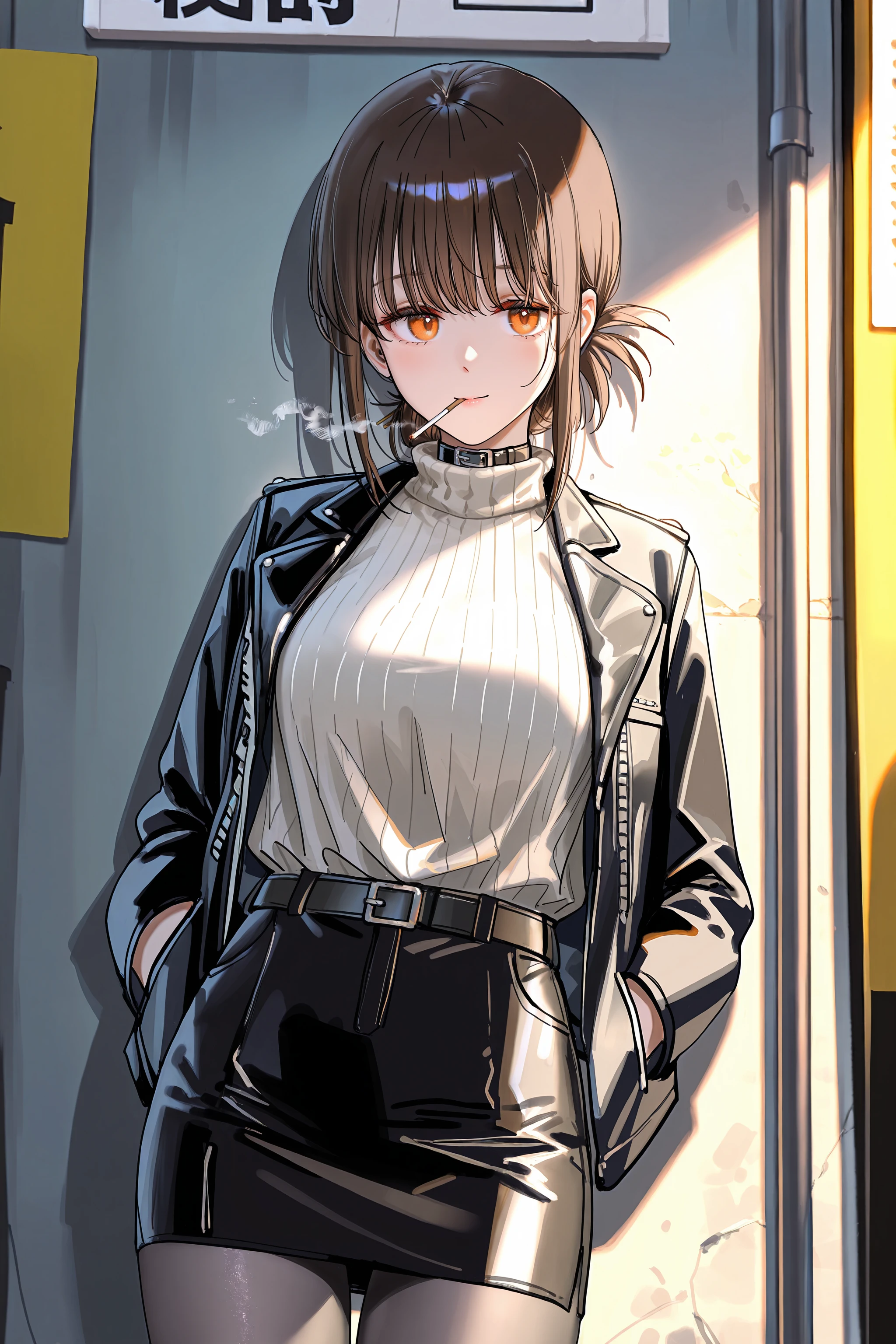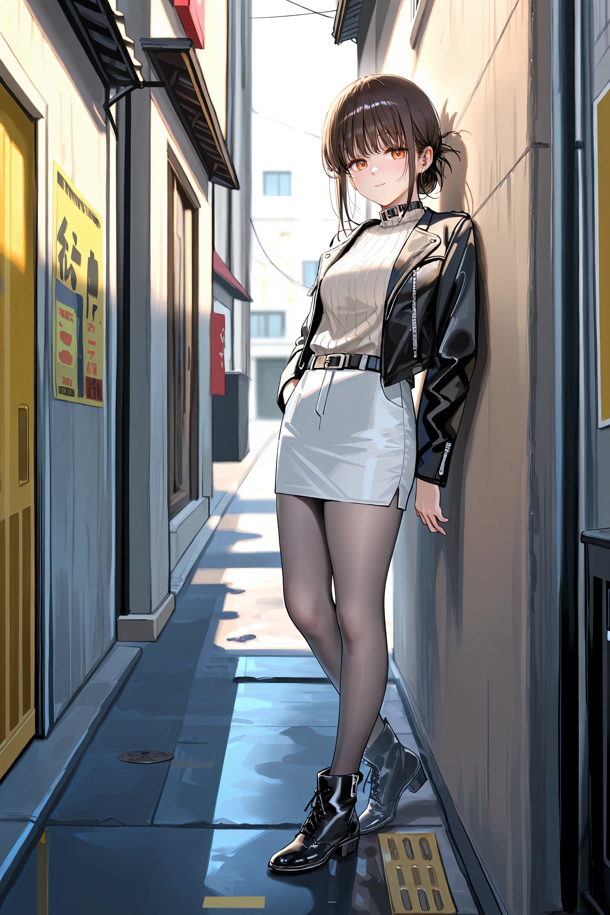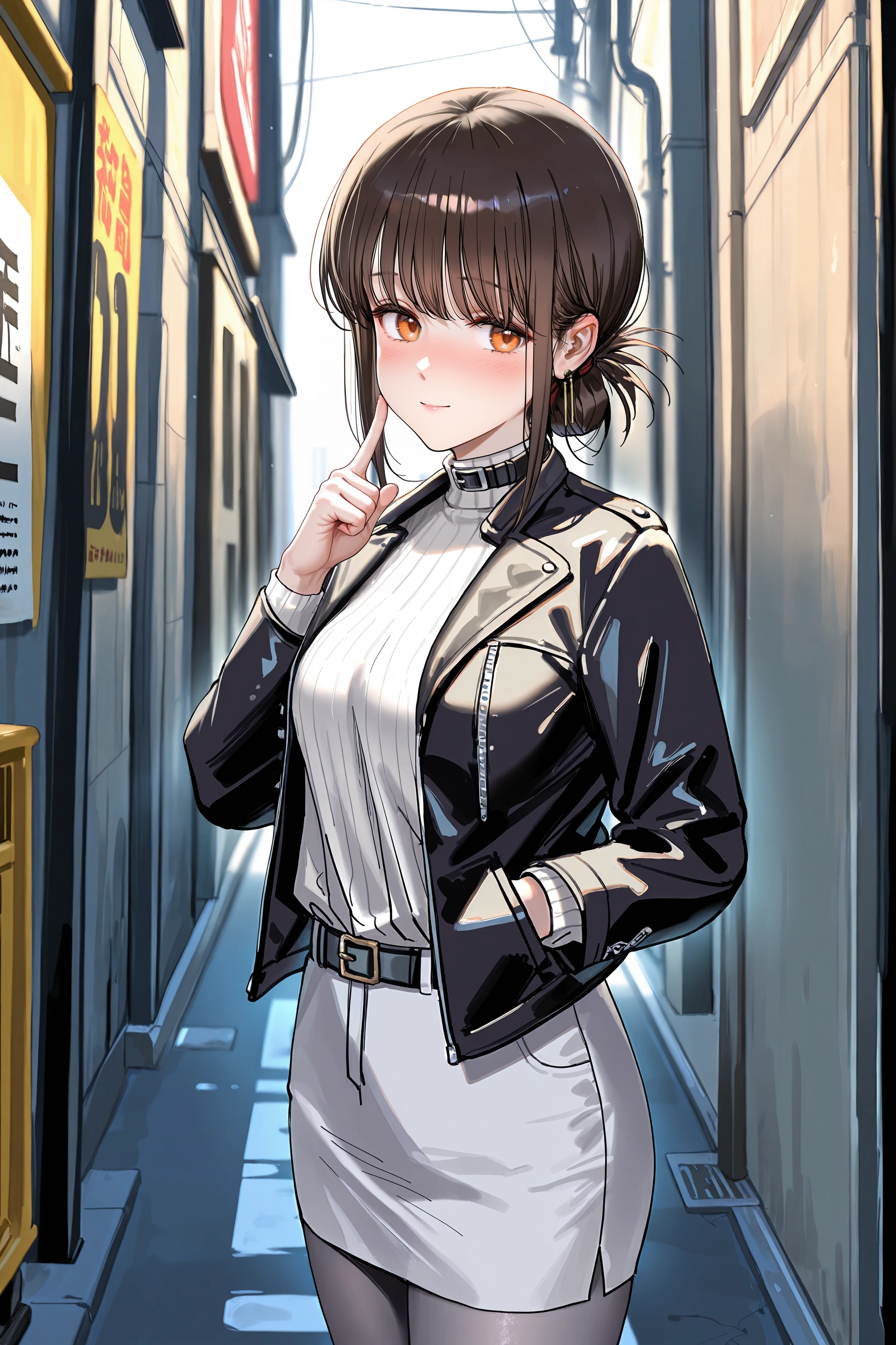 For Tayama's looking at the back of the supermarket: lipstick, folded ponytail, belt collar, turtleneck sweater, belt, leather jacket, oversized jacket, pencil skirt, grey pantyhose, ankle boots