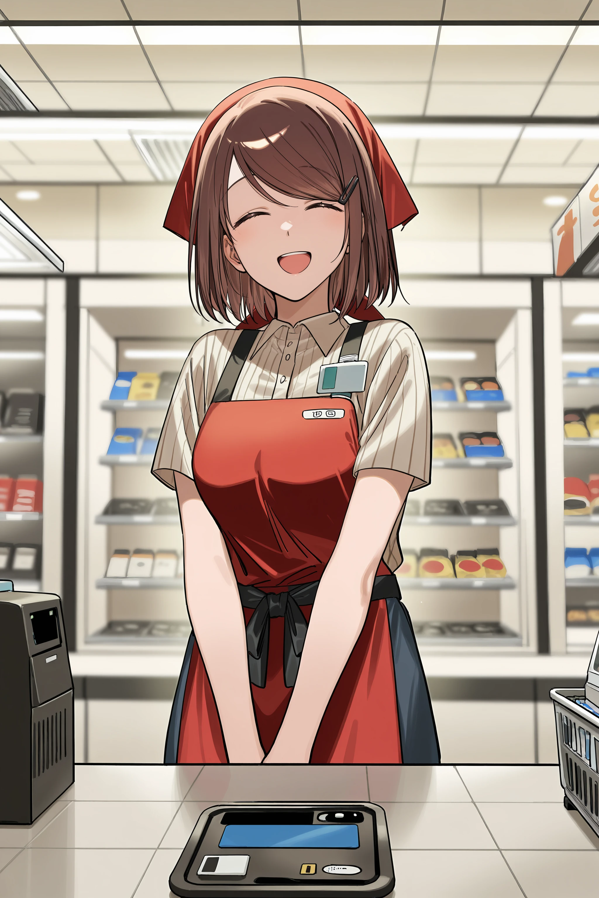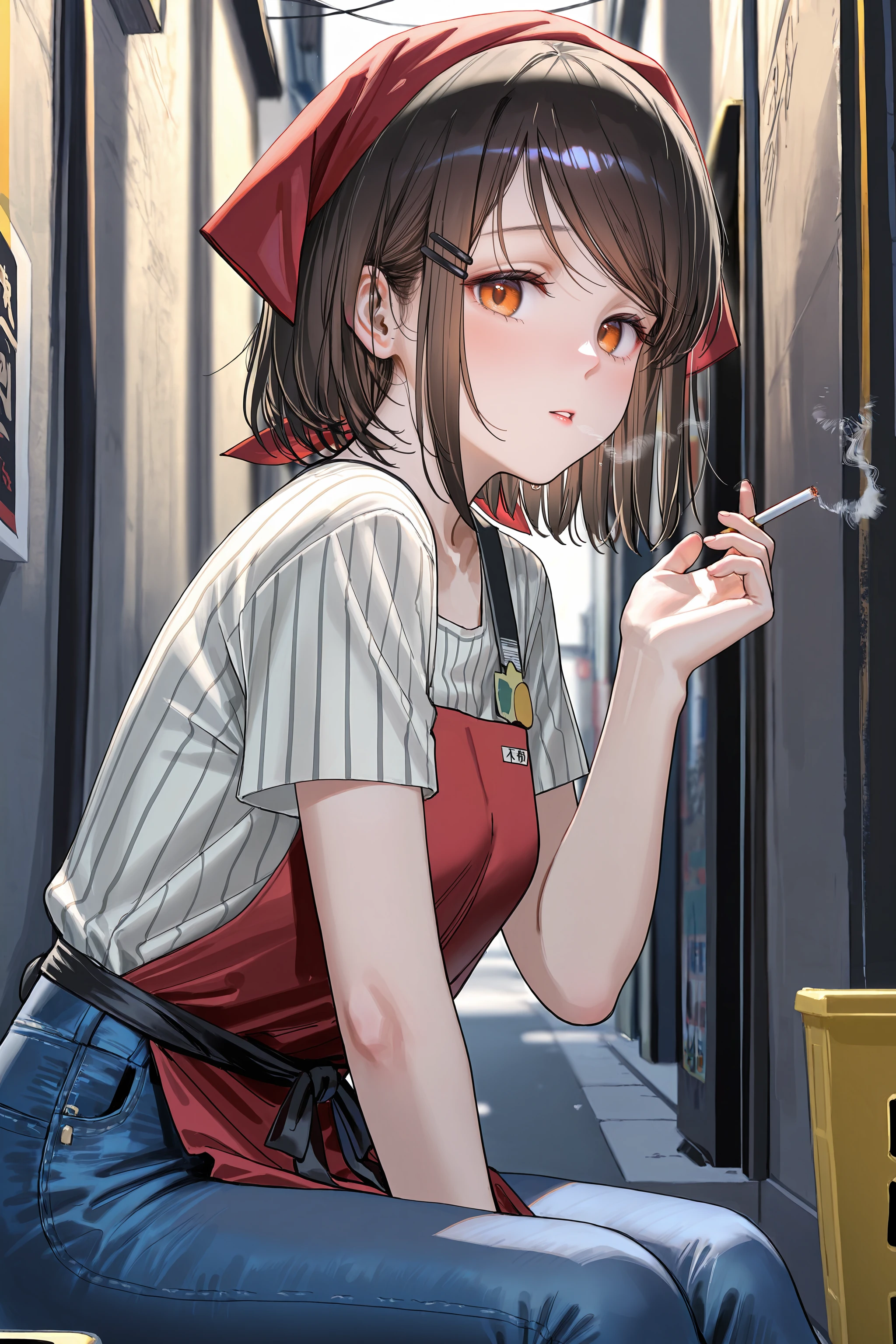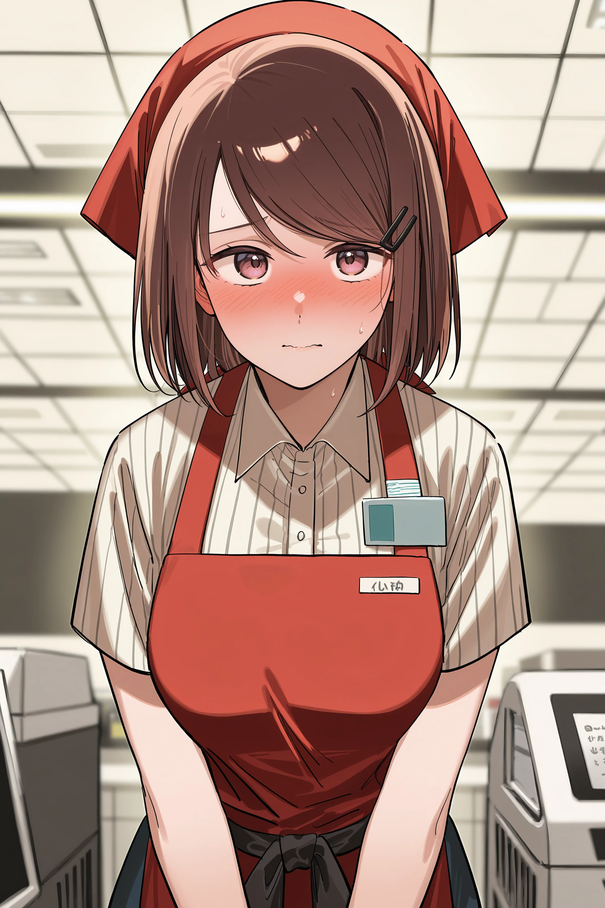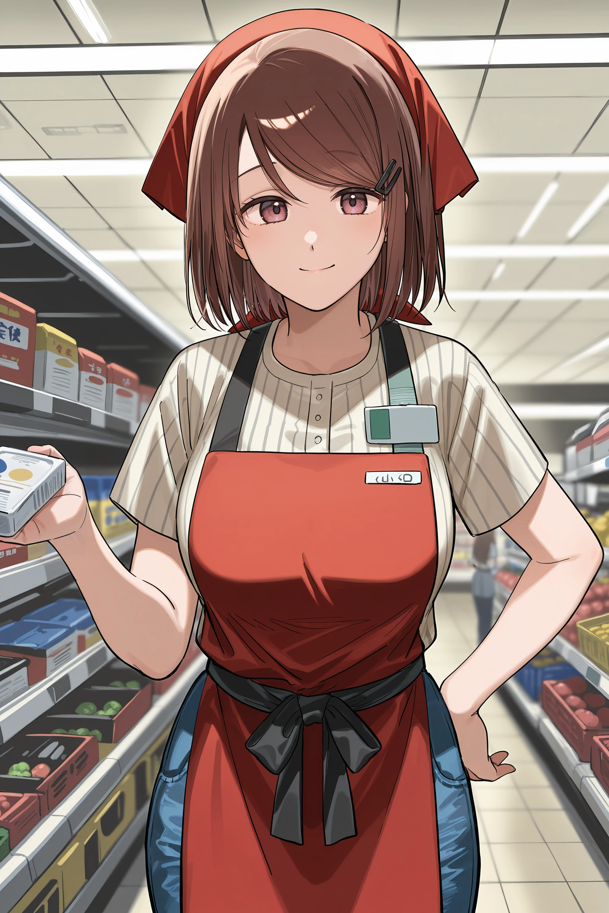 For Yamada's default working costume at the supermarket: swept bangs, hairclip, red headscarf, striped shirt, short sleeves, denim, jeans, loafers, red apron