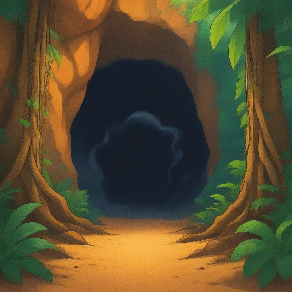 lush jungle, dense foliage, tropical forest, oversized trees, thick tree trunks, jungle plants, broad leaves, hanging vines, forest undergrowth, mossy rocks, dirt path, sandy ground, jungle clearing, cave entrance, rocky cave opening, natural landscape, sunlight rays, god rays through trees, soft shadows, warm daylight, vibrant greenery, painterly anime background, clean anime lineart, smooth shading, detailed environment, wide environment shot, fantasy jungle, adventure atmosphere, natural depth, environment focus