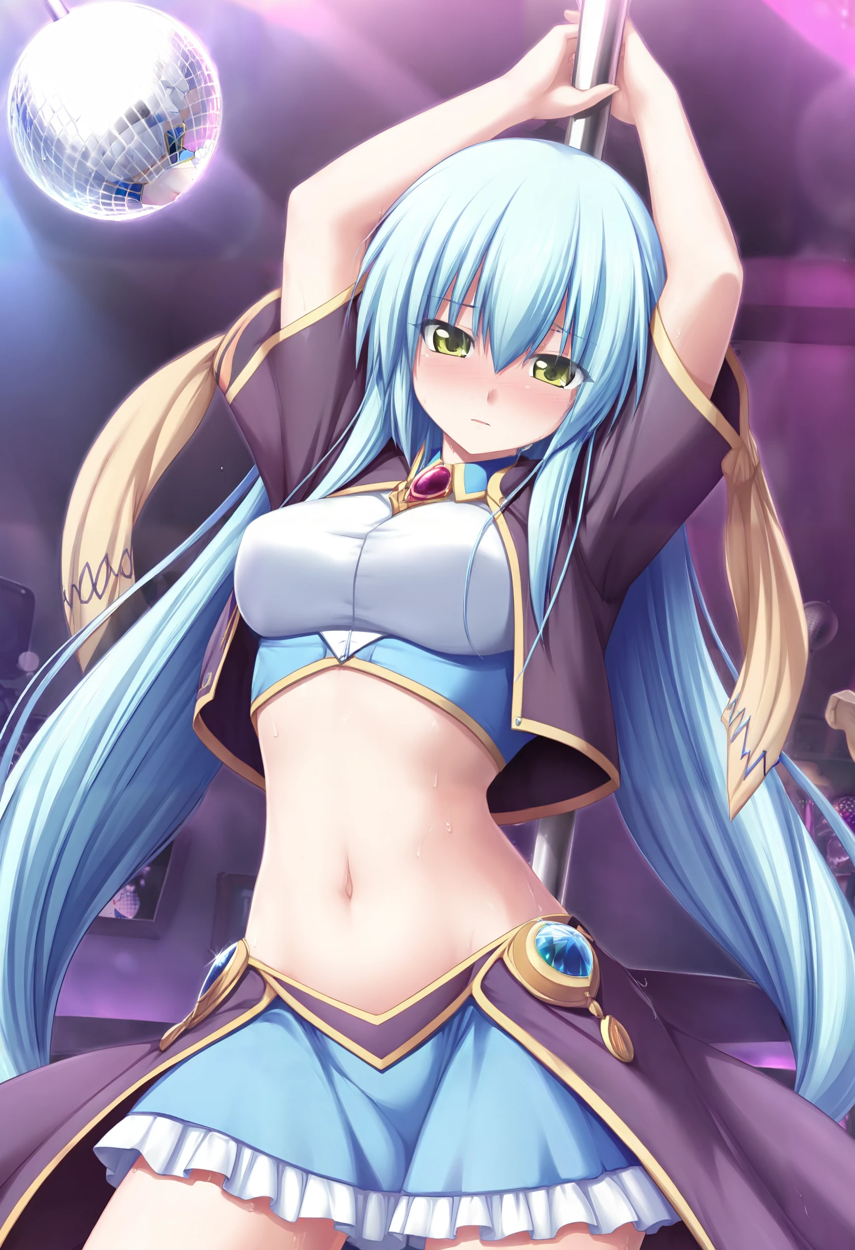 full faint blue body armor, faint blue armored skirtthighhighs, toeless legwear, twintails, default bikini