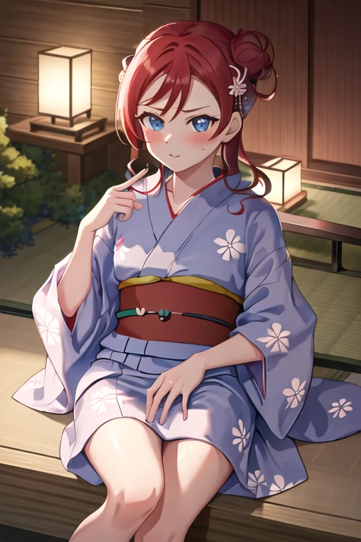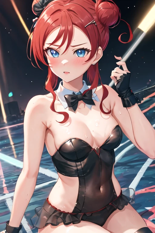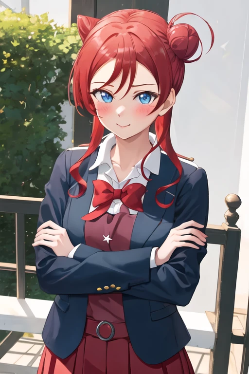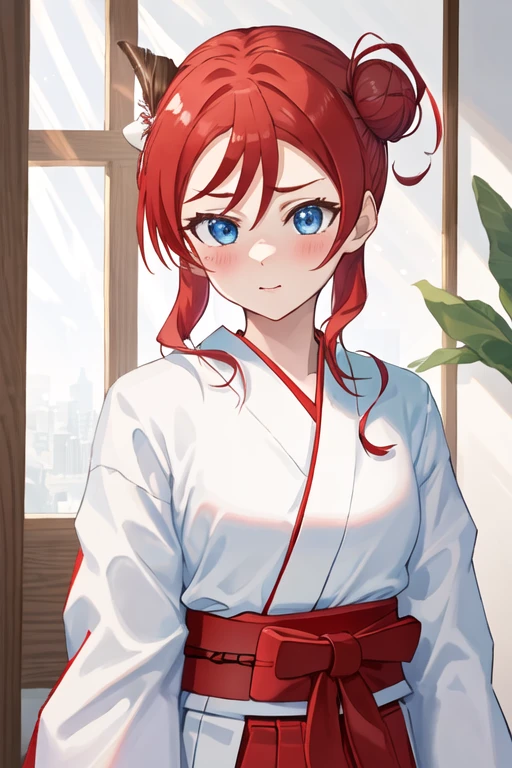 blue_eyes, red_hair, bangs, hair_bun, blush, single_hair_bun