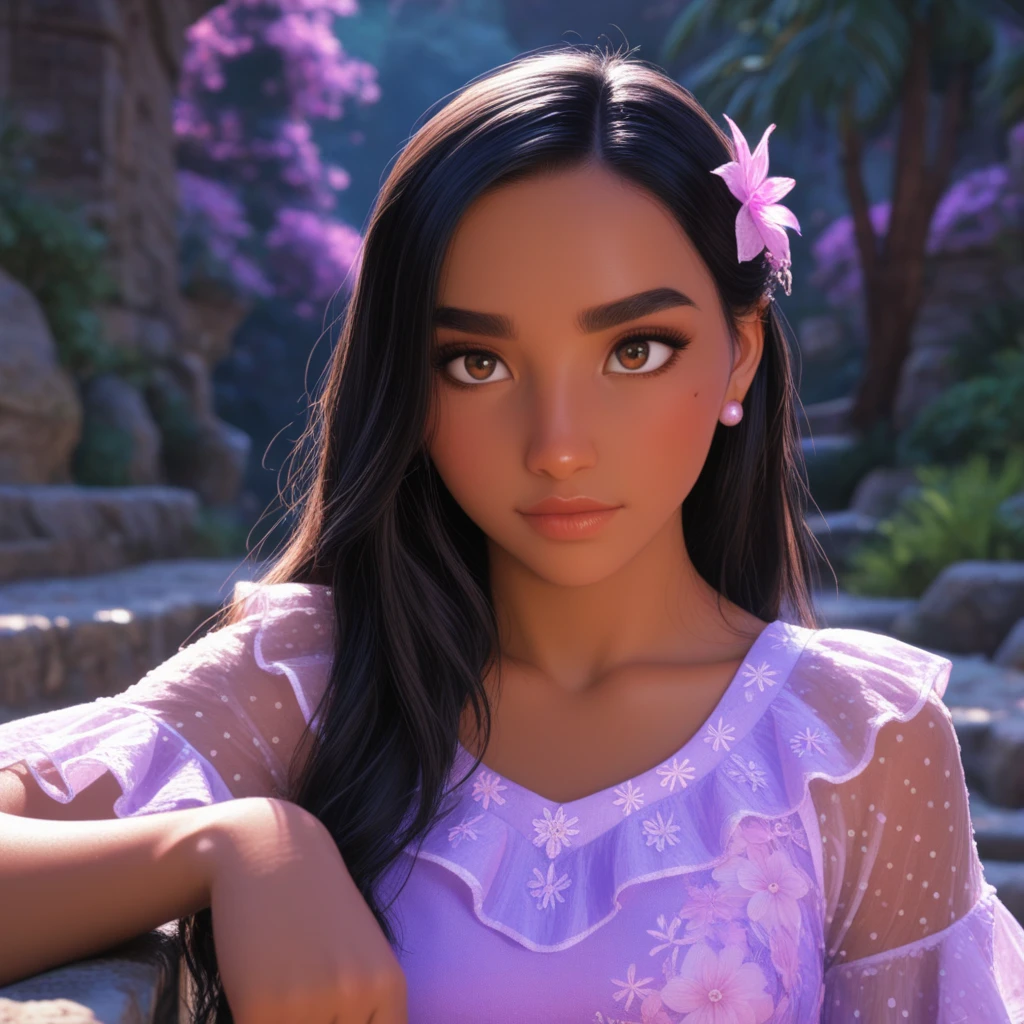 1girl, isabelae, long hair, black hair, brown eyes, dark-skinned female, purple dress, floral print, hair ornament,