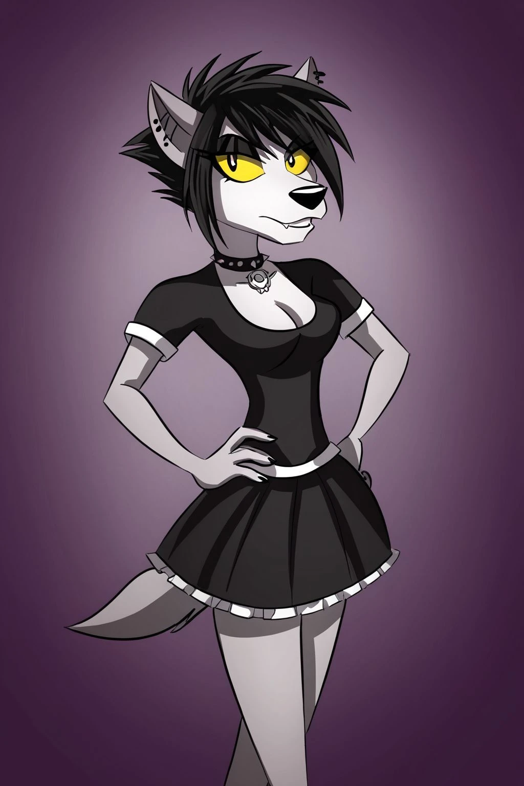 volchitsa-goth, wolf, anthro, black nose, black hair, yellow sclera,
