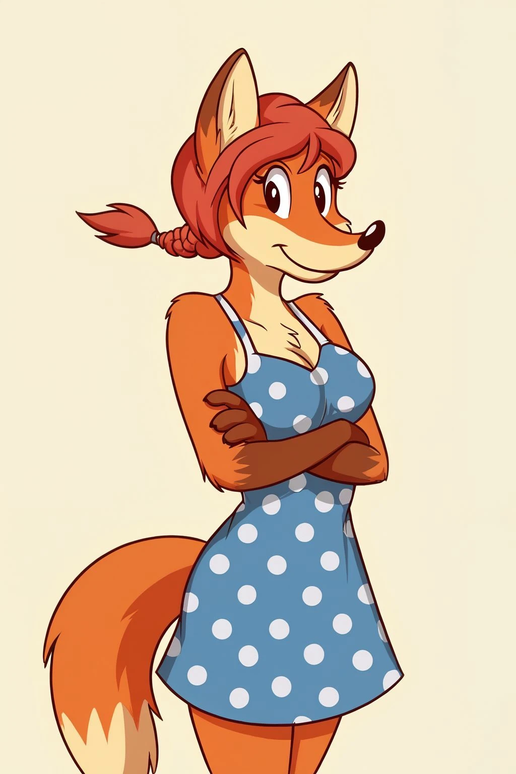 lisichka, anthro, fox, red hair, orange body, black nose, round nose, long snout, single braid,