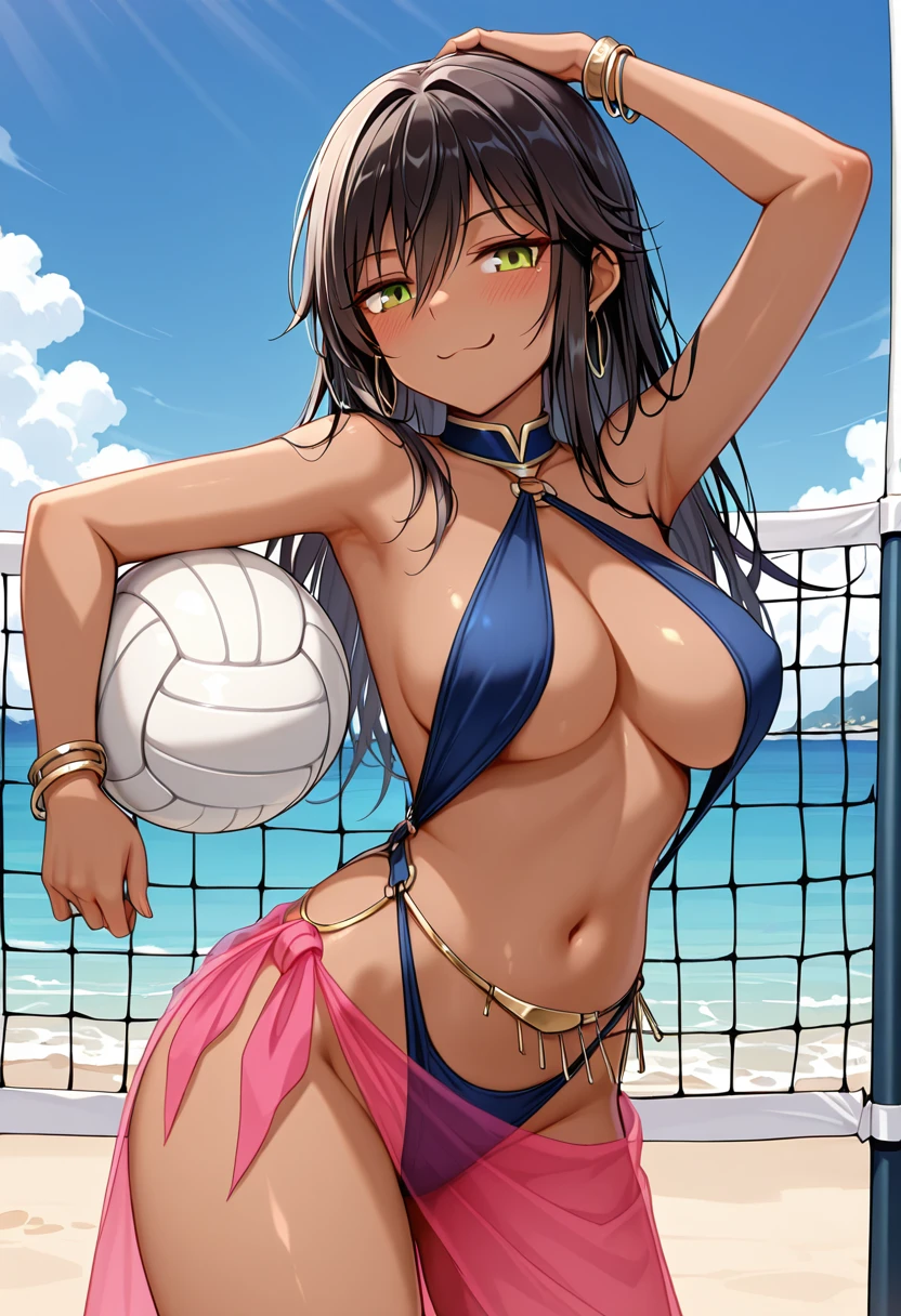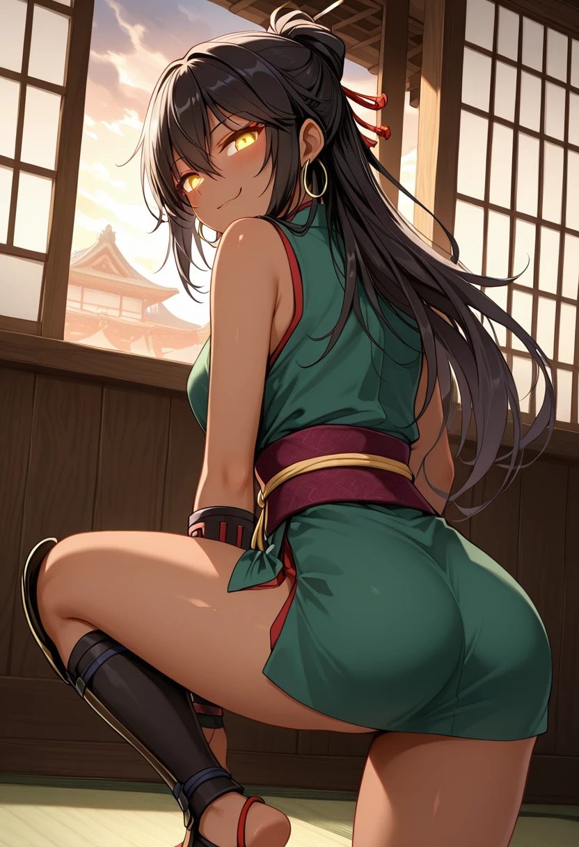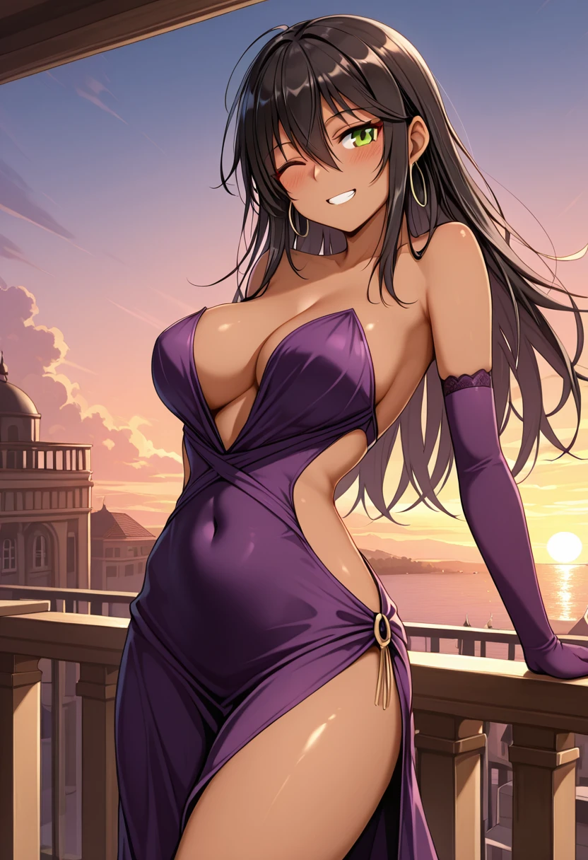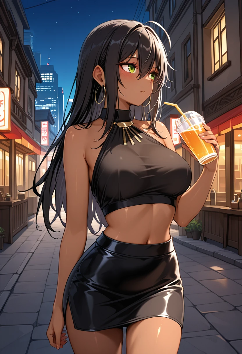 AiriLilitales, dark-skinned female, black hair, long hair, bangs, green eyes, hoop earrings,