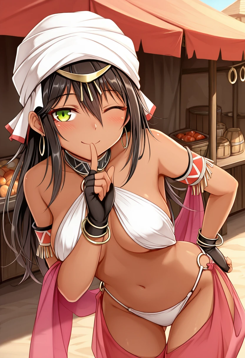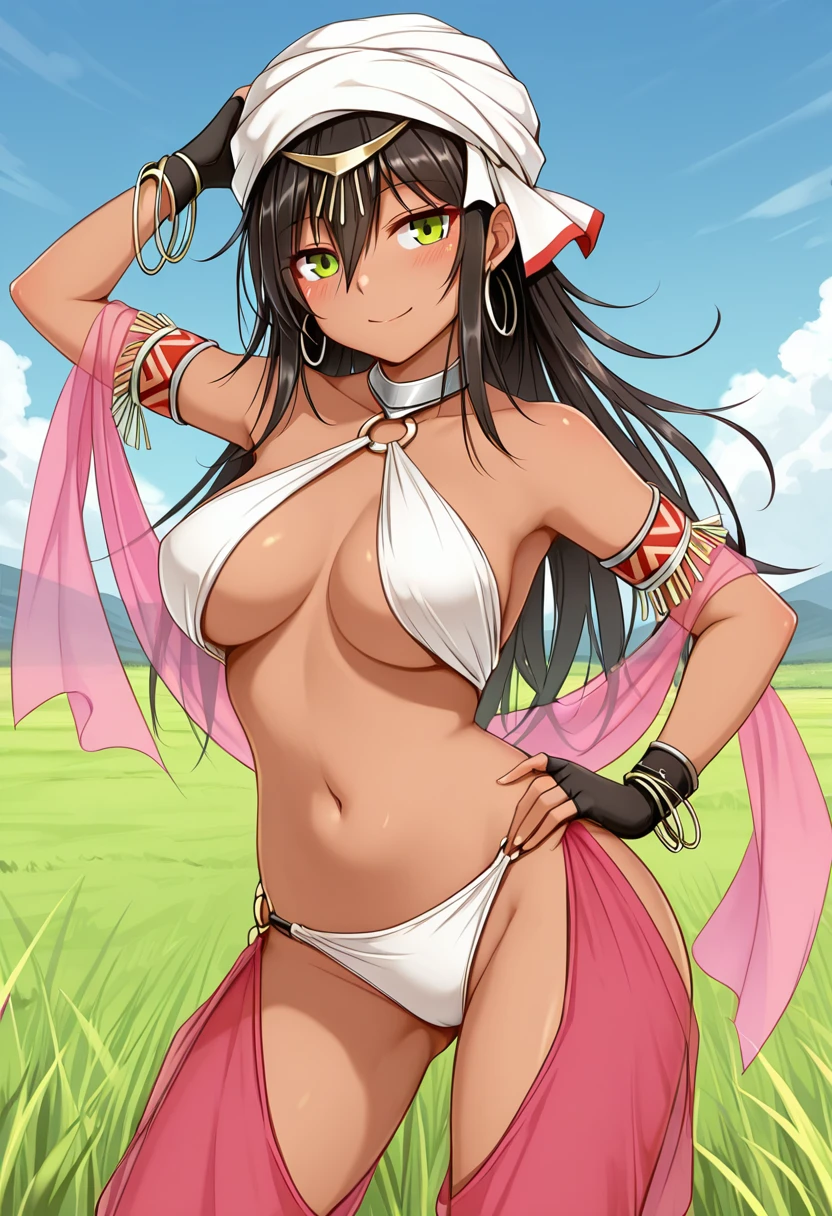 Trigger Words (Outfit): white turban, harem outfit, halterneck, o-ring, white bikini top, armlet, bracelet, black gloves, fingerless gloves, white bikini bottom, pink shawl, harem pants, pink pants, see-through pants, brown footwear, toeless footwear,
