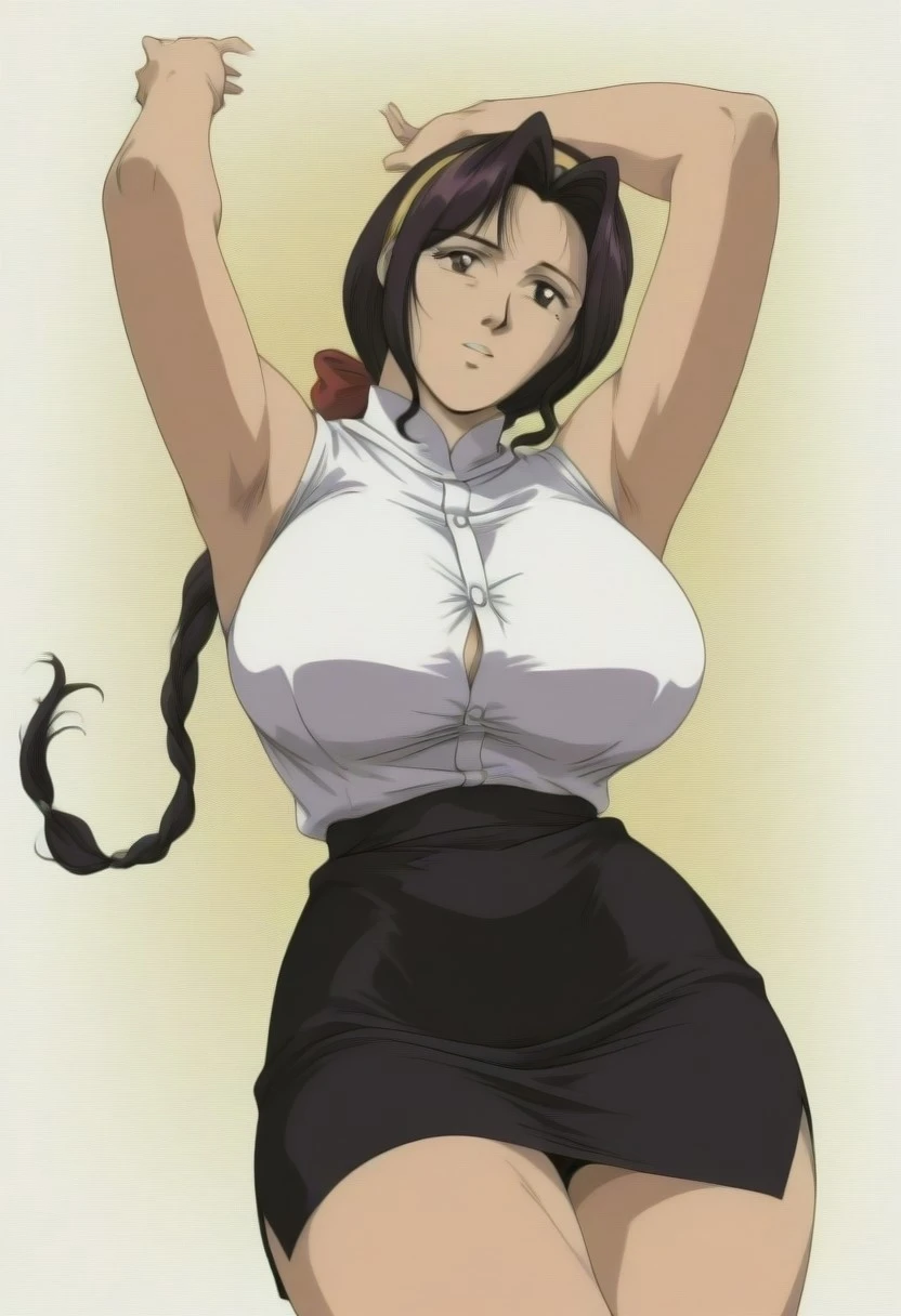 misako,solo,realistic mature anime woman 40s, fit sturdy curvy body, voluptuous very large sagging breasts, realistic aging signs, slim buxom body,smooth slim muscle limbs, full curvy yet soft, aged sagging side belly with soft smooth invisible abs, aged abdominal skin, magnificent hips, beautiful and maternal figure, realistic 1:7 body ratio, oval anime face, dark brown eyes, thick eyelashes, single mole under left eye, very long braided violet black hair with center part, tied with large red ribbon and yellow headband. 2000s adult OVA style, anime screencap, muted analog anime palette,muted solid colors palette, muted flat colors palette, desaturated tones, 3-tone shadows,no gradients, solid shadows, deep strong shadows,consistent lighting, heavy yellowish tint, deep yellow hue, golden tones, fair bright skin with dark bronzed shading, VHS effect, grainy texture,high contrast, dramatic shading,ultra-detailed OVA anime, 2D retro color, low gloss,(yellowish dim light:1.8), realistic anime artstyle, mature design character, OVA Another Lady Innocent style, inspired Ova Perfect Blue artstyle, clean sharp lineart, clean painting color,solid skin shadows,fully cel-shaded image.