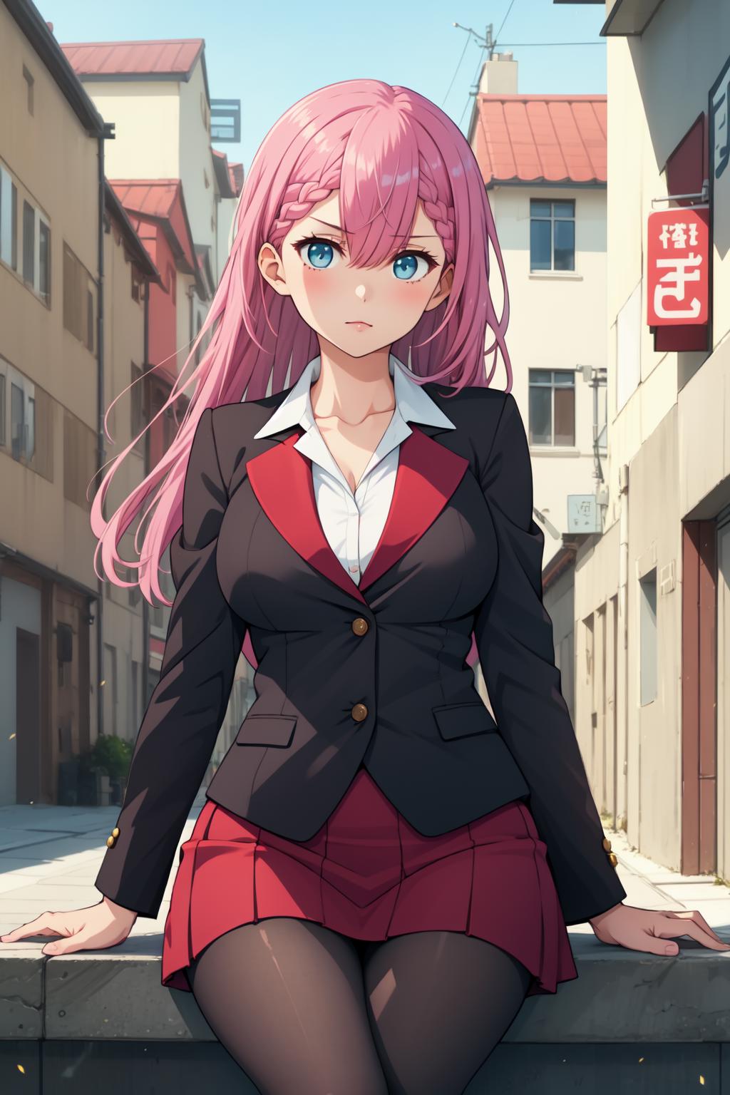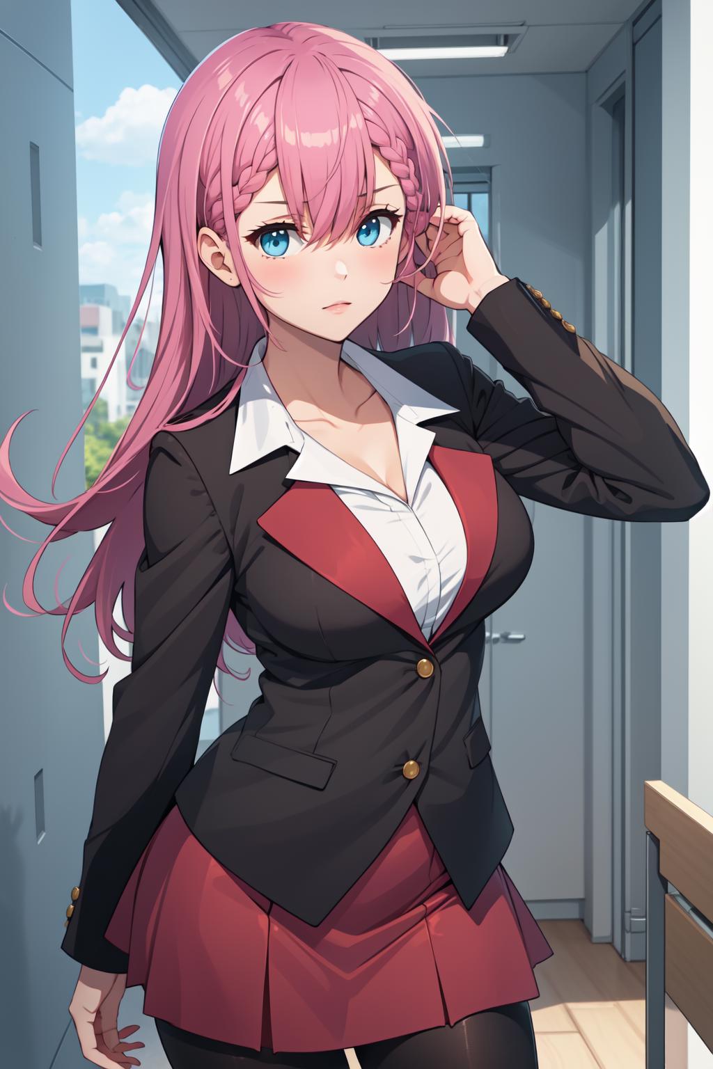 mafuyu1, 1girl, solo, long hair, pink hair, blue eyes, red skirt, jacket, hair between eyes, braid, skirt suit, long sleeves, black pantyhose, white shirt, brown pantyhose, collarbone, large breasts