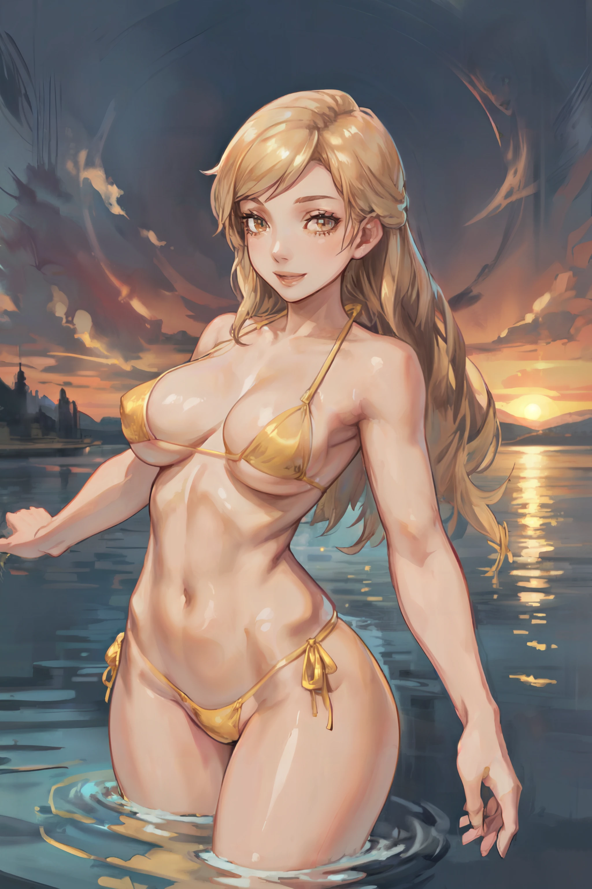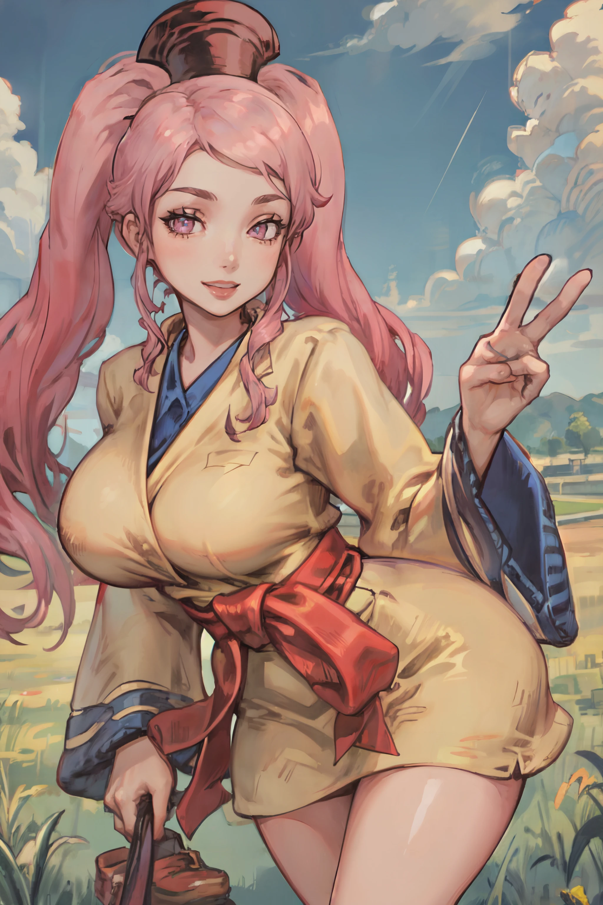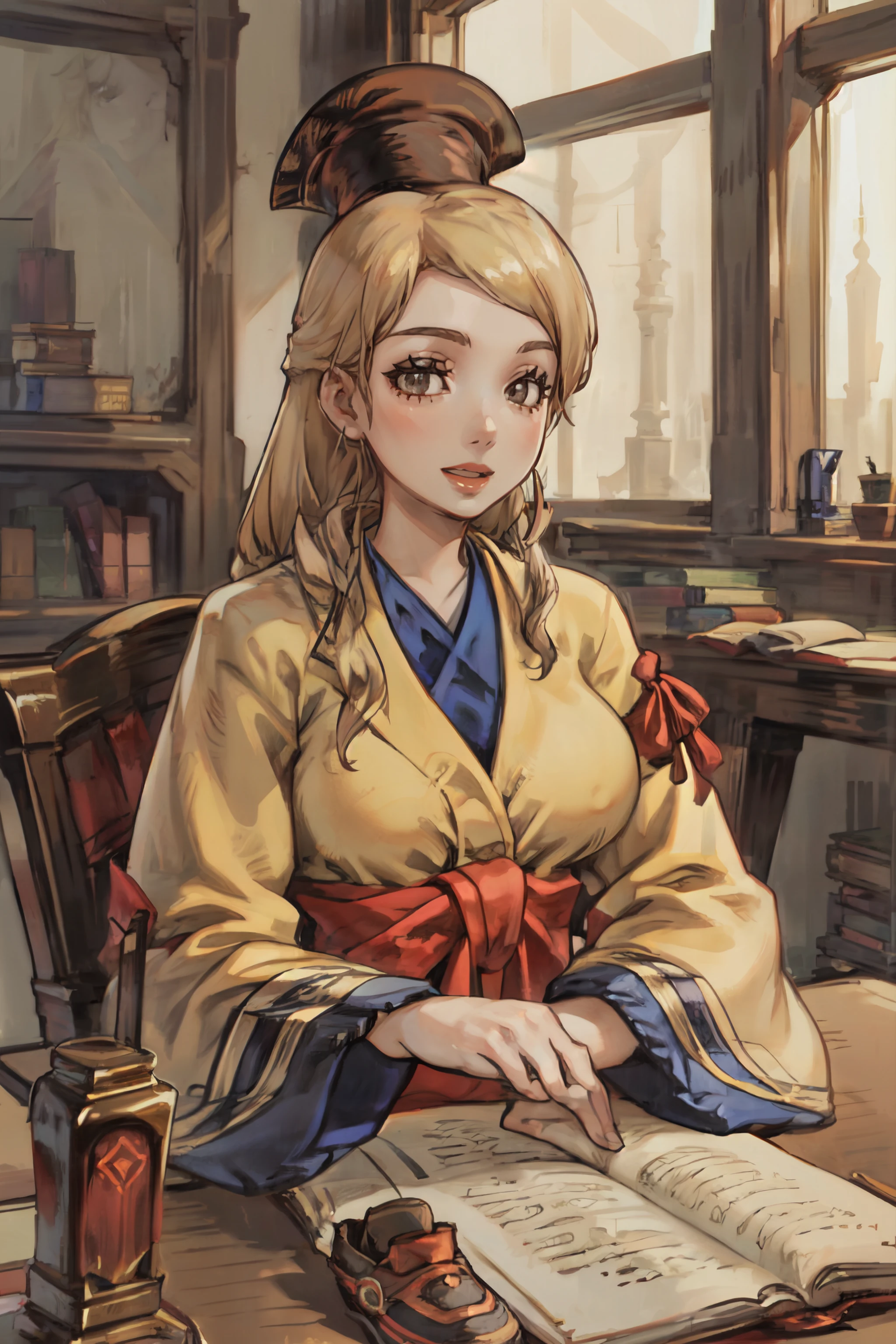 Default Outfit: MysticFFT, long hair, blonde hair, brown eyes, hat, yellow korean clothes, long sleeves, wide sleeves, red sash, shoes,